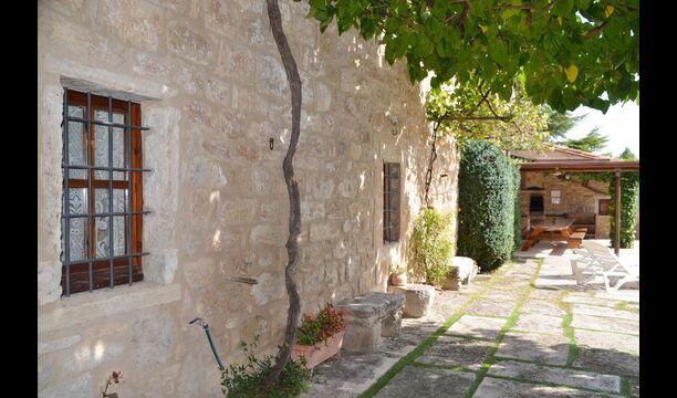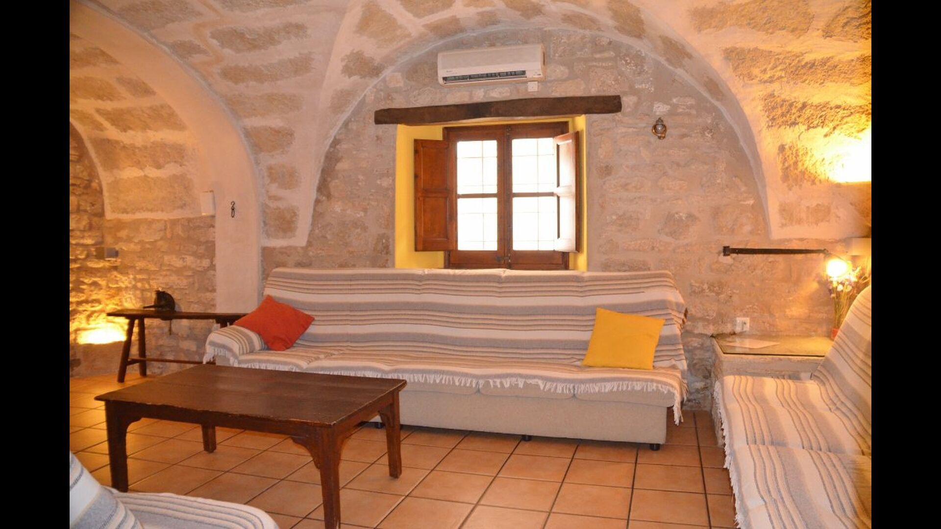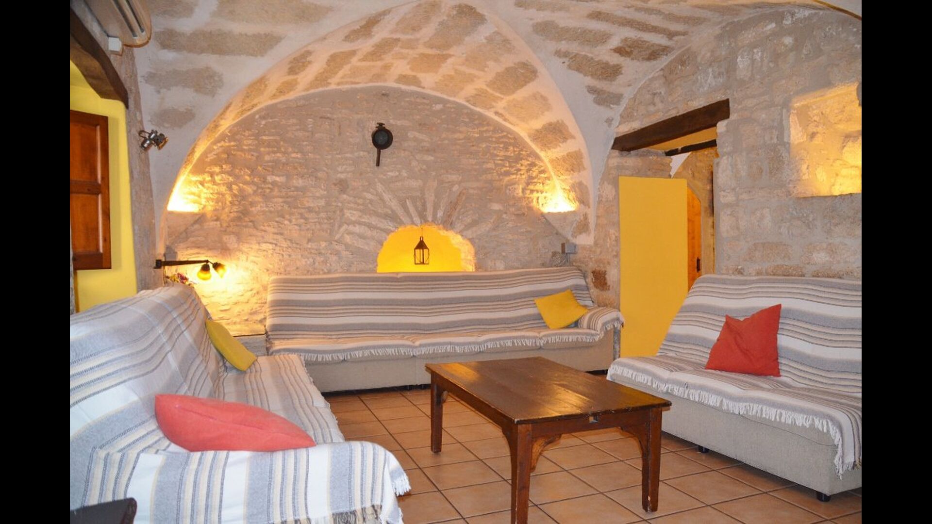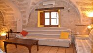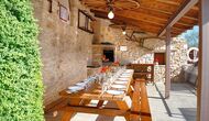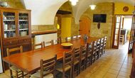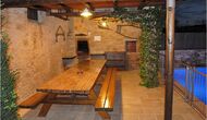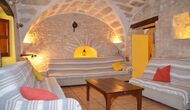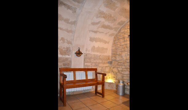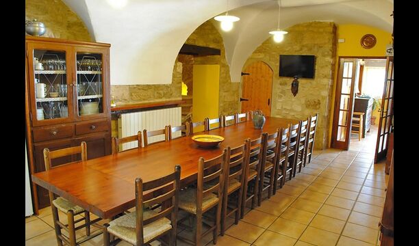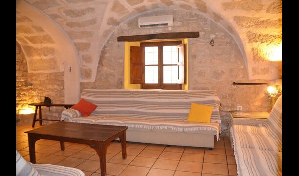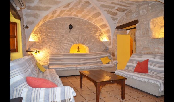 Al lado del comedor, hay una acogedora sala de relajación con cómodos sofás. También hay una pequeña sala de juegos en este piso con futbolín y tenis de mesa. La casa tiene hermosos muros de piedra con un hermoso techo arqueado.