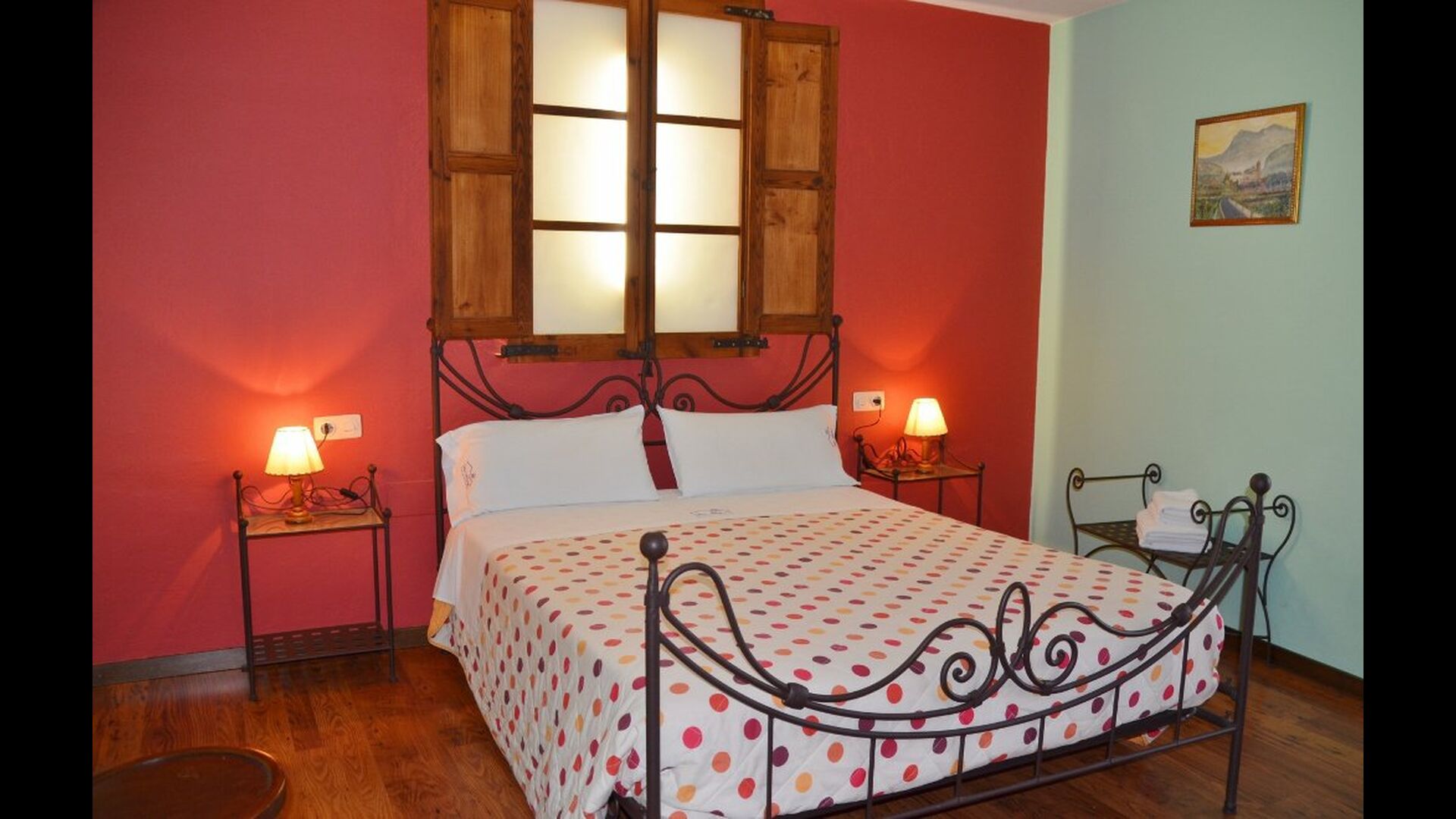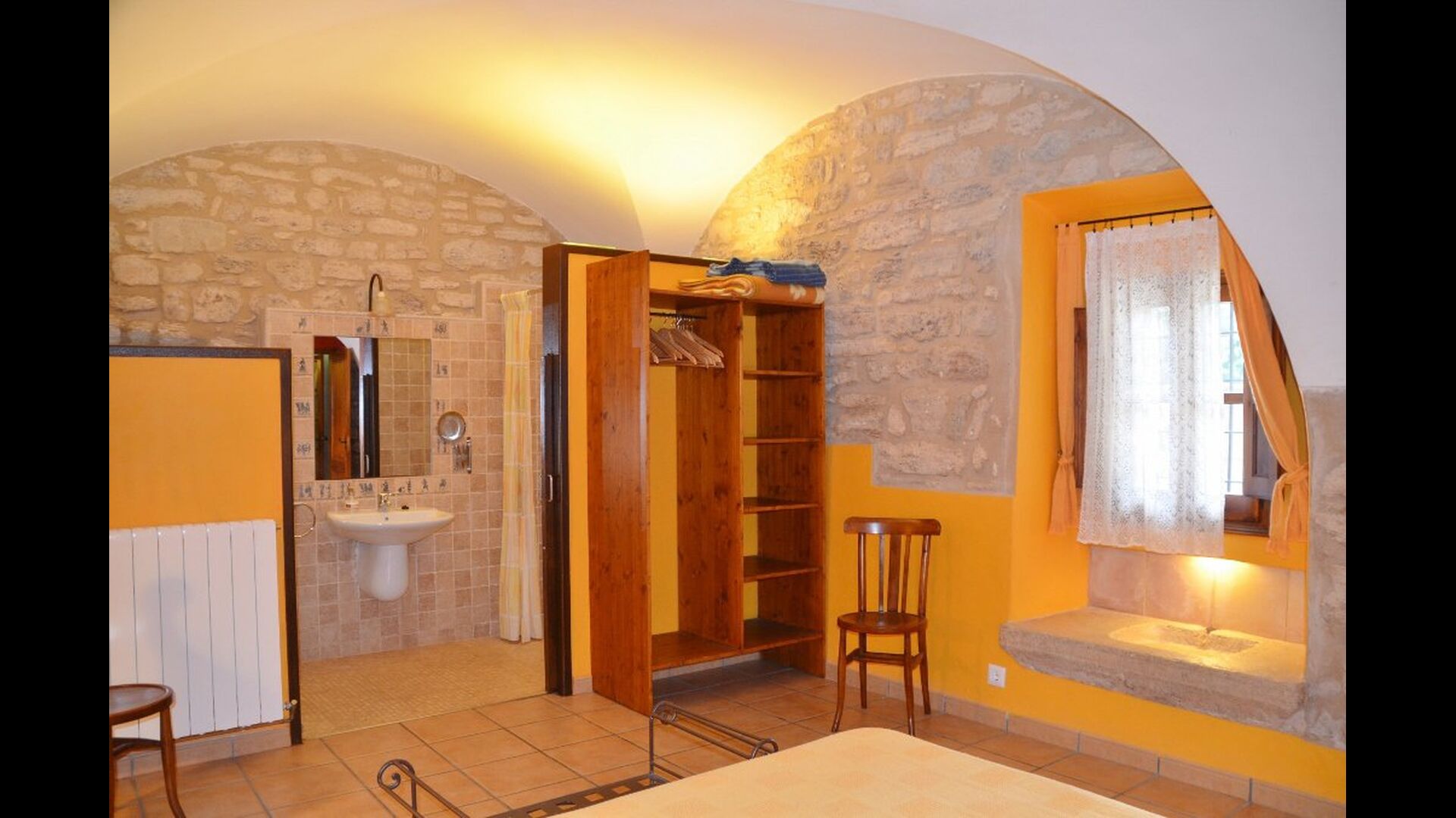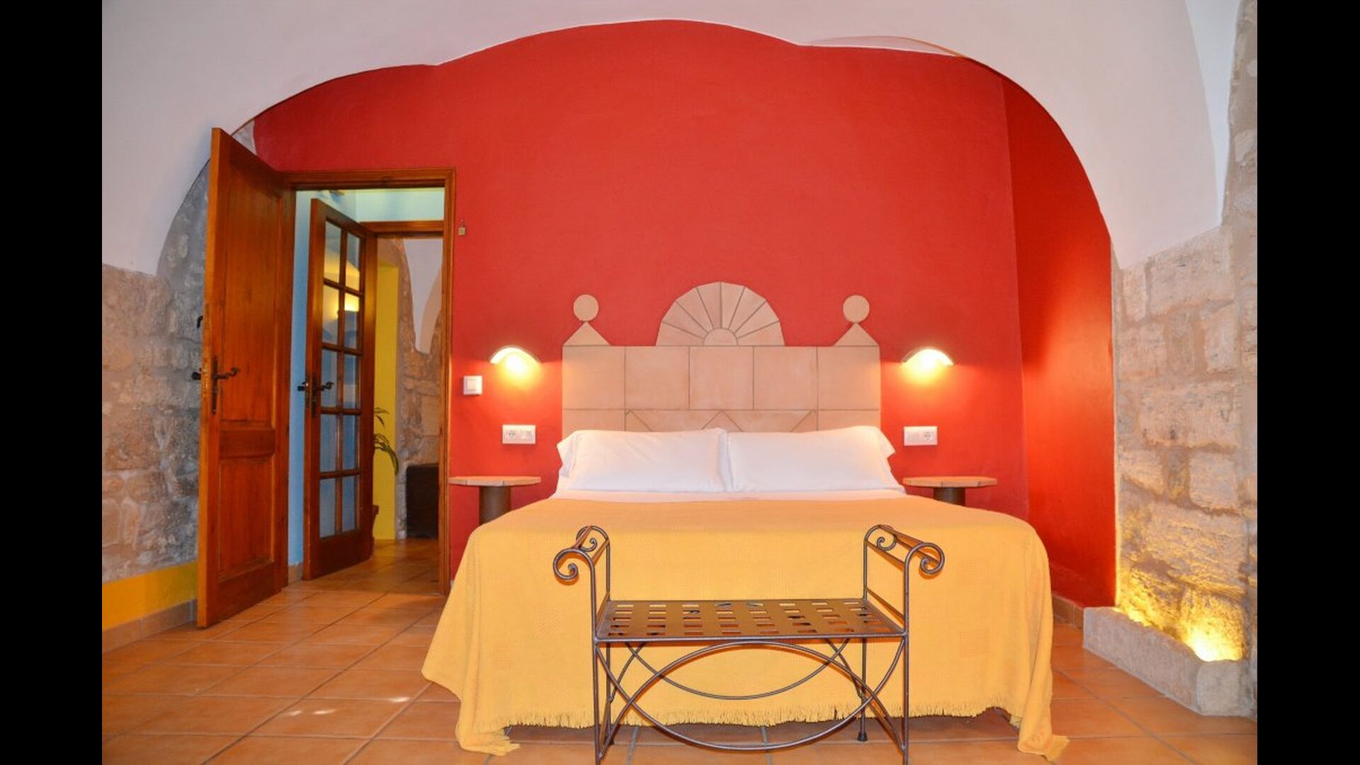 Hay una habitación grande y espaciosa en la entrada en el piso inferior, una habitación de nivel ajustado con baño en suite (accesible para sillas de ruedas). En el segundo piso, encontrará las otras siete habitaciones dobles. Las habitaciones están decoradas con colores vivos y varias de ellas tienen vigas en el techo. Hay 6 baños.