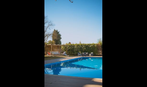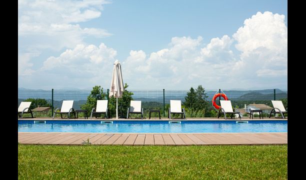 A més, la part posterior de la casa es va convertir en la fantàstica zona de la piscina amb la gran piscina (17 x 5 metres), café taules, lavabos i vestidors, i racons ombrívols i llocs assolellats. La vista és impressionant, directament als Pirineus.