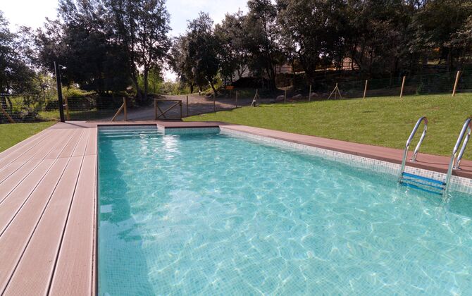 Just a sota de la casa, hi ha la bonica zona de la piscina, perfecta per a nens de totes les edats. Un nivell per sota de la zona de la piscina, hi ha una gran gespa on hi ha l’oportunitat de jugar a futbol, voleibol, bàdminton o bàsquet.