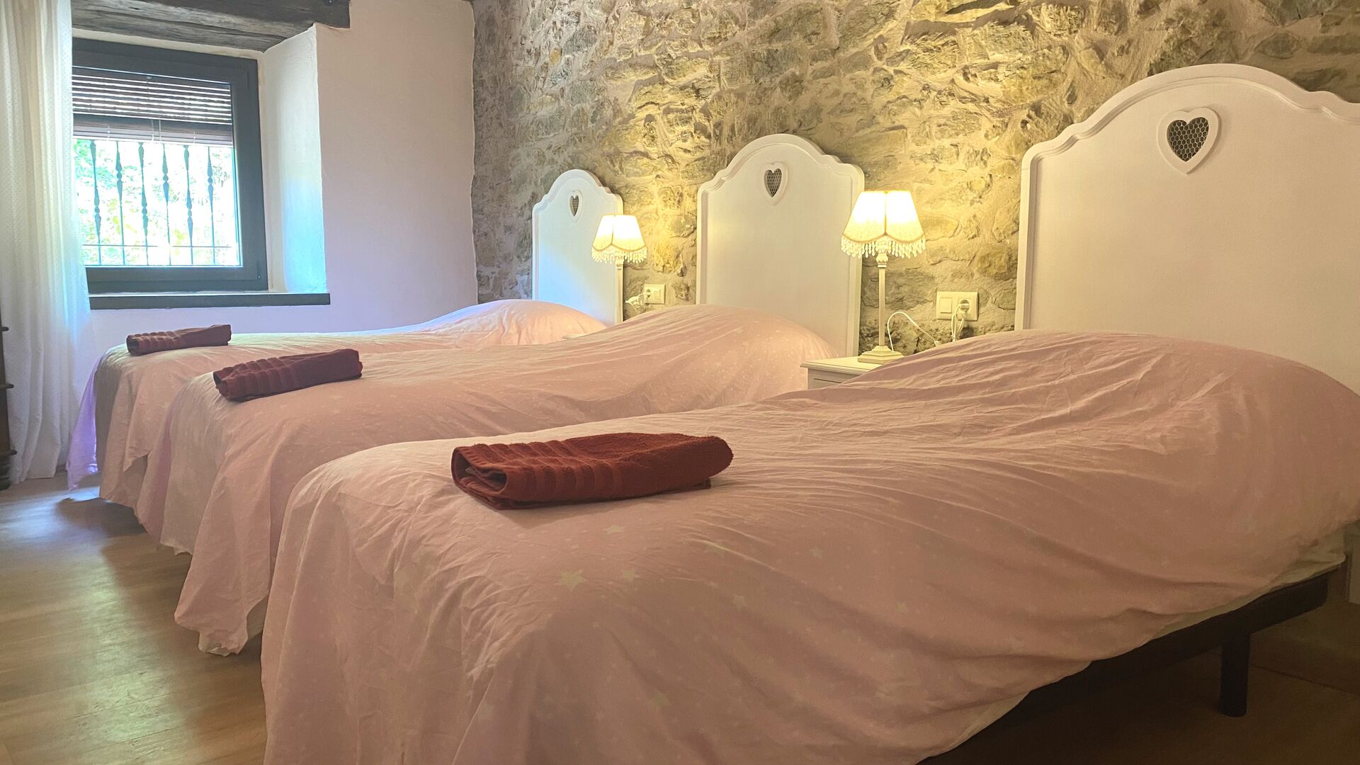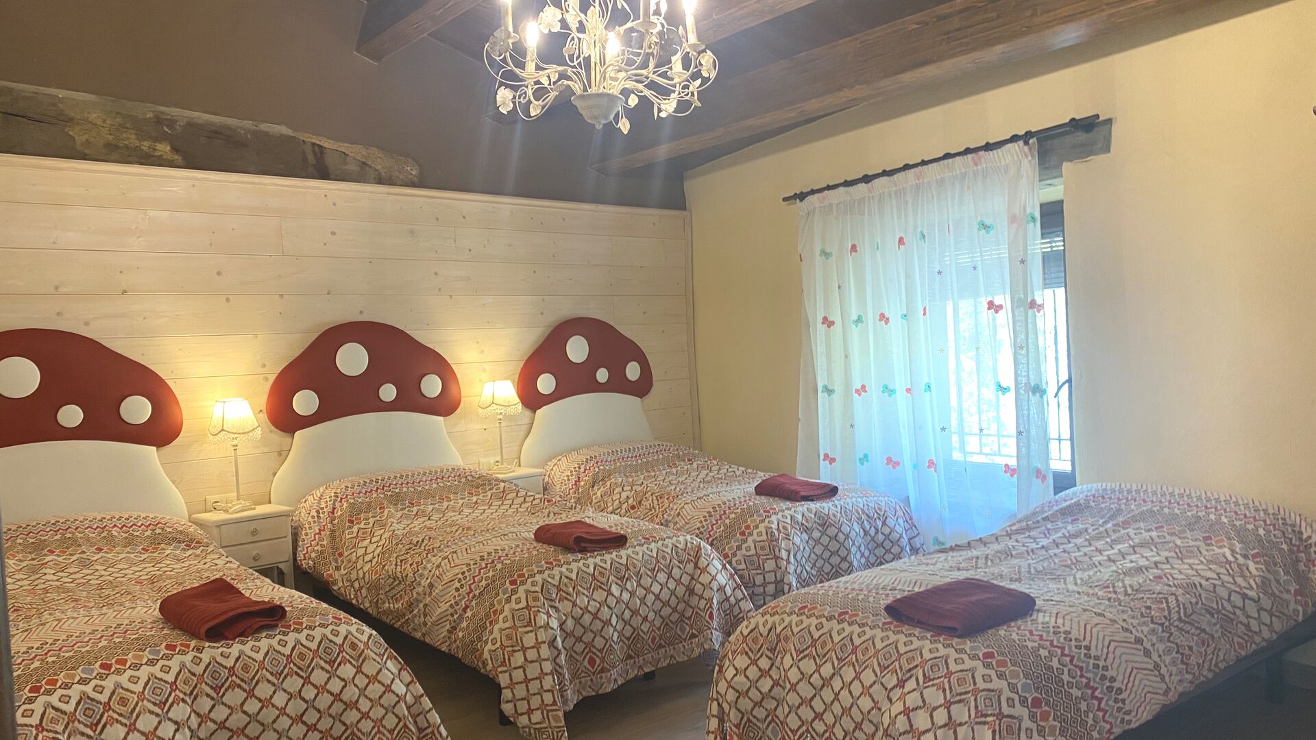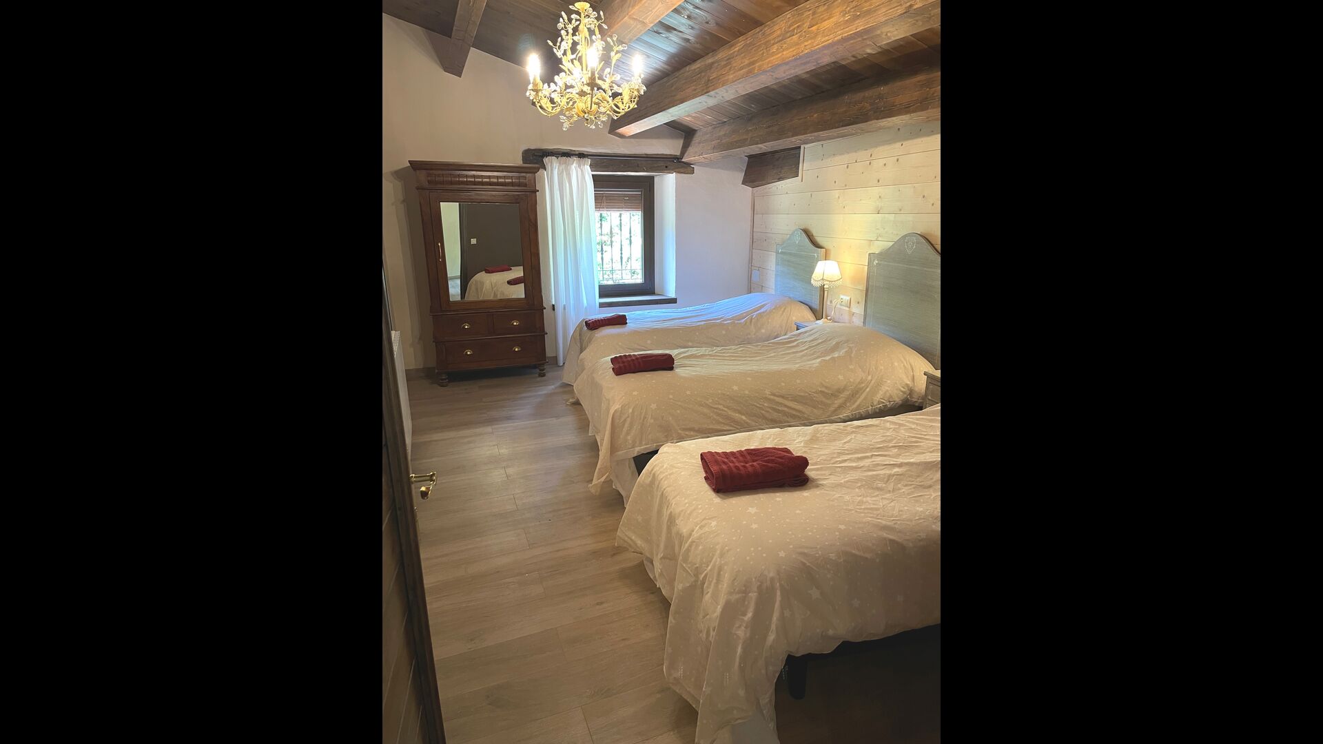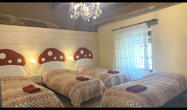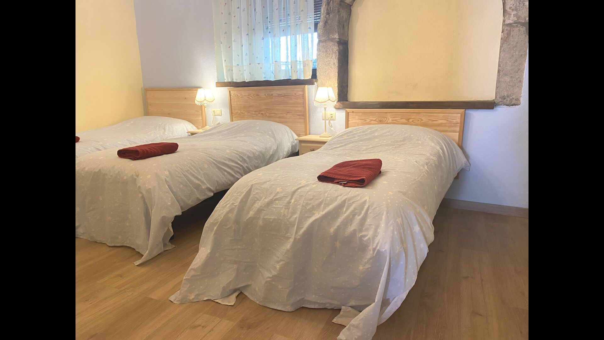 A més, aquí al primer pis hi ha2 habitacions triples (3 llits individuals) i 1 habitació doble amb un llit de matrimoni. Totes tenen bany privat, dos amb dutxa i un amb banyera. Finalment, a la zona comuna, hi ha un enorme sofà amb capacitat per a un mínim de 15 persones, i un televisor d'una mida igual.