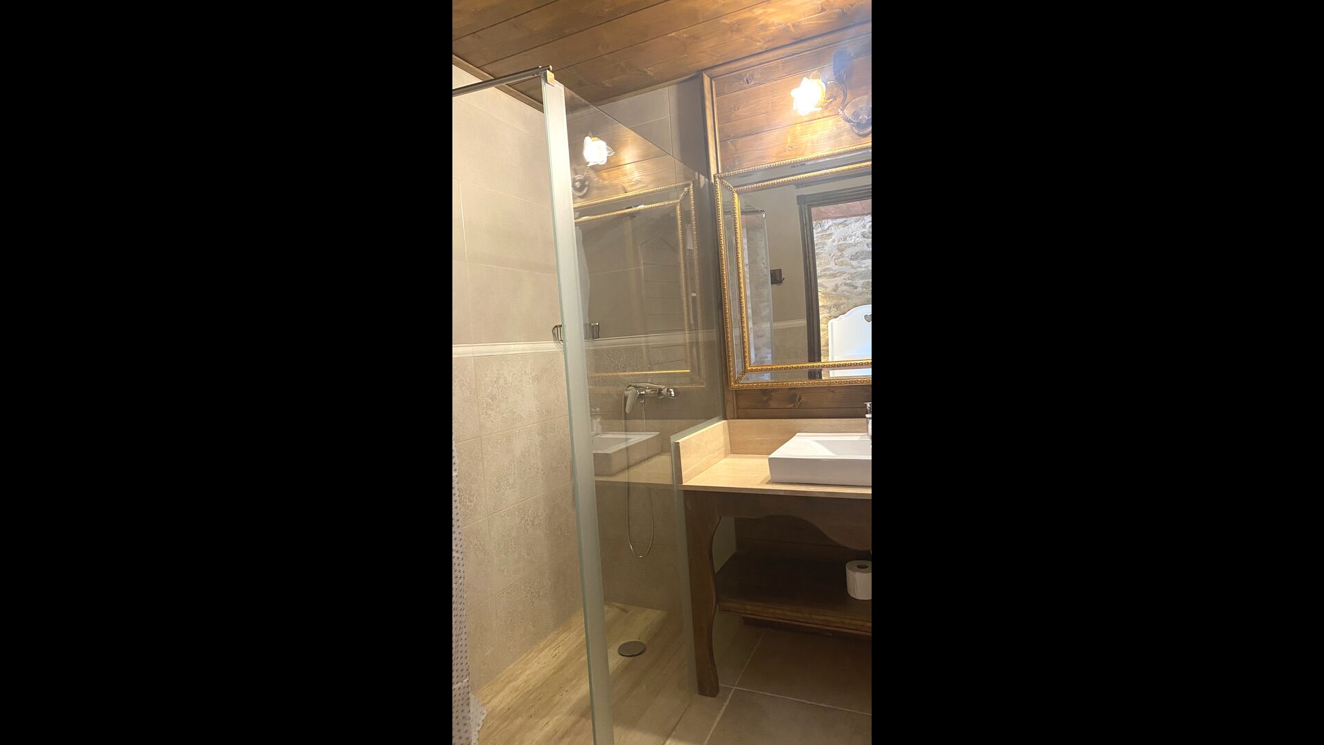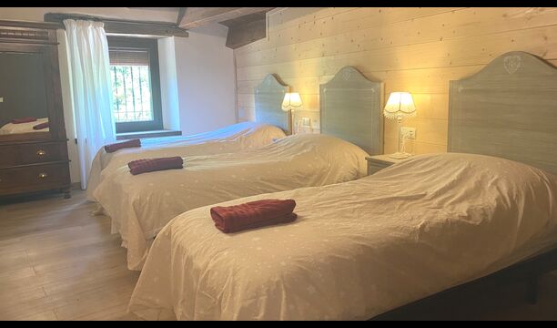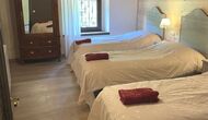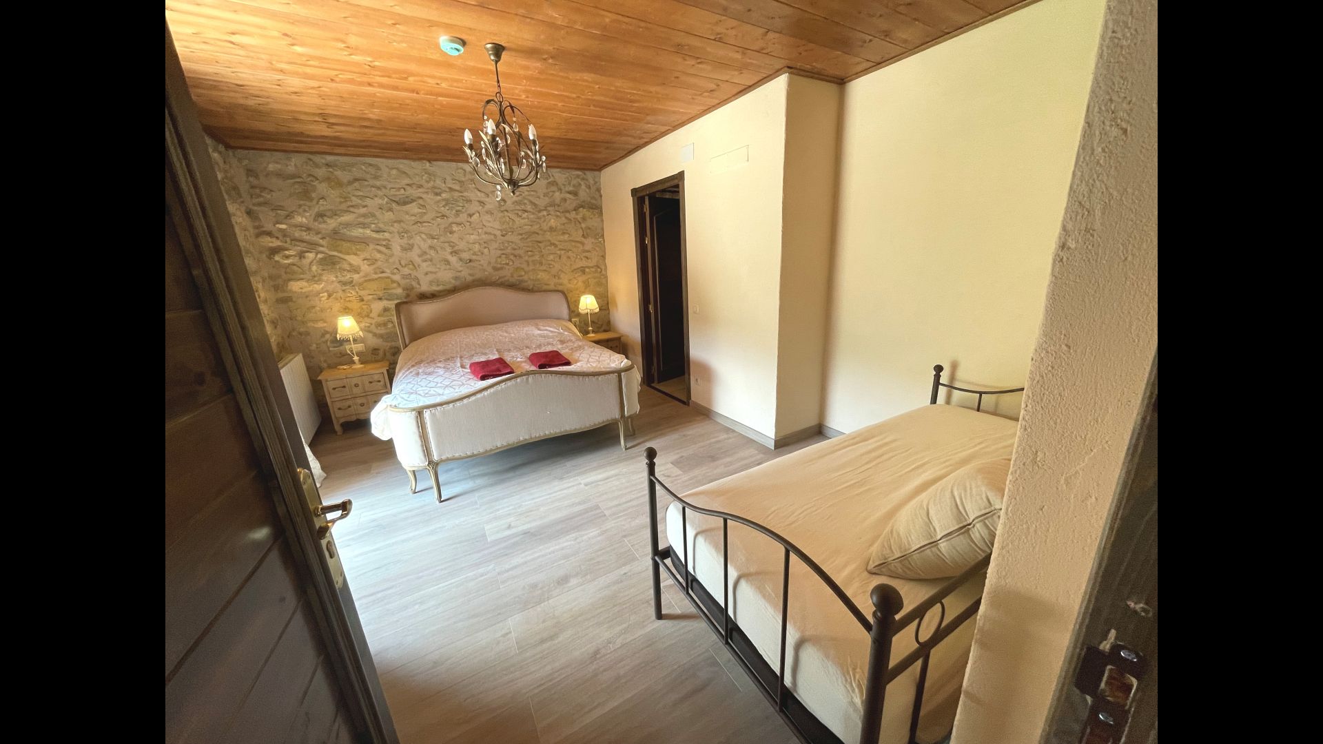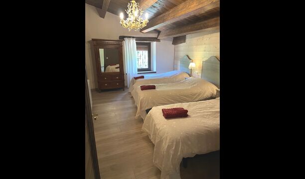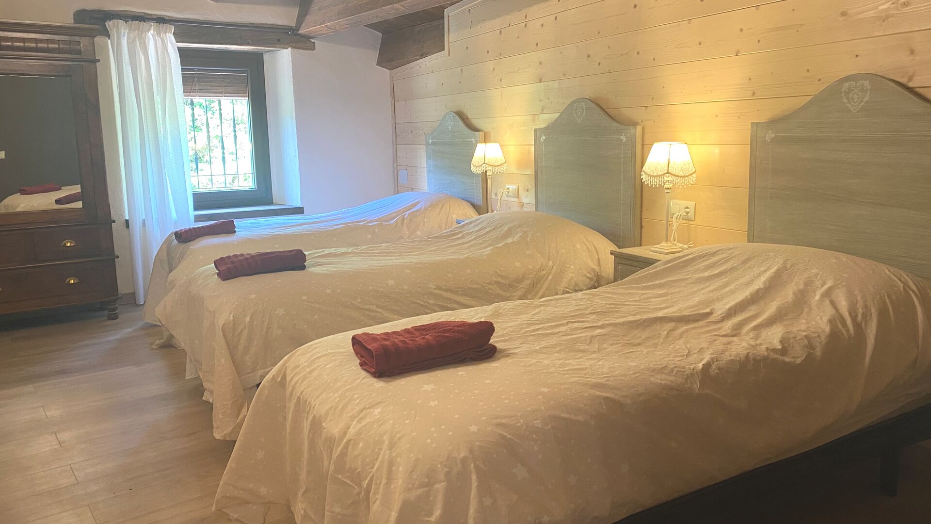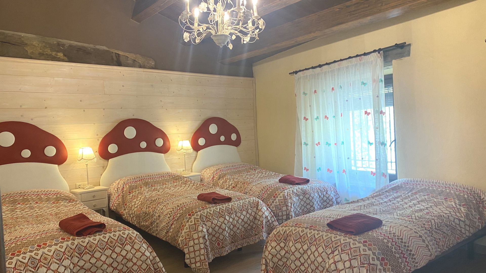 A més, aquí al primer pis hi ha2 habitacions triples (3 llits individuals) i 1 habitació doble amb un llit de matrimoni. Totes tenen bany privat, dos amb dutxa i un amb banyera. Finalment, a la zona comuna, hi ha un enorme sofà amb capacitat per a un mínim de 15 persones, i un televisor d'una mida igual.