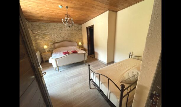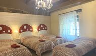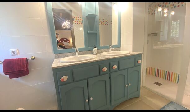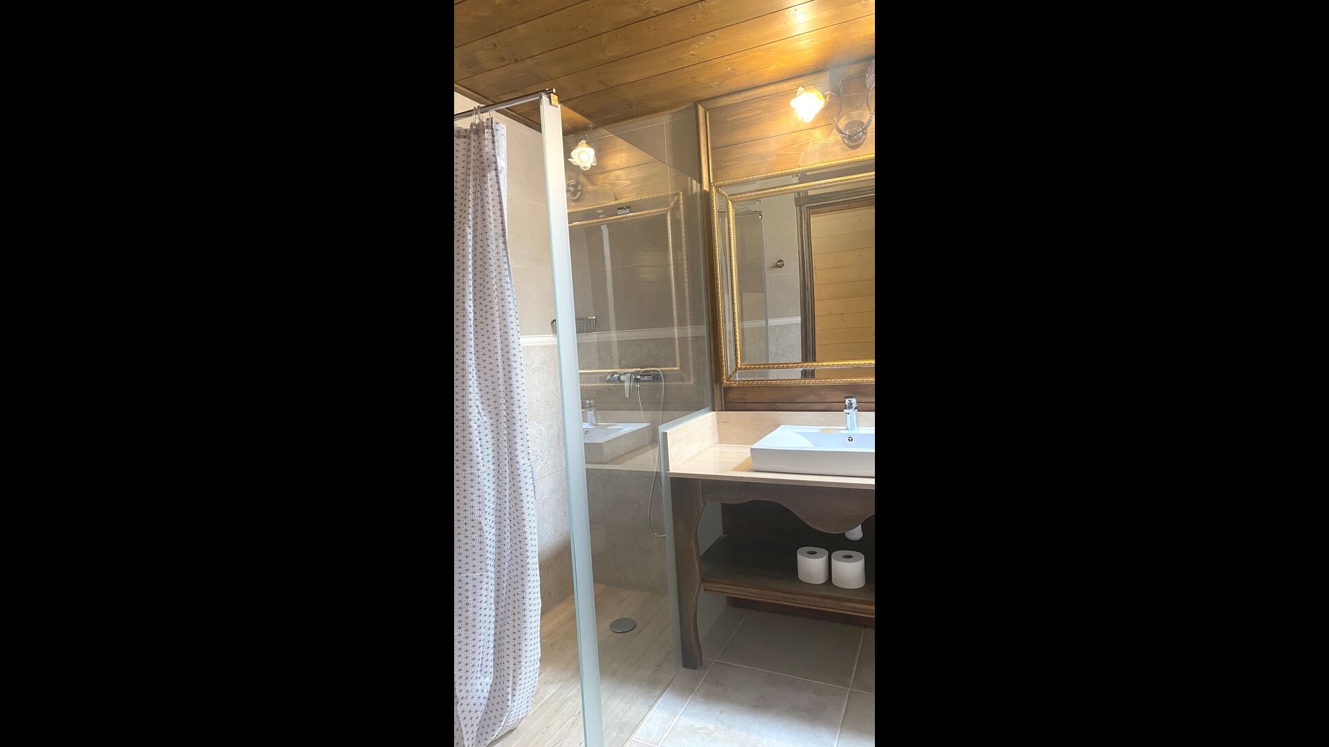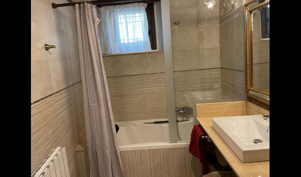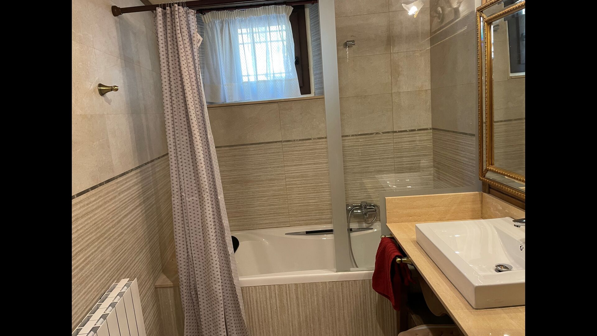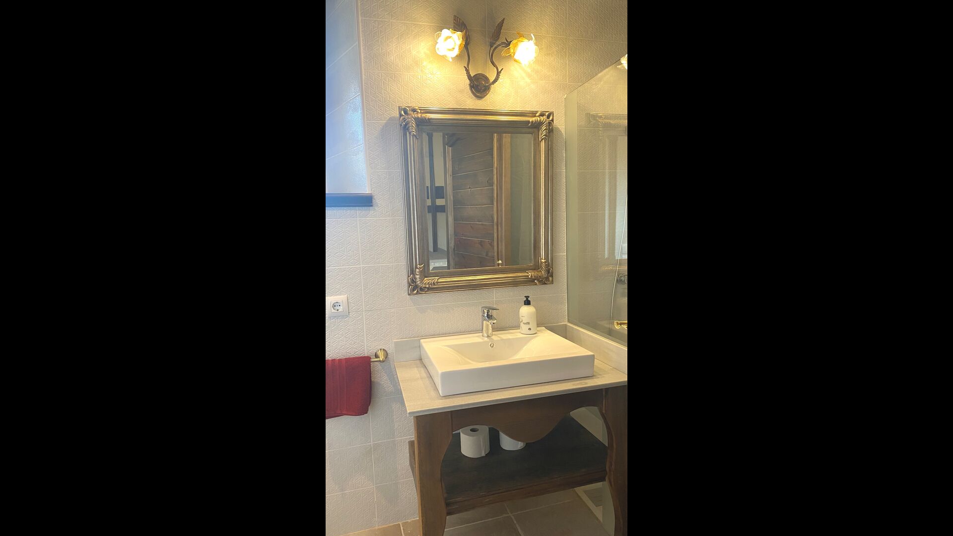 A més, aquí al primer pis hi ha2 habitacions triples (3 llits individuals) i 1 habitació doble amb un llit de matrimoni. Totes tenen bany privat, dos amb dutxa i un amb banyera. Finalment, a la zona comuna, hi ha un enorme sofà amb capacitat per a un mínim de 15 persones, i un televisor d'una mida igual.