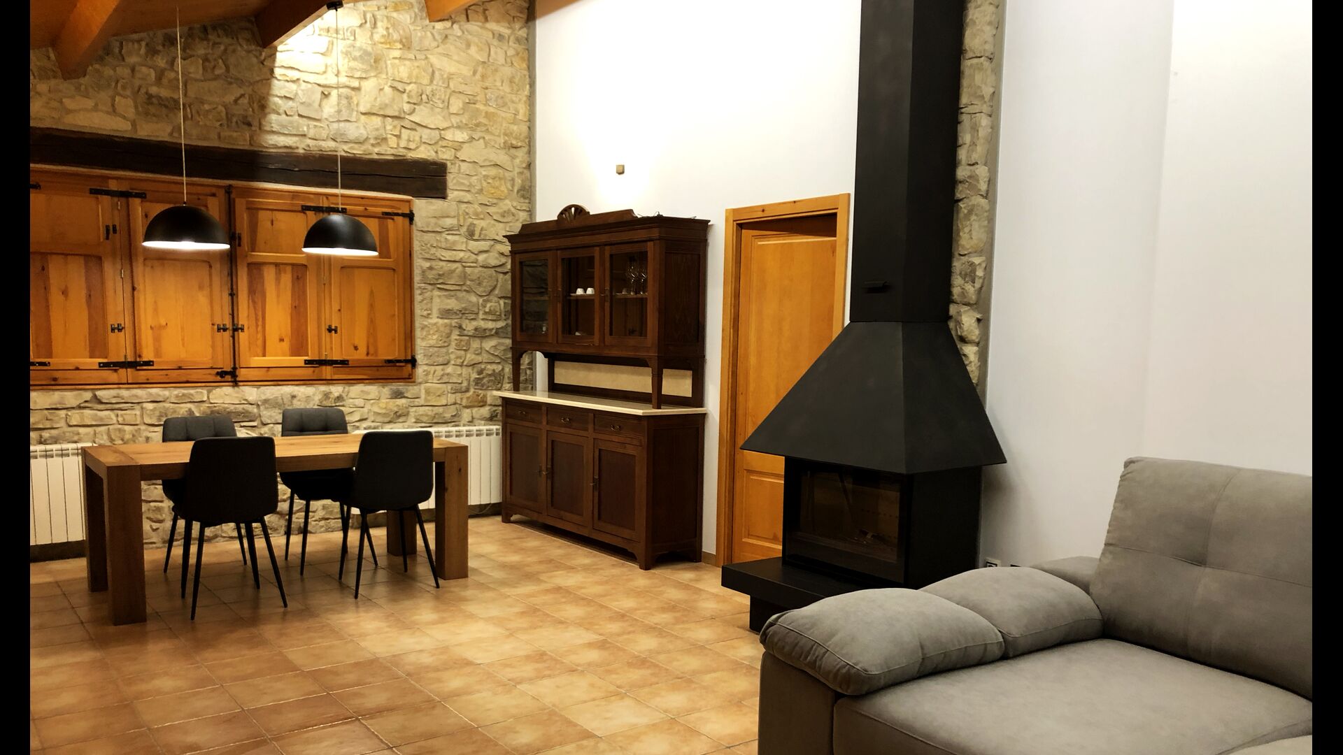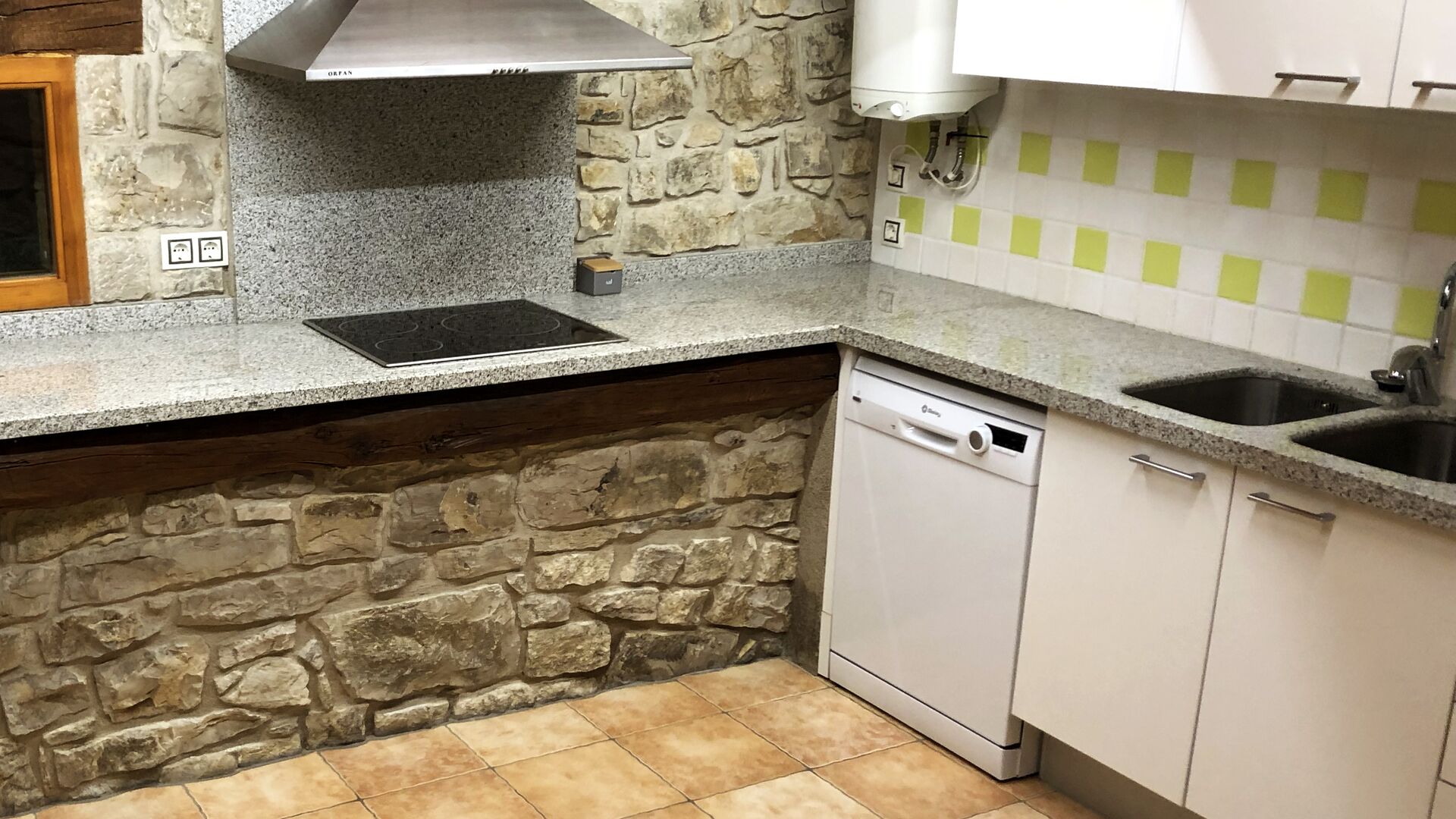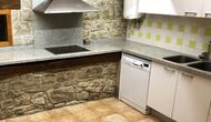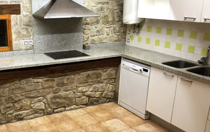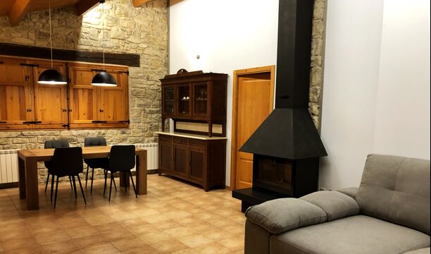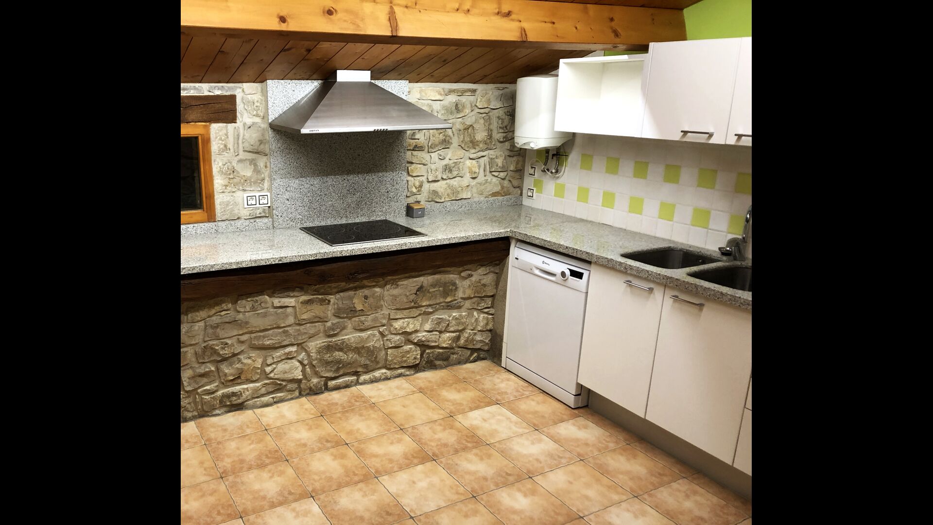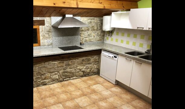 Entrareu a la sala comuna de la casa amb taula de menjador, sofà racó i una cuina totalment equipada amb fogons, forn, rentavaixelles i estris de cuina.