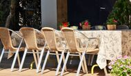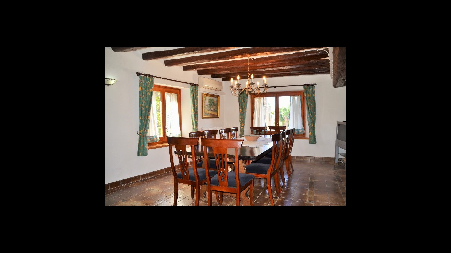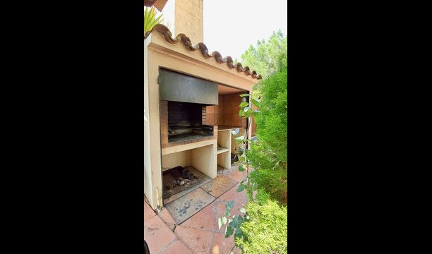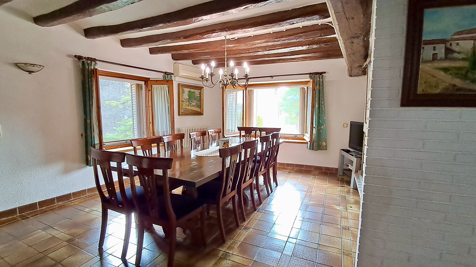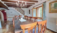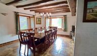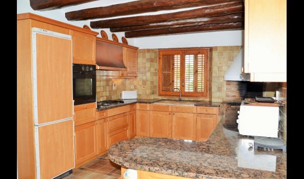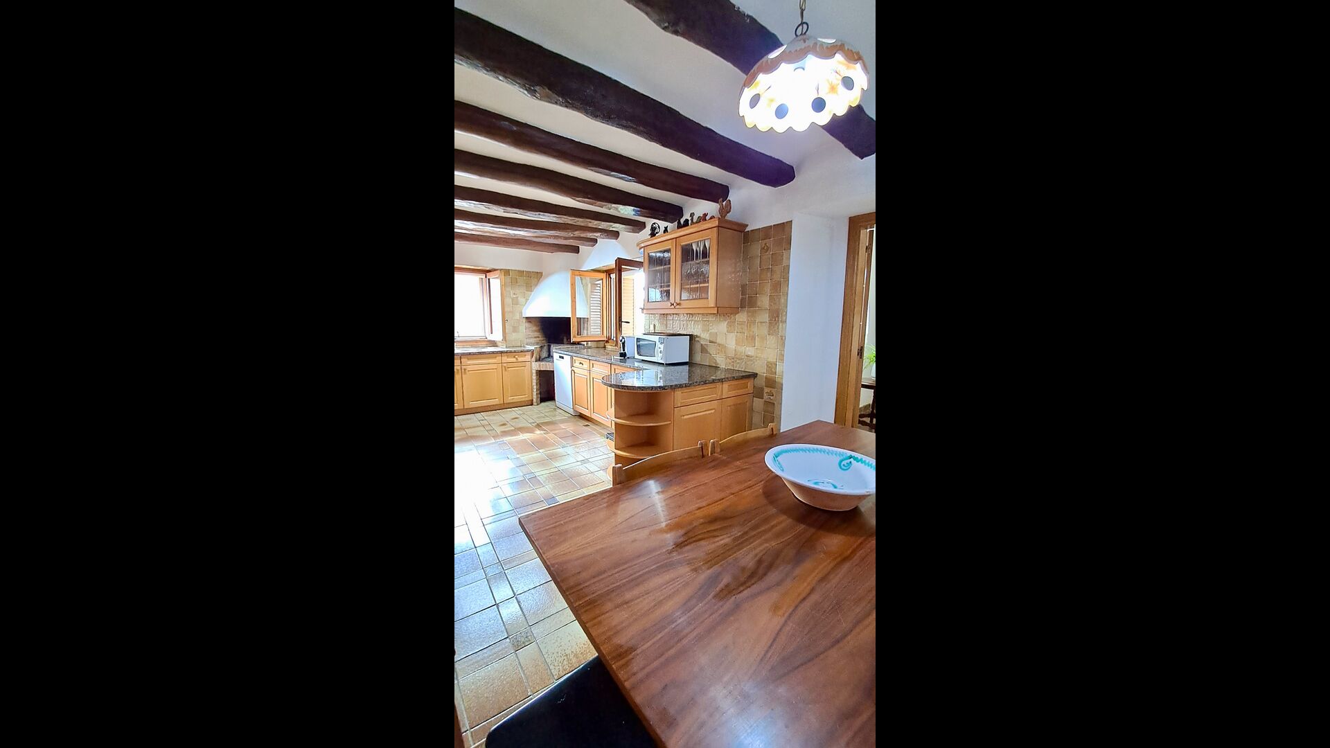 In the right part, the kitchen is nicely located, with a door to the garden to one side, and directly connected to the other side, a dining room with a big dining table. The classic-style kitchen is well-equipped with stove, hotplates, fridge, freezer, microwave etc. and also, an open barbecue makes it possible to prepare meat over open fire.