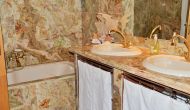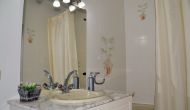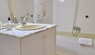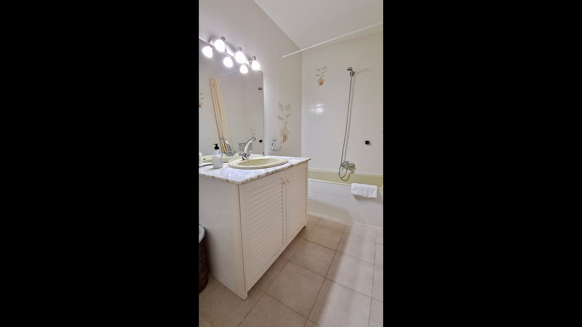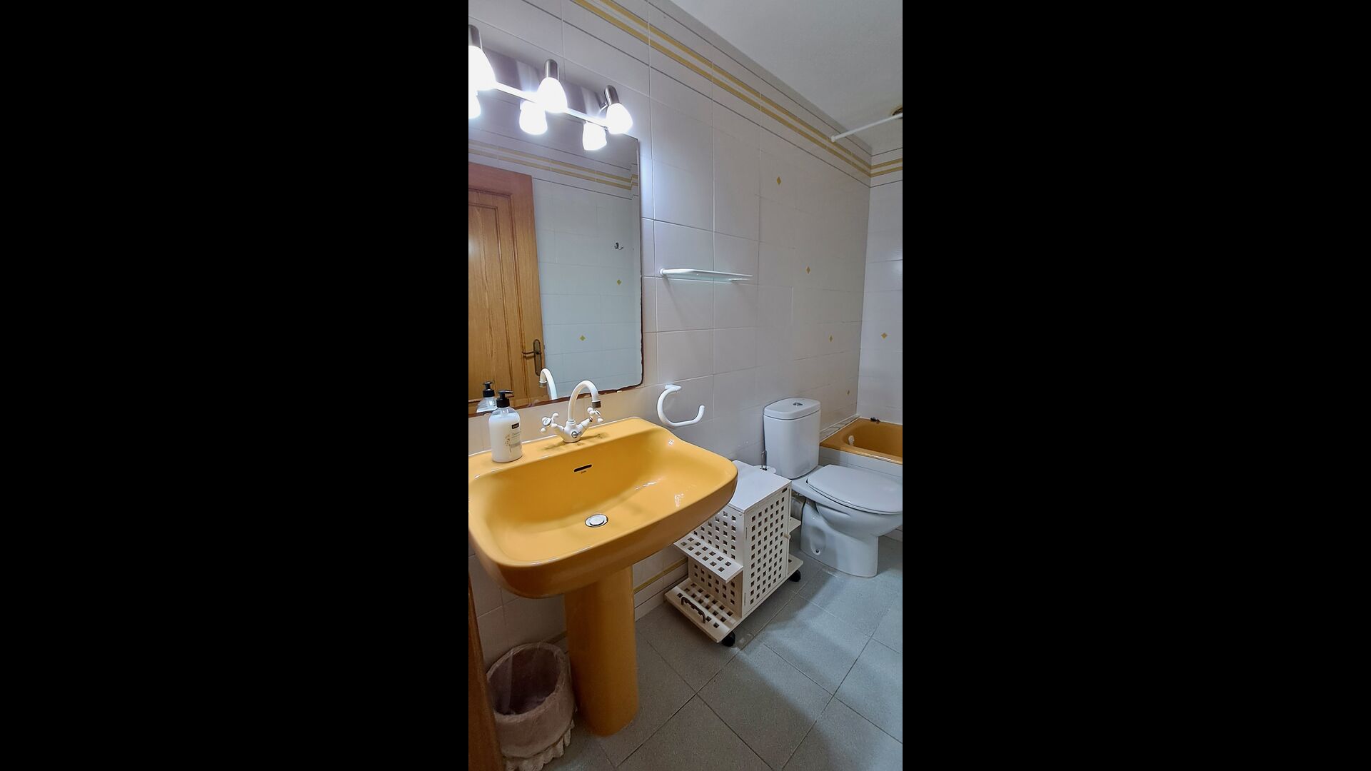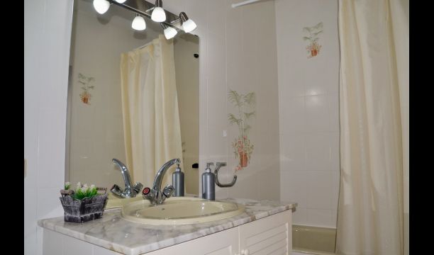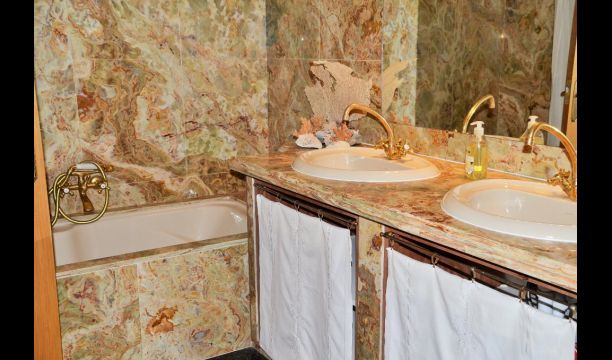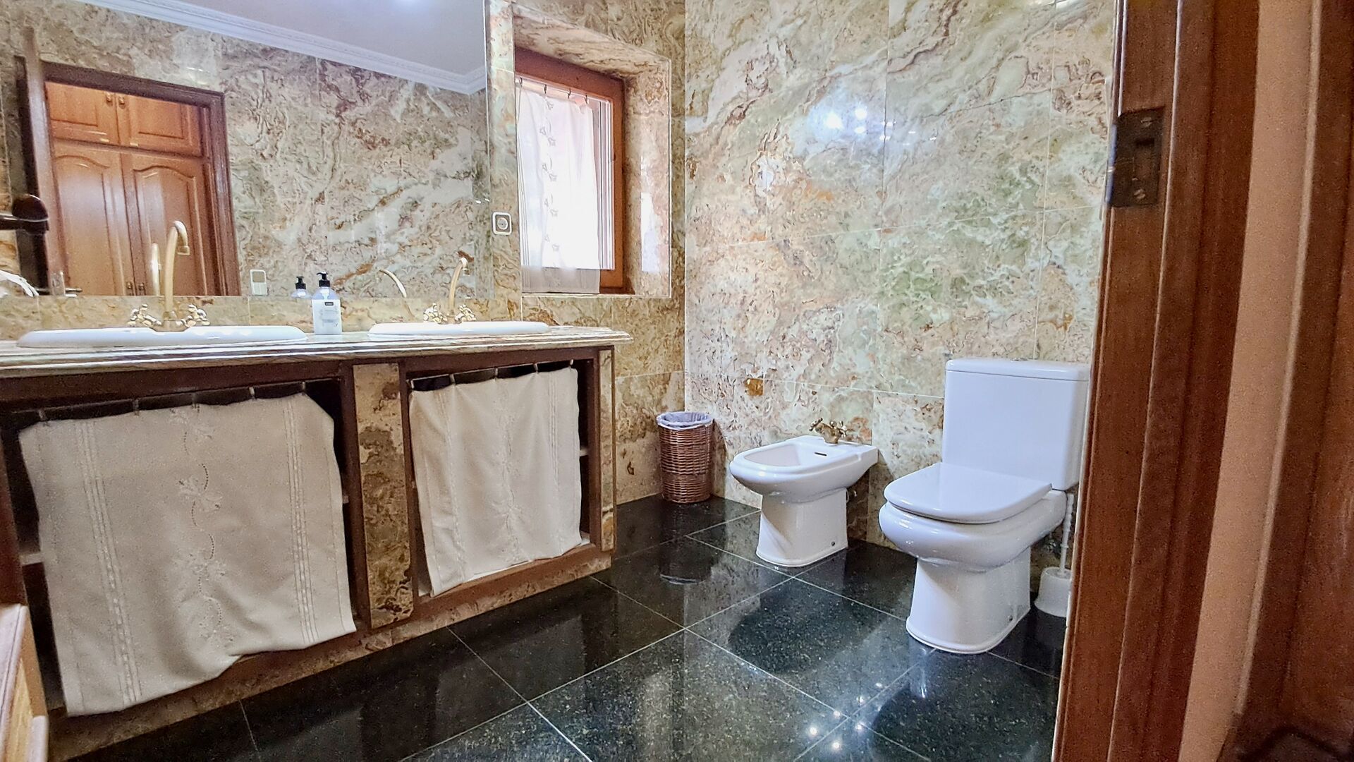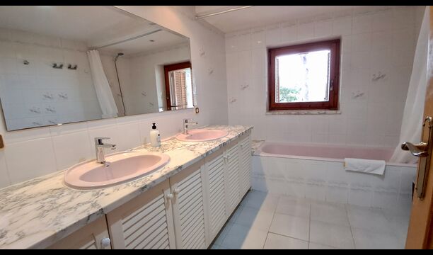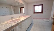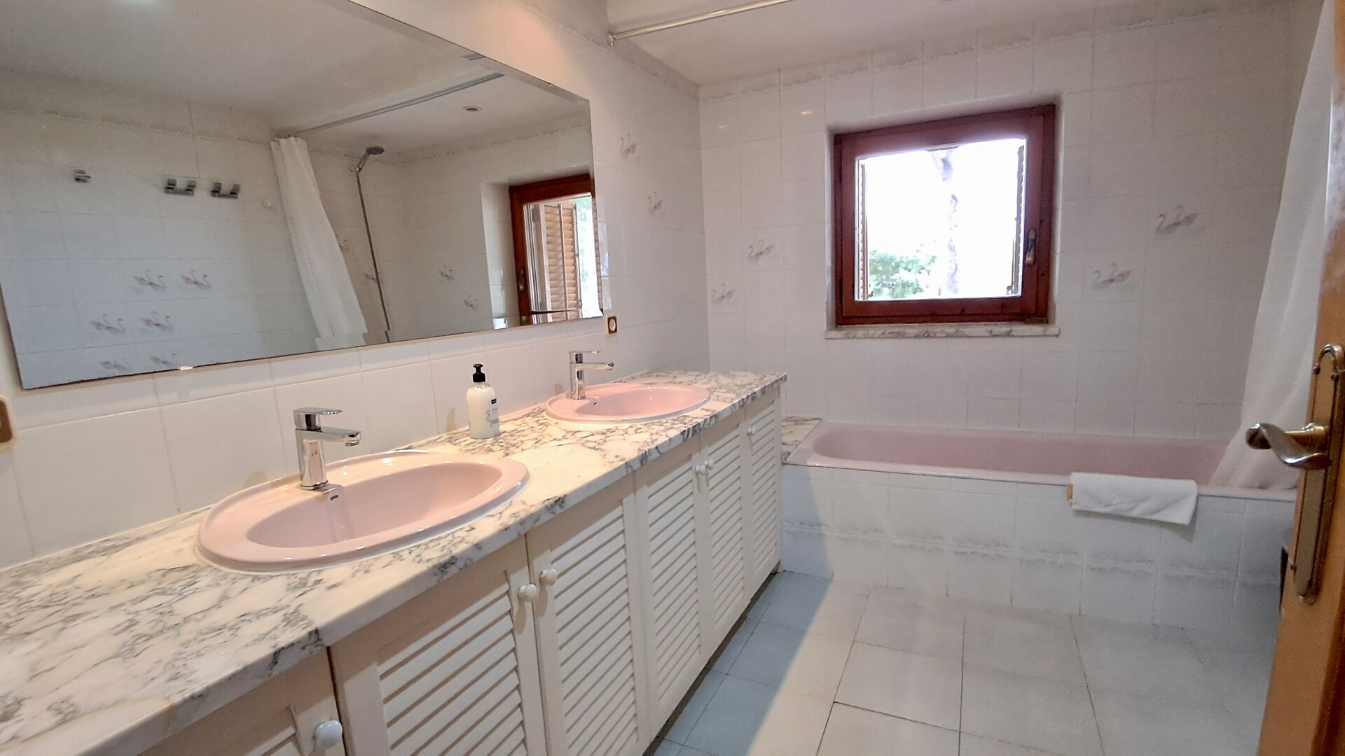 As additional facilities, two of the bedrooms have a balcony with pool view and a third bedroom has a big terrace. In addition there is on this floor a small sitting area, and 2 extra bathrooms (1 downstairs) to be shared between the rooms without bathrooms, hence in total 5 bathrooms. Finally, there is a room with washing machine, so you can do your laundry during your stay,