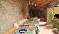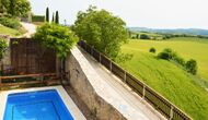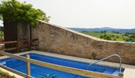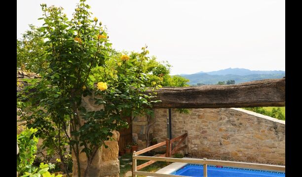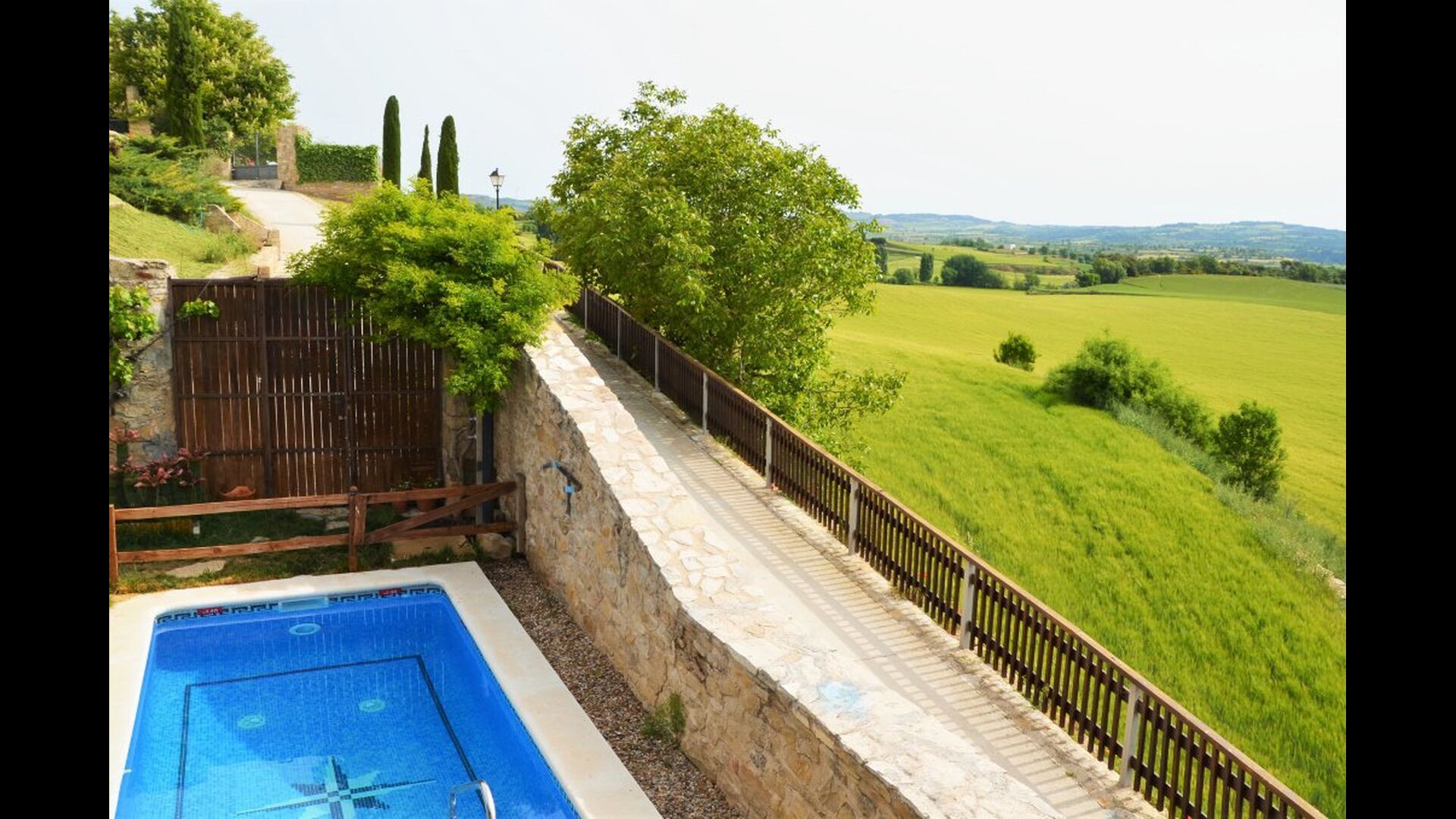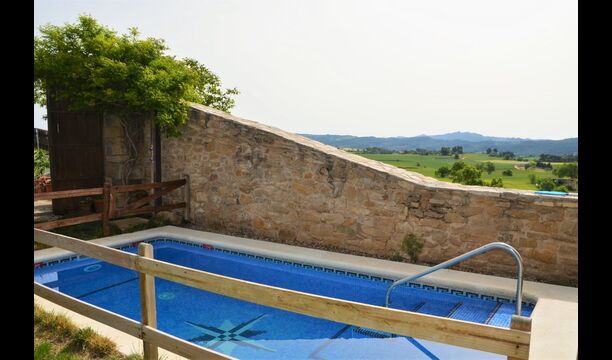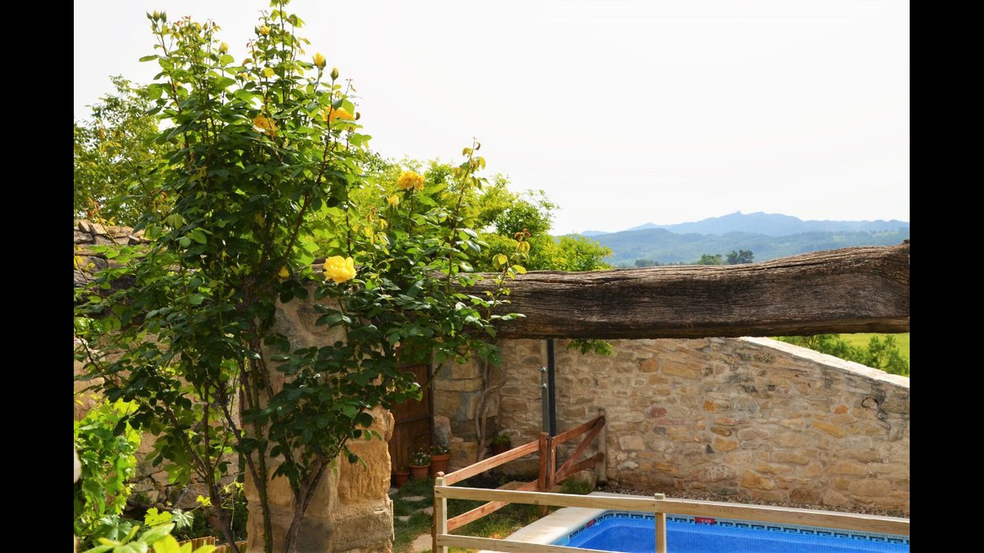 D'aquí a través d'una porta amb clau baixem unes escales que ens porten a un jardí encerclat per un mur de pedra, el qual hem abaixat una mica perquè es vegi desde dins el paissatge. En aquest espai tenim la piscina, una barbacoa i un porxo amb teulada, ideal pels sopars, lectures i pel descans en general.