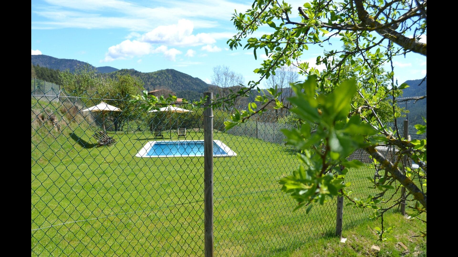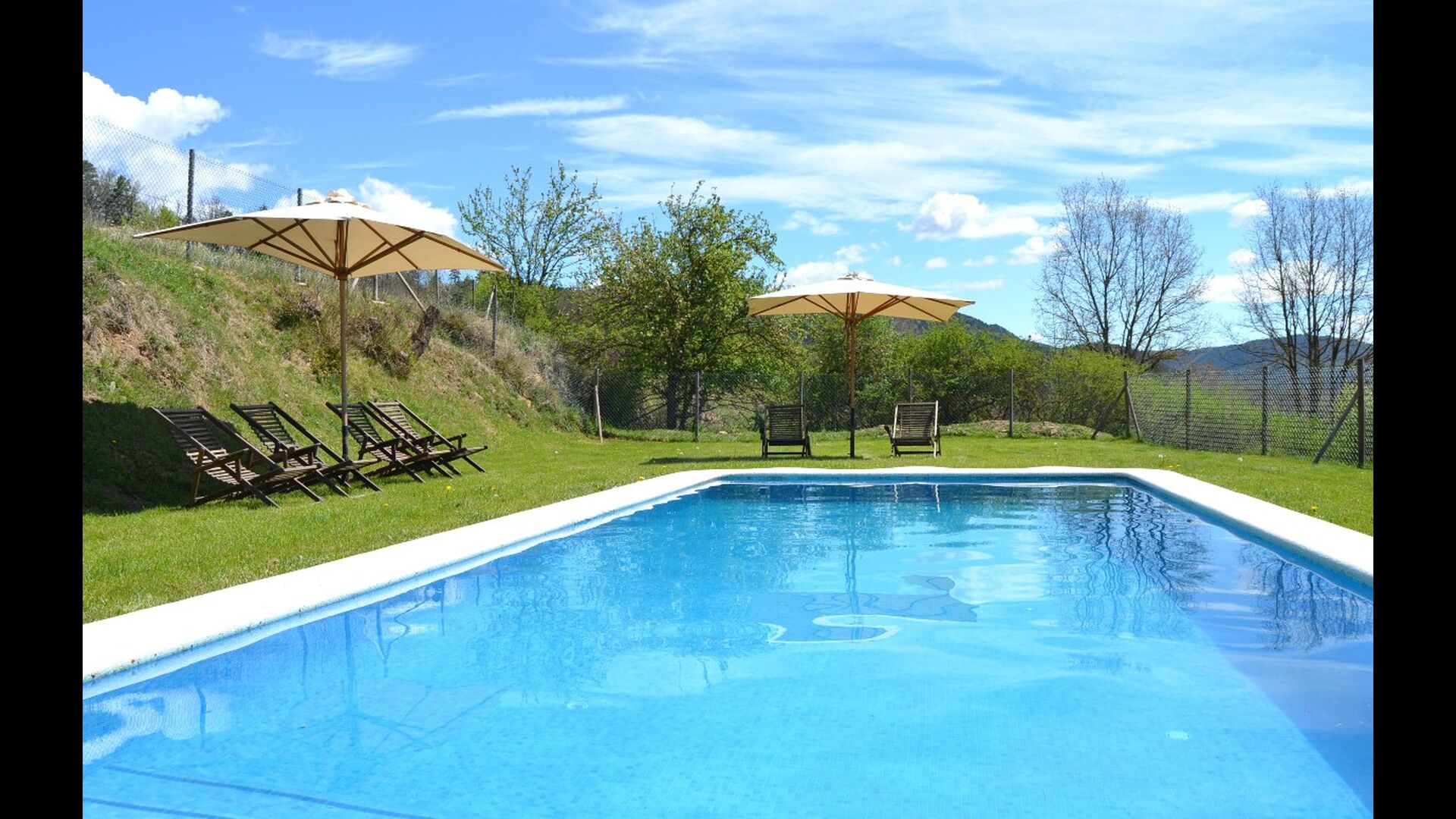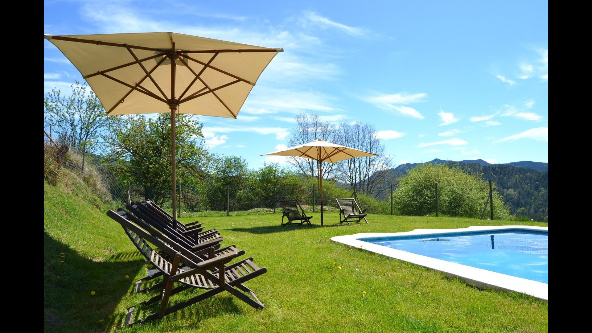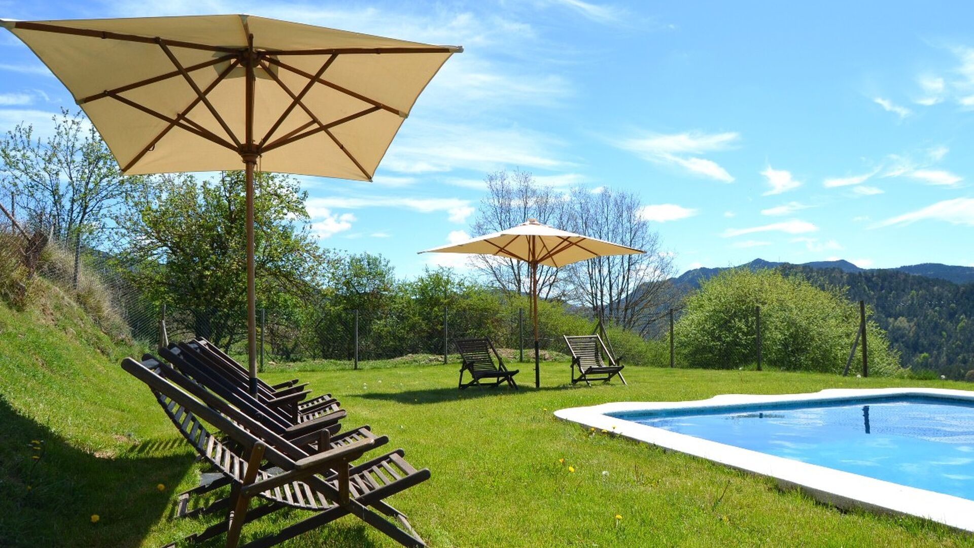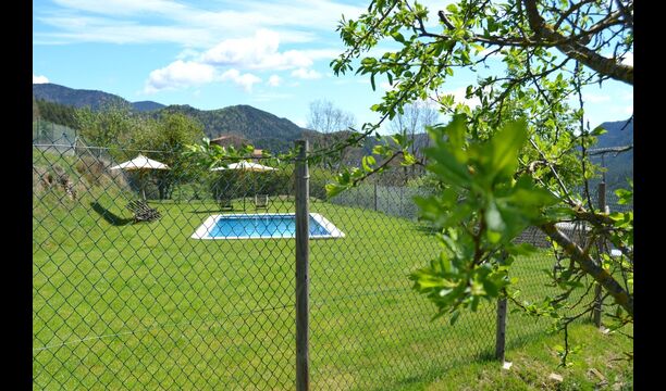 Outside the villa's pool of nearly 43 m² is located. It is very child-friendly because it has stairs, so the kids can easily get into the water. There are sunbeds and parasols and the beautiful and marvellous mountain views. The pool area is fenced, so small children can not access without supervision.