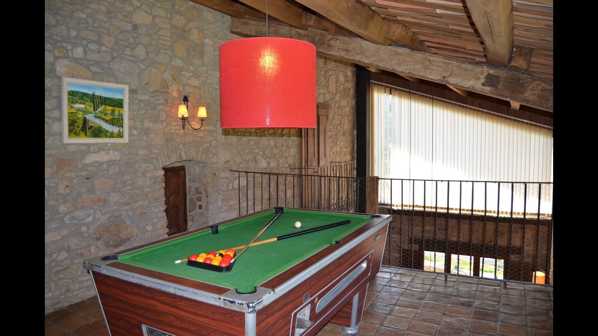 From the kitchen there is a staircase to first floor where there is a billiard table. Here you have some sort of indoor balcony, where you can see down to the family room and thus still be in the same room. The first floor has 5 double rooms. These are very spacious and of very high quality. All of them have their own bathroom (en suite).
