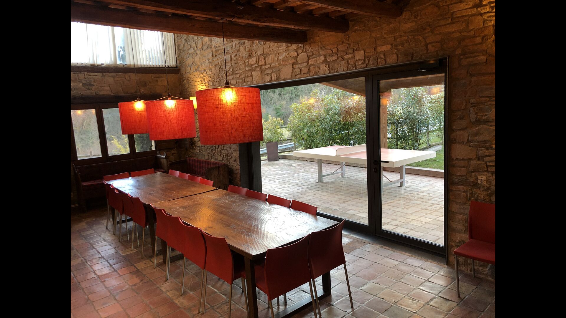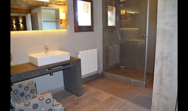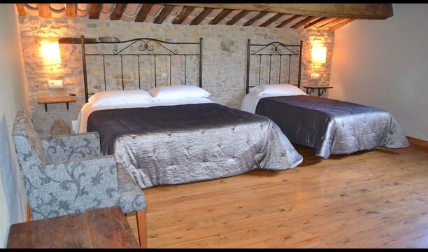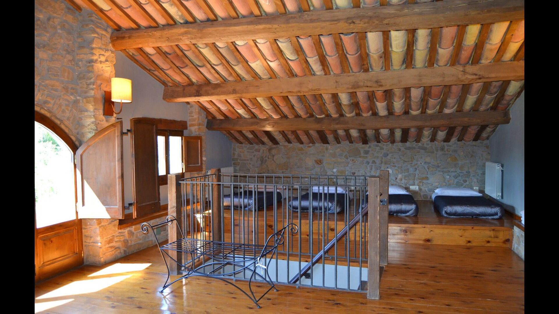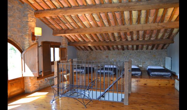 At the second floor there is a large hall, which is well suited for children. Here is a large hall with mattresses. This fits perfectly to a group of children, who can sleep and have fun here. On this floor there is a very large bathroom. Furthermore, there is a large triple room with a double bed and one single bed, which of course has an en suite bathroom.