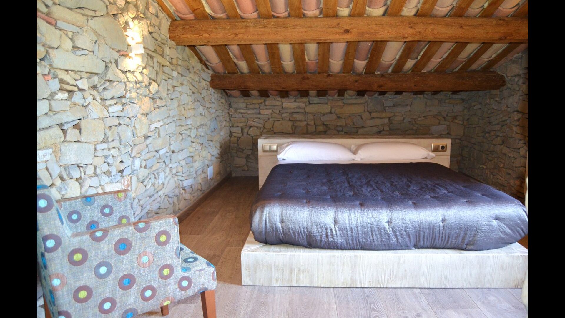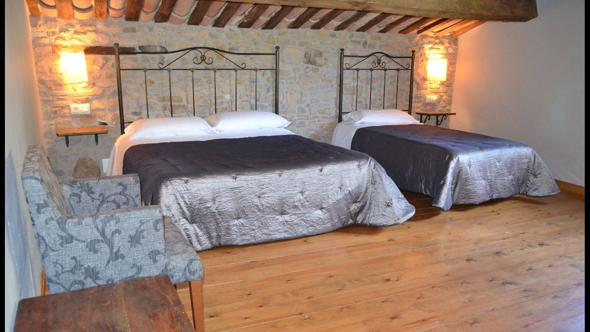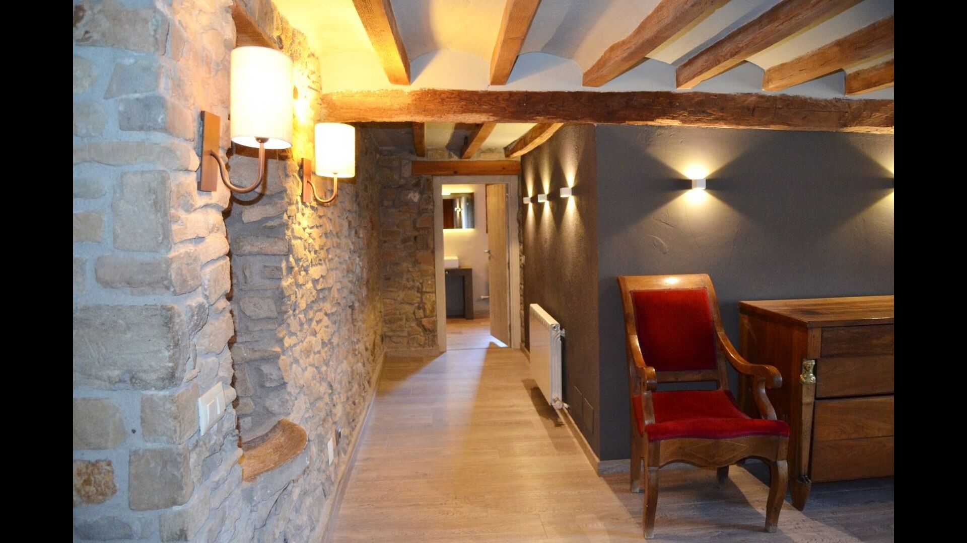 At the second floor there is a large hall, which is well suited for children. Here is a large hall with mattresses. This fits perfectly to a group of children, who can sleep and have fun here. On this floor there is a very large bathroom. Furthermore, there is a large triple room with a double bed and one single bed, which of course has an en suite bathroom.