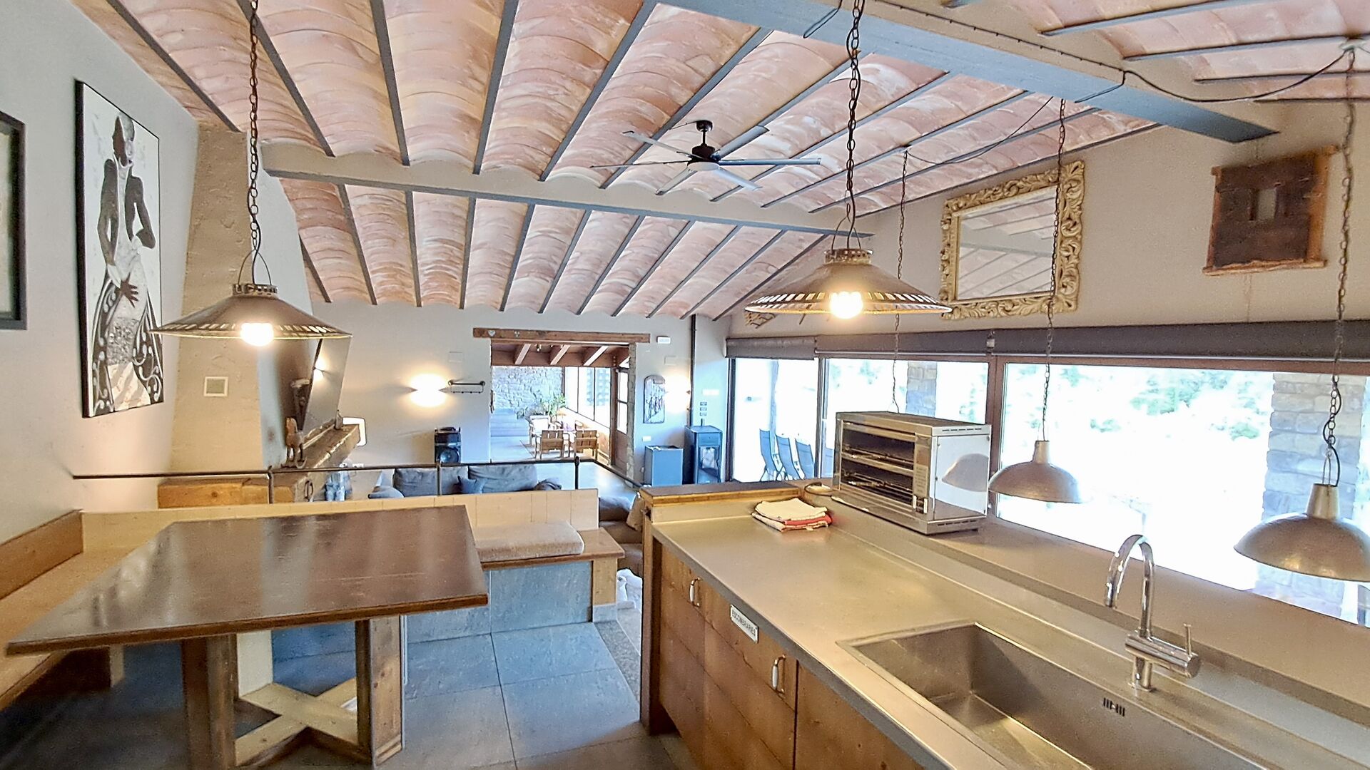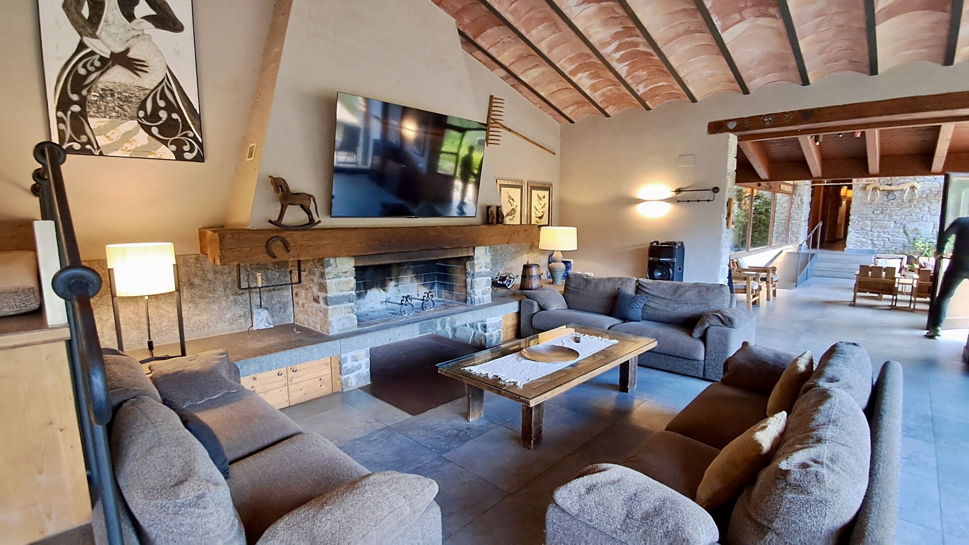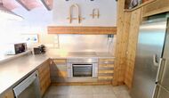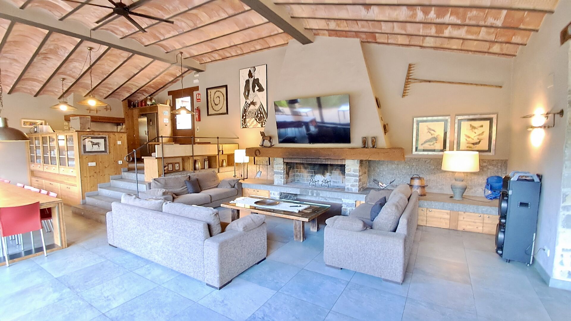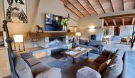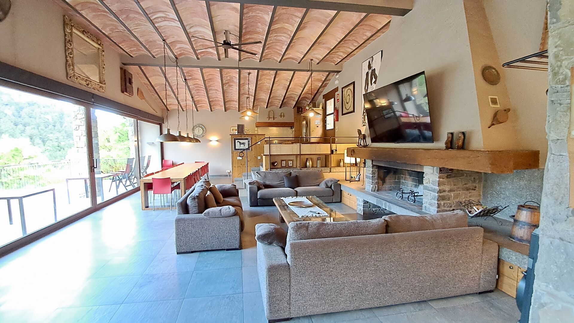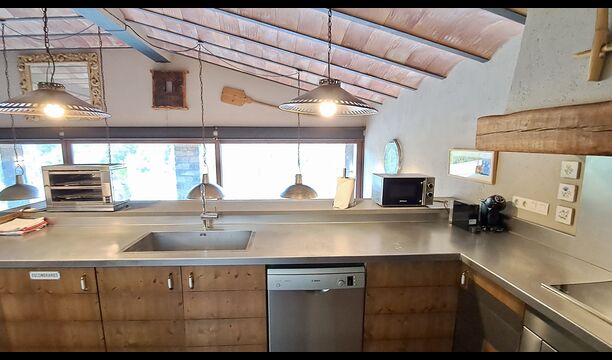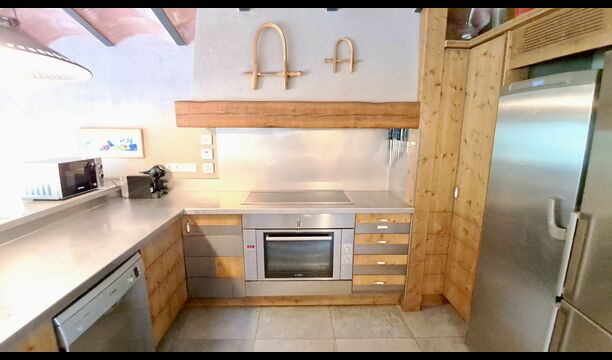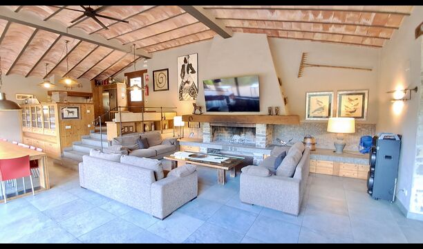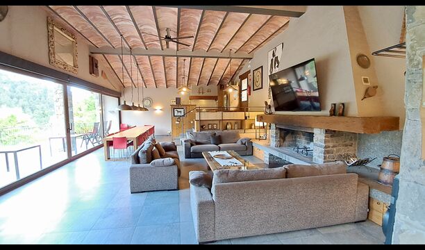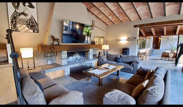 A la zona d’estar hi trobareu una àmplia sala d’estar i menjador amb llar de foc i accés directe a una gran terrassa assolellada. La sala disposa d’un televisor de 63 polzades i molta llum natural. La cuina està completament equipada amb totes les comoditats modernes: nevera, microones, forn, placa d’inducció, cafetera Nespresso, rentaplats i tot el parament necessari.