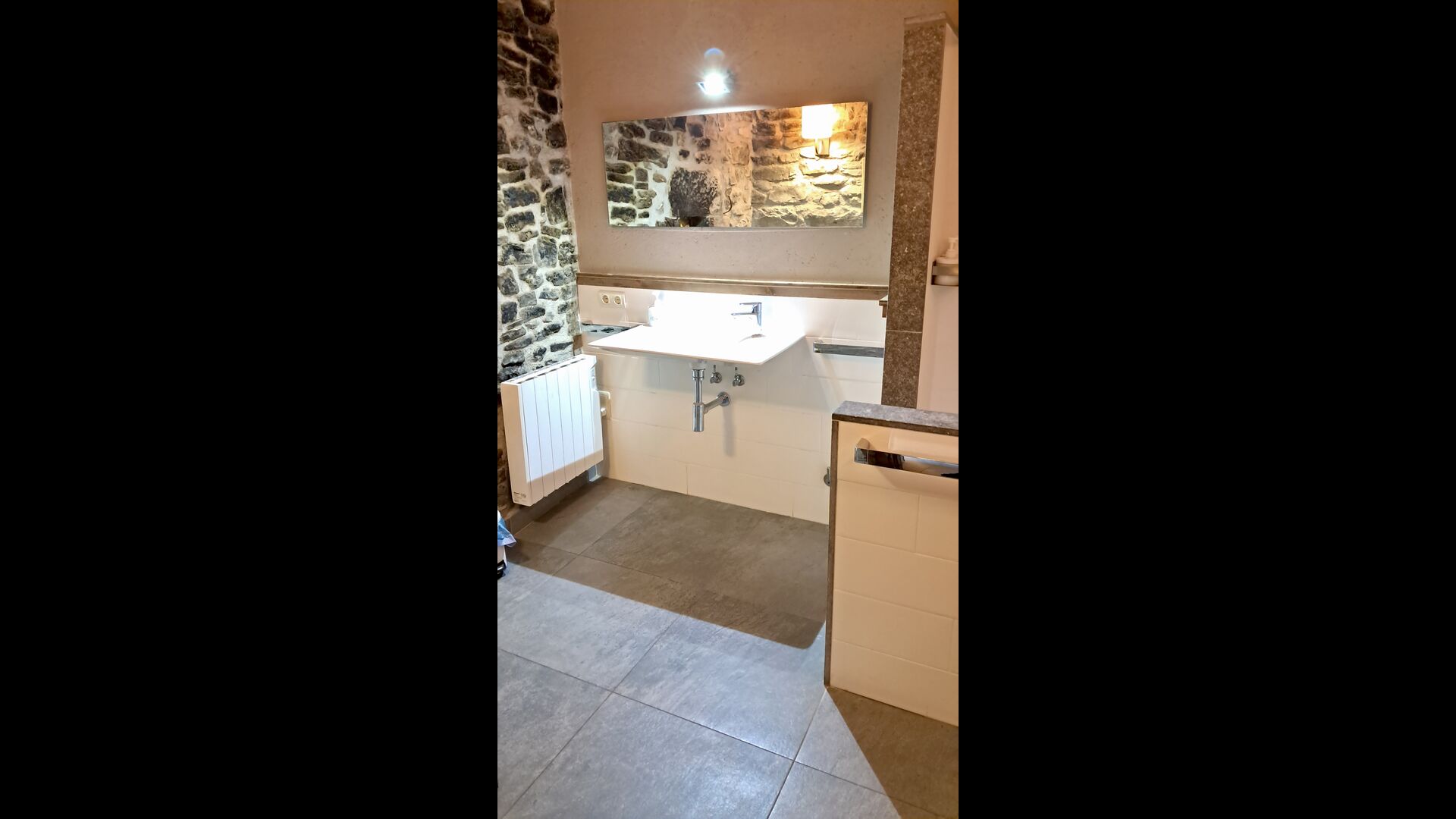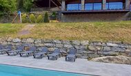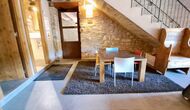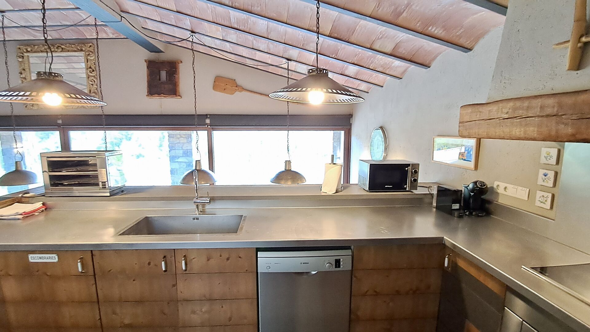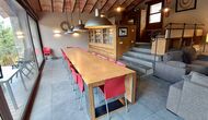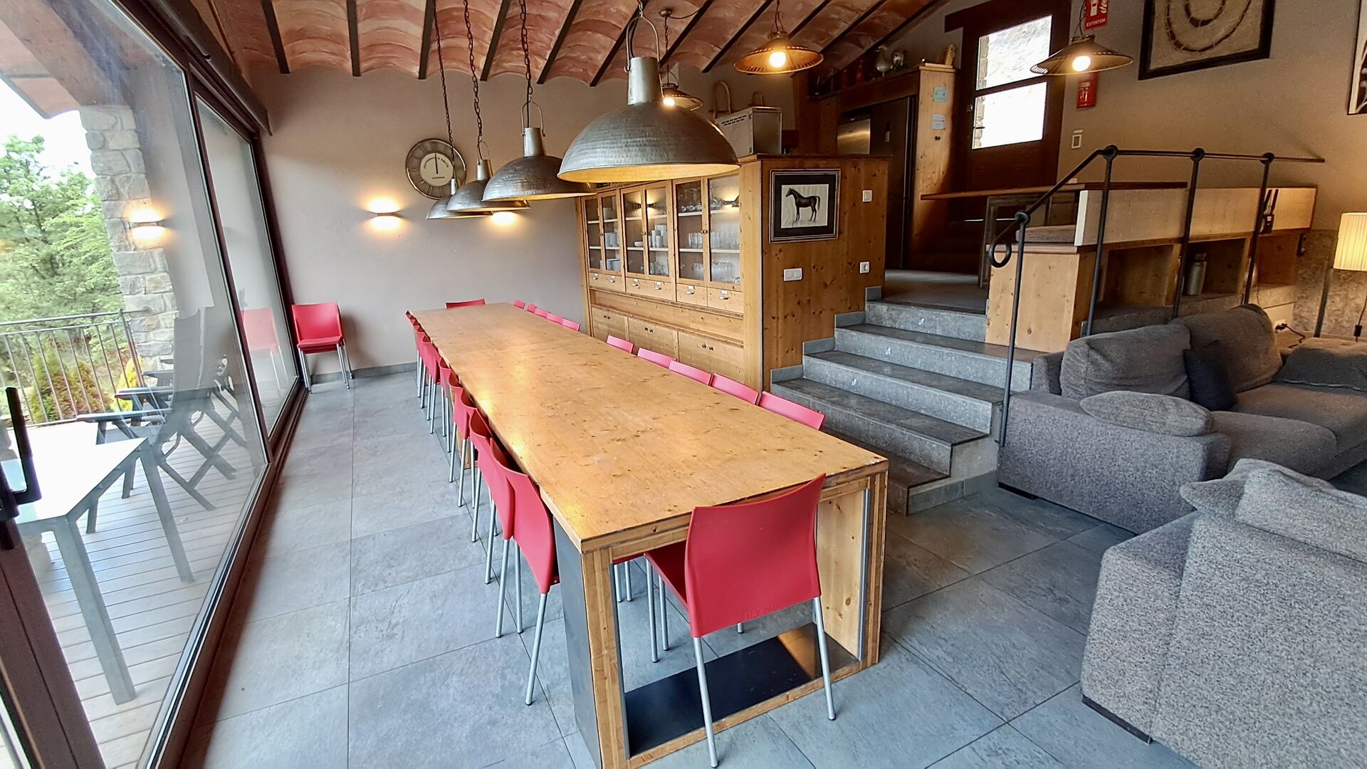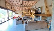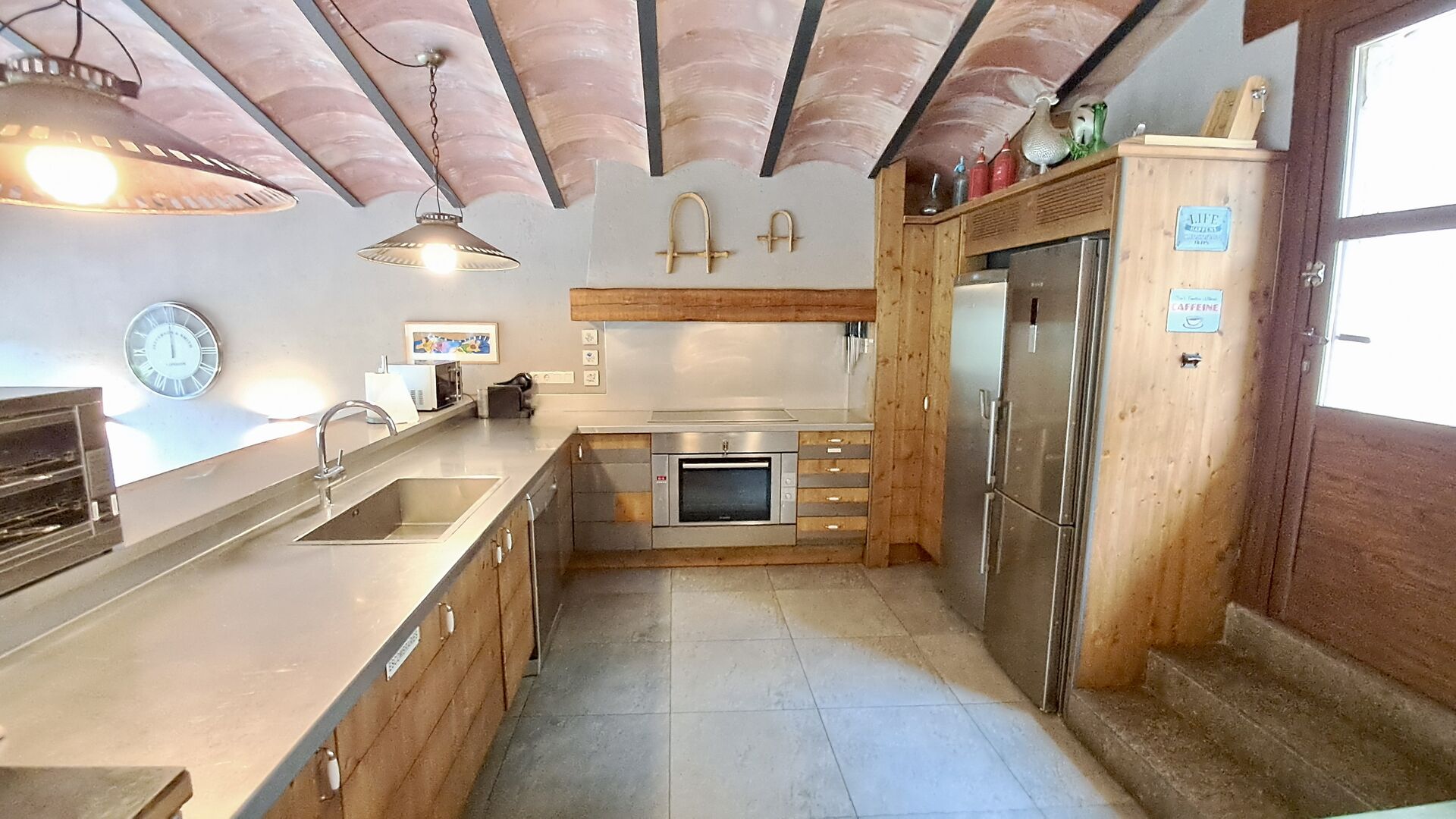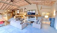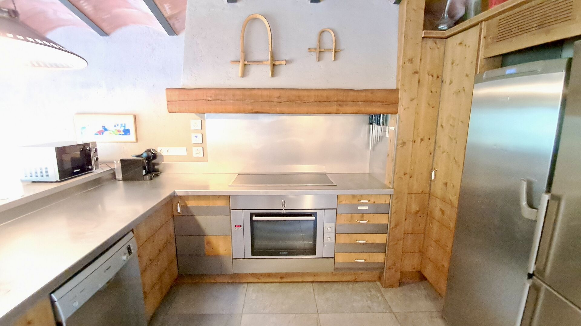 A la zona d’estar hi trobareu una àmplia sala d’estar i menjador amb llar de foc i accés directe a una gran terrassa assolellada. La sala disposa d’un televisor de 63 polzades i molta llum natural. La cuina està completament equipada amb totes les comoditats modernes: nevera, microones, forn, placa d’inducció, cafetera Nespresso, rentaplats i tot el parament necessari.