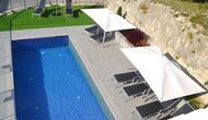 On the first floor, you find the three bedrooms with bathrooms en suite. Two of them are double rooms, and one has four beds. On this floor too, there is a common room with sofas and a balcony with a view to the garden and a first floor terrace with barbecue. From this floor, you have direct access to the pool area.