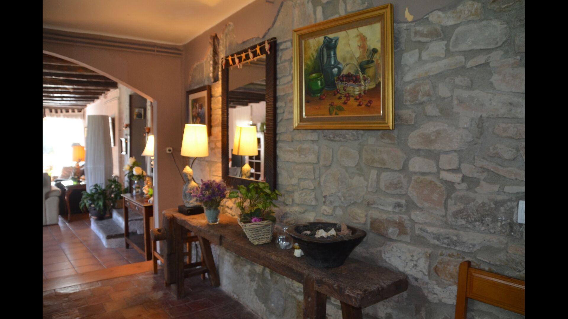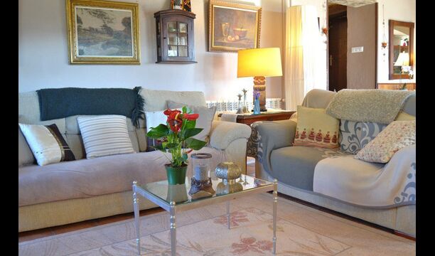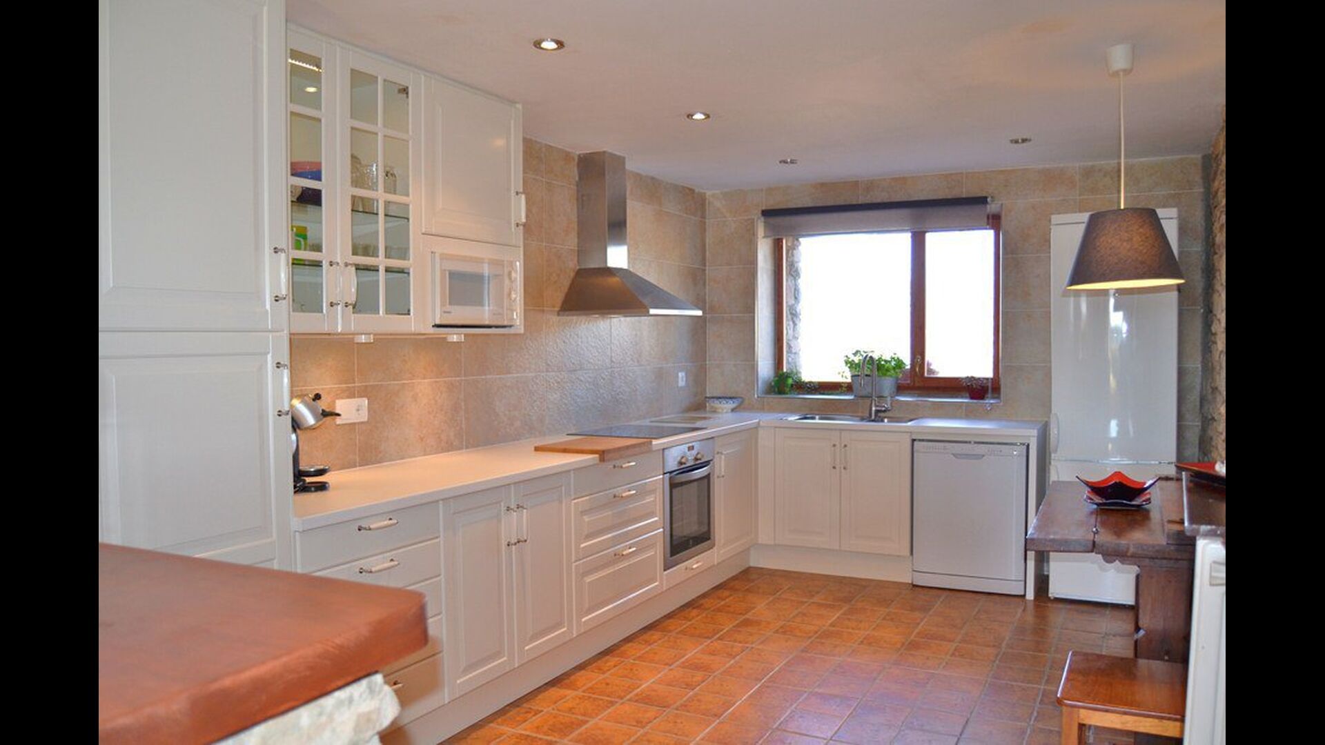 The beautiful living room with sofas and a fireplace is an extension of the house dining area that is decorated with the good traditional Spanish dining table. The kitchen is really beautiful and really spacious so it has plenty of space for the large holiday group. It has all modern amenities. These include refrigerator, freezer, good large oven, microwave, dishwasher, espresso and gas stove. The house has fast WI-FI, DVD and music system.