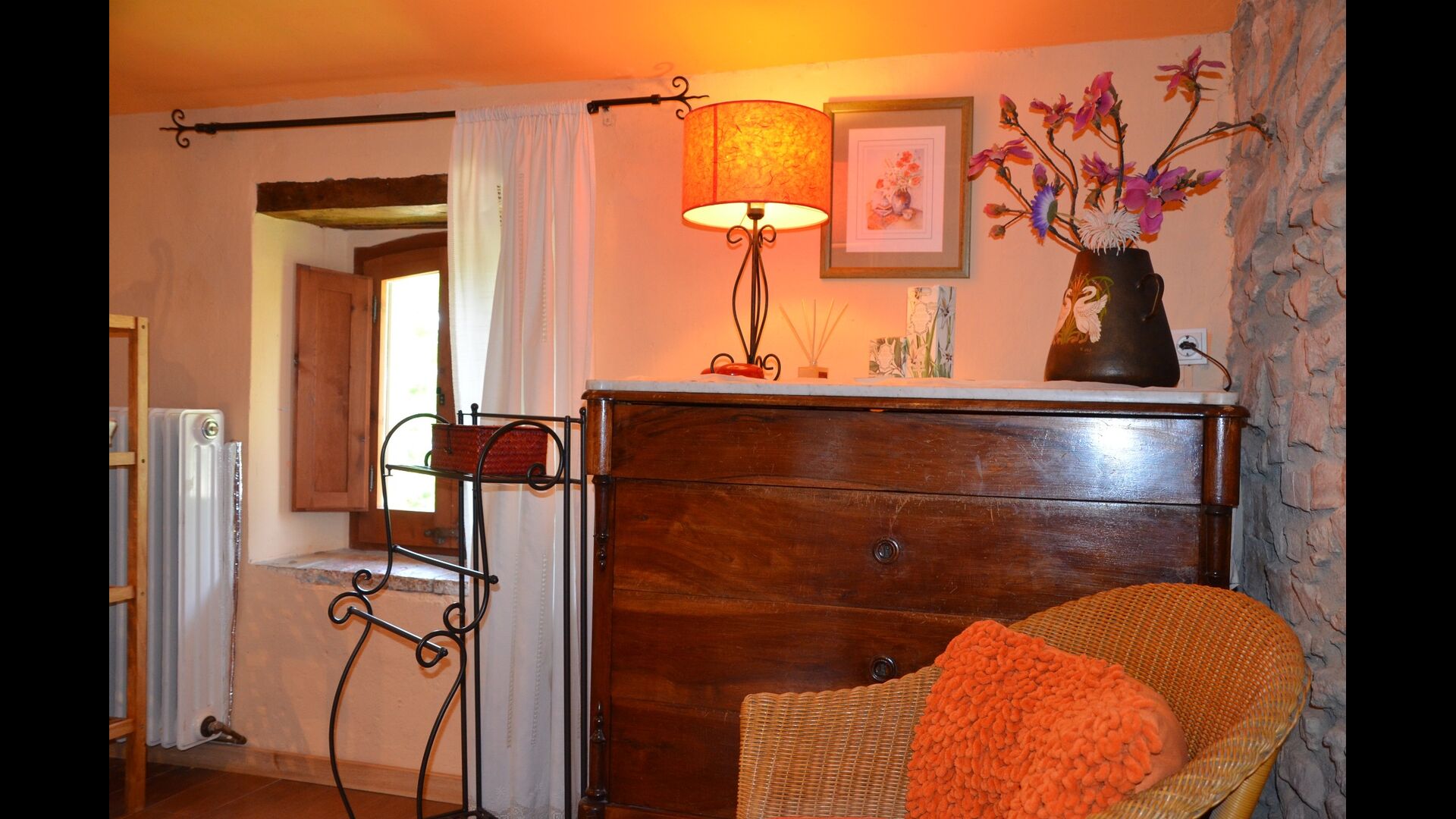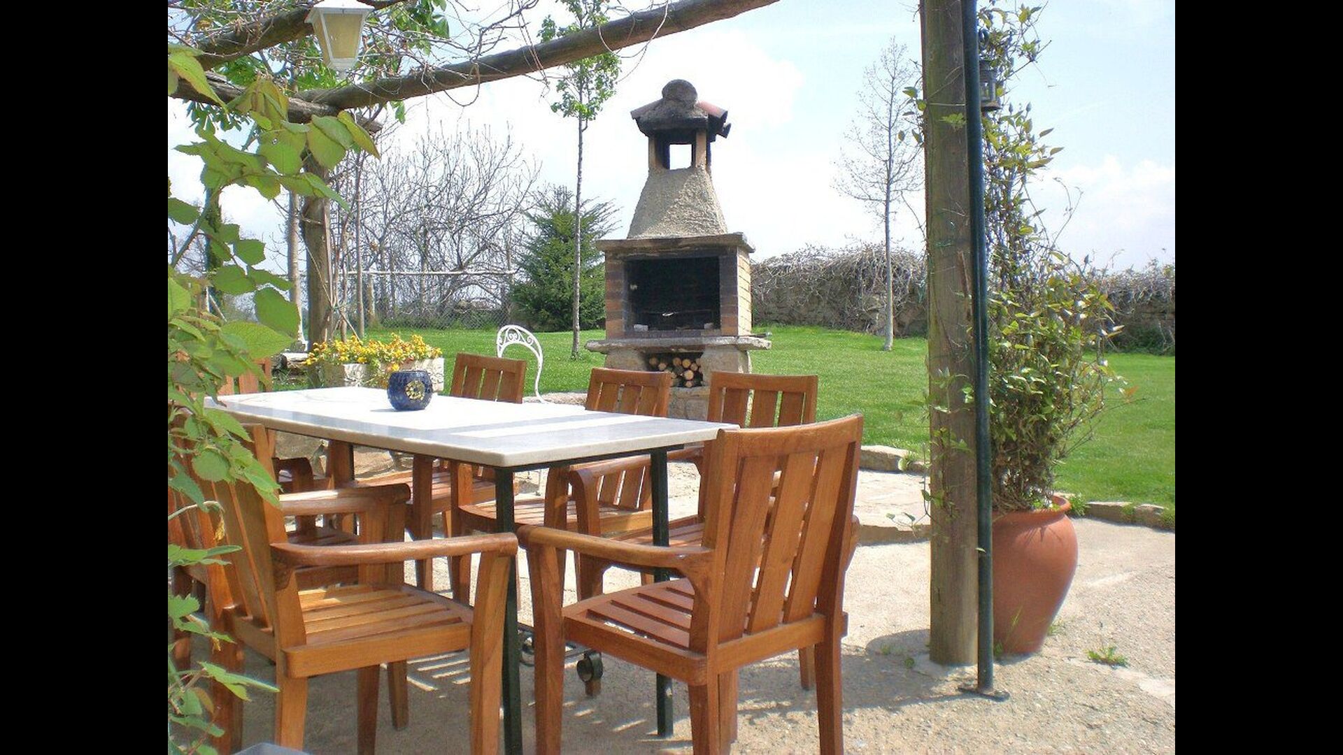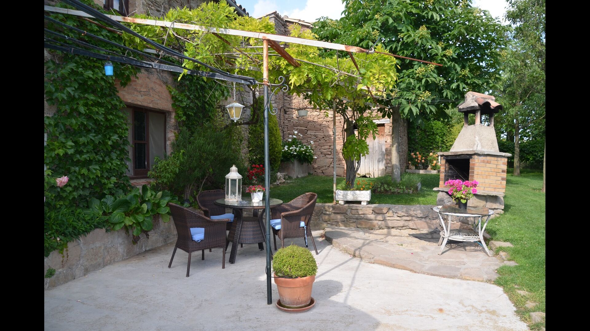 In front of the house you will find the terrace areas, which are all covered with wine and flowers, which is great on the really warm summer days. Here you will also find the outdoor dining area of the house as well as the BBQ area. From the terrace you will find a excellent view to the stunning landscape. In the end of the garden you will find the private swimming pool with plenty of sun beds. At the end of the pool, there are quite a lot of stunning flowers during the summer.