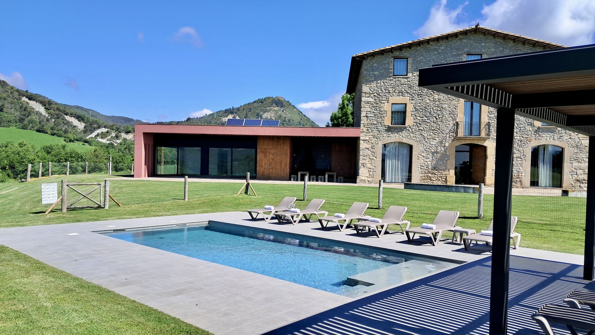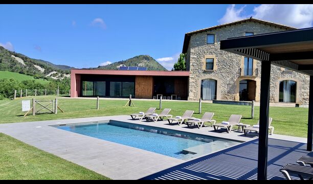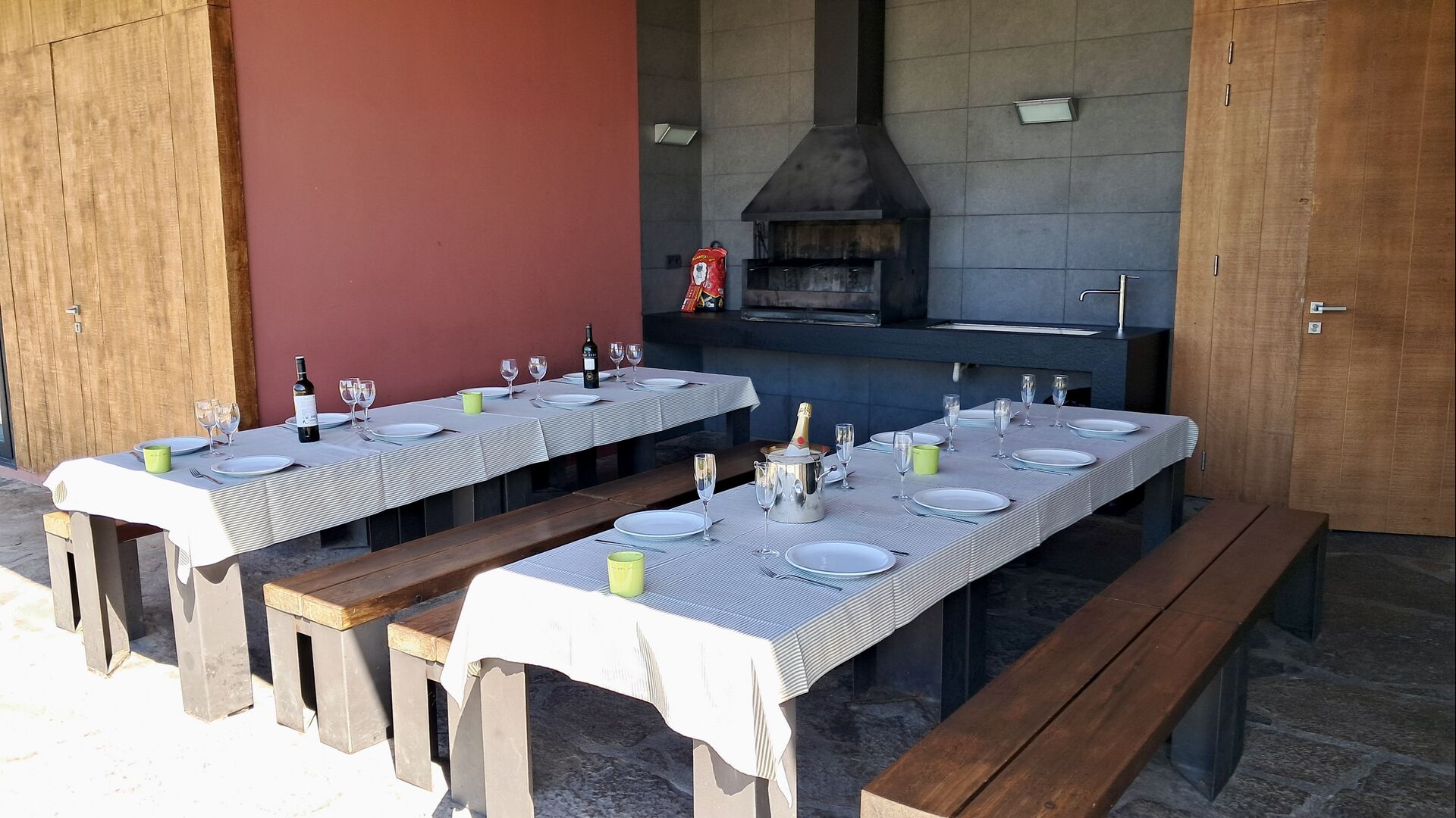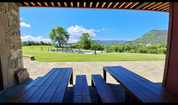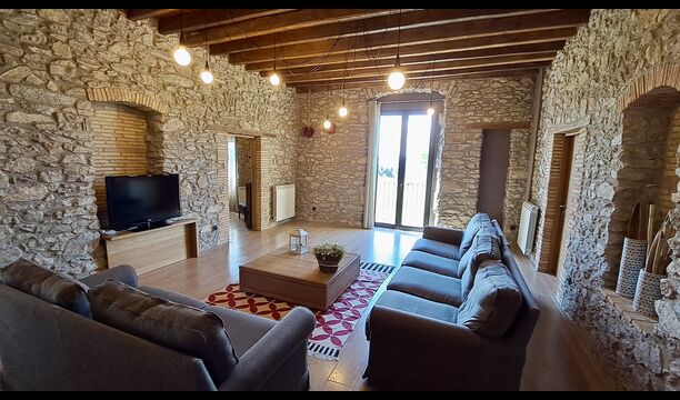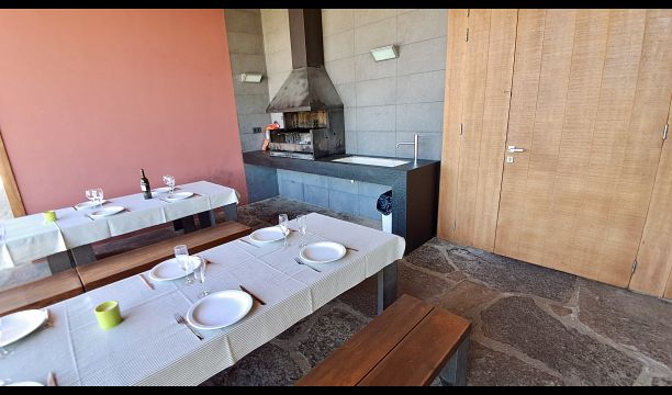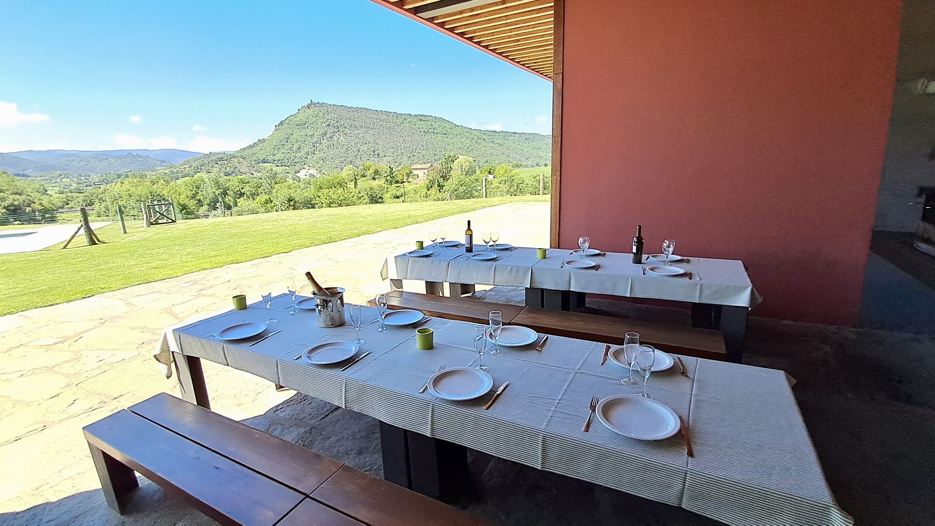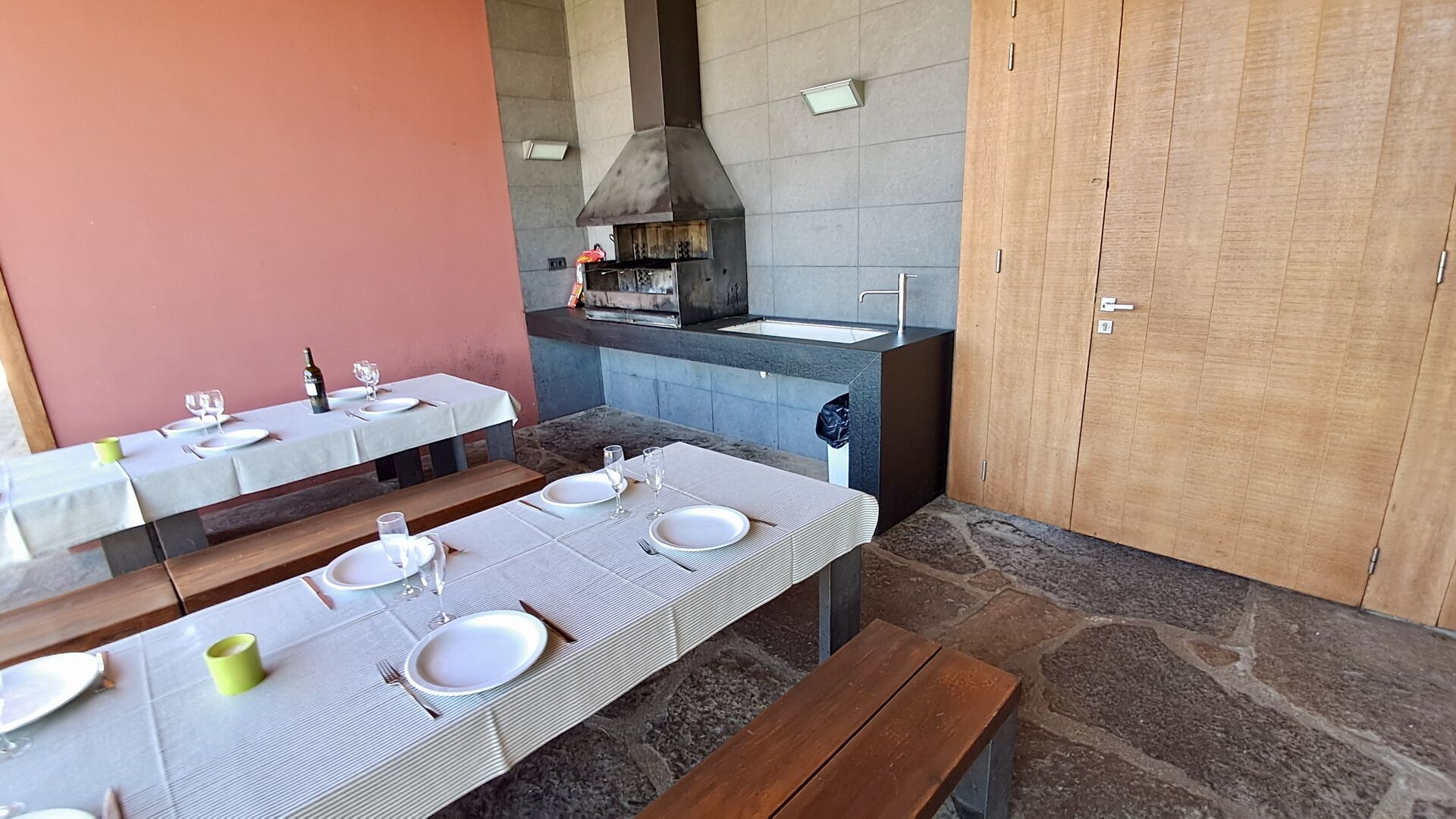 Els 2000 m2 de jardí que la rodegen tenen la seva pròpia piscina privada amb hamaques. A més a més, també te una terrassa coberta amb BBQ, una pica i aigua, on pots gaudir de les càlides i encantadores tardes. La cuina, que està situada amb un accés fàcil a la terrassa, té totes les facilitats modernes que un pot necessitar – cafetera nespresso, forn, microones, dues neveres i una preciosa taula llarga a l’estil tradicional. En resum, aquesta casa rural és la perfecte pels convidats, que busquen el millor confort.