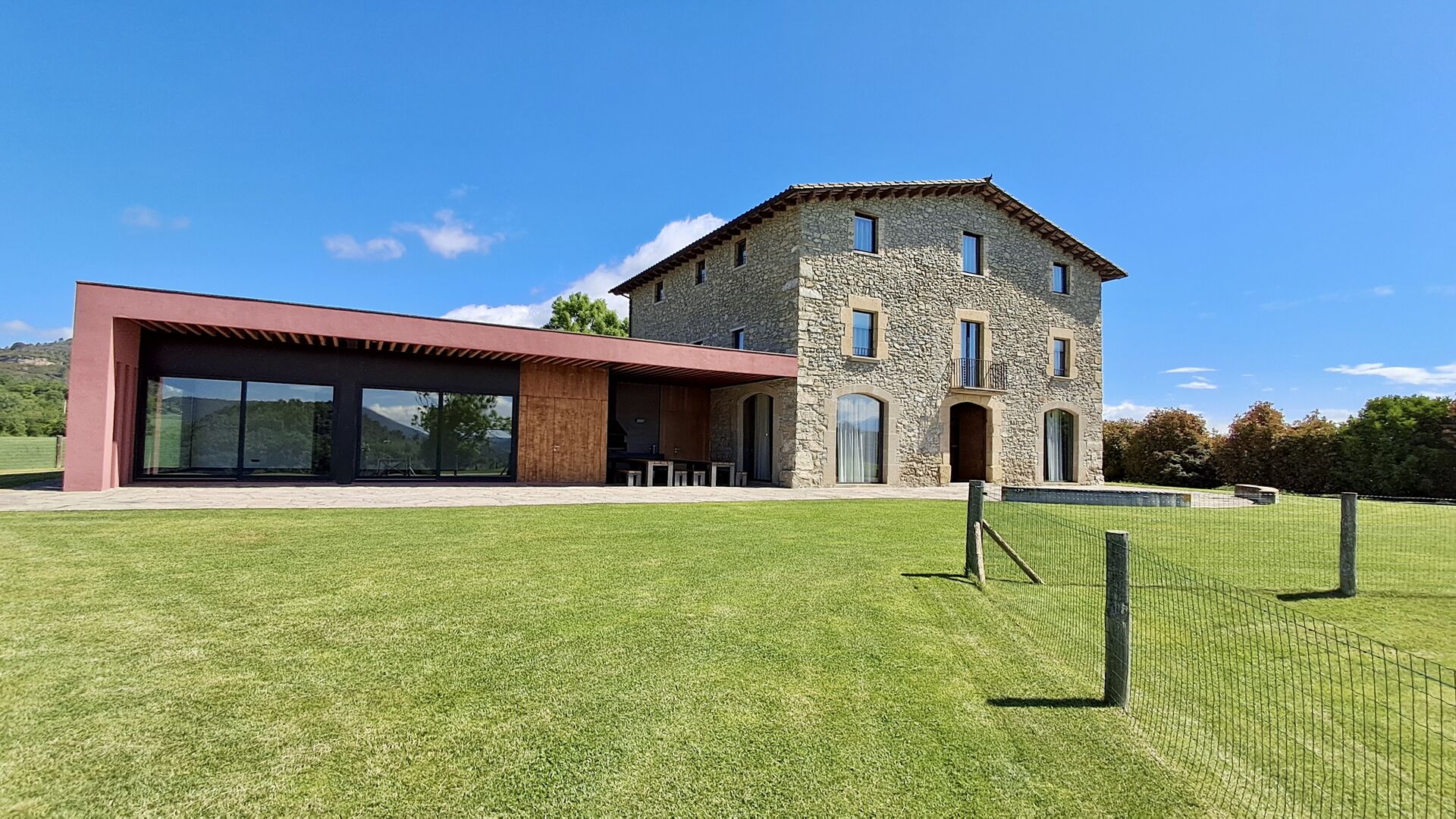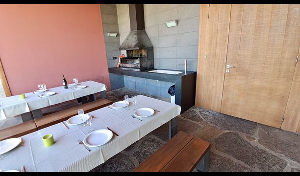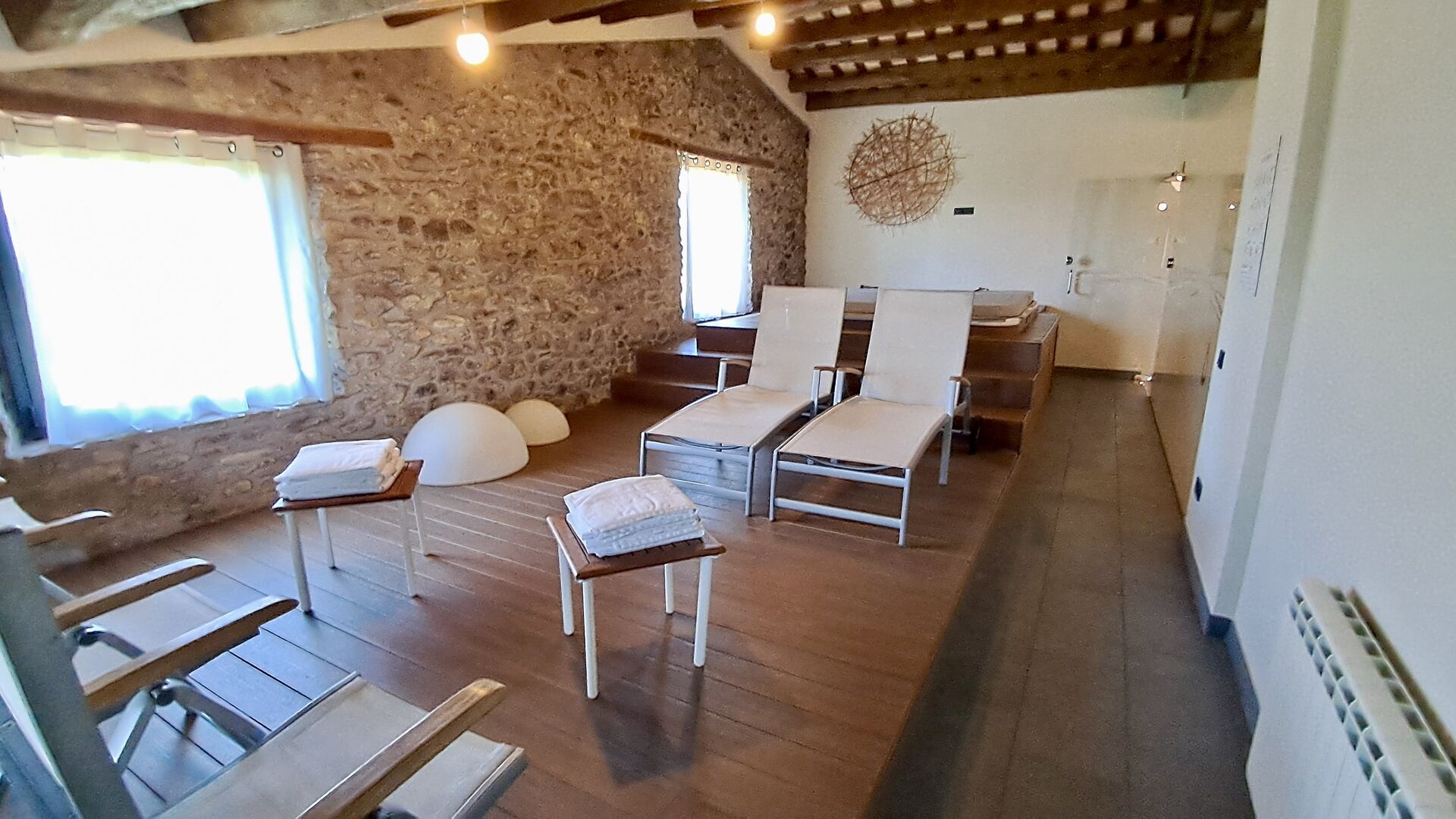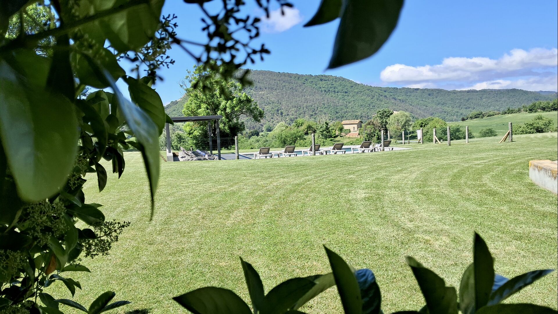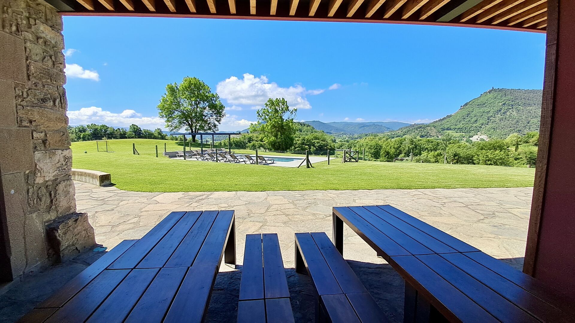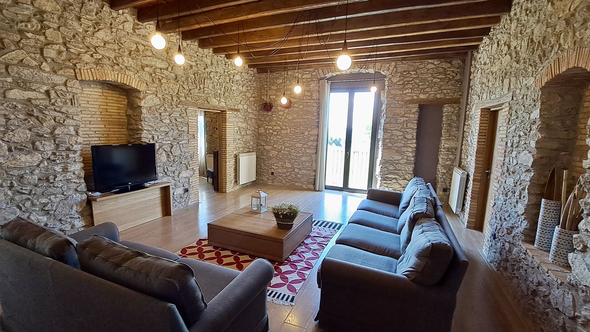 Els 2000 m2 de jardí que la rodegen tenen la seva pròpia piscina privada amb hamaques. A més a més, també te una terrassa coberta amb BBQ, una pica i aigua, on pots gaudir de les càlides i encantadores tardes. La cuina, que està situada amb un accés fàcil a la terrassa, té totes les facilitats modernes que un pot necessitar – cafetera nespresso, forn, microones, dues neveres i una preciosa taula llarga a l’estil tradicional. En resum, aquesta casa rural és la perfecte pels convidats, que busquen el millor confort.