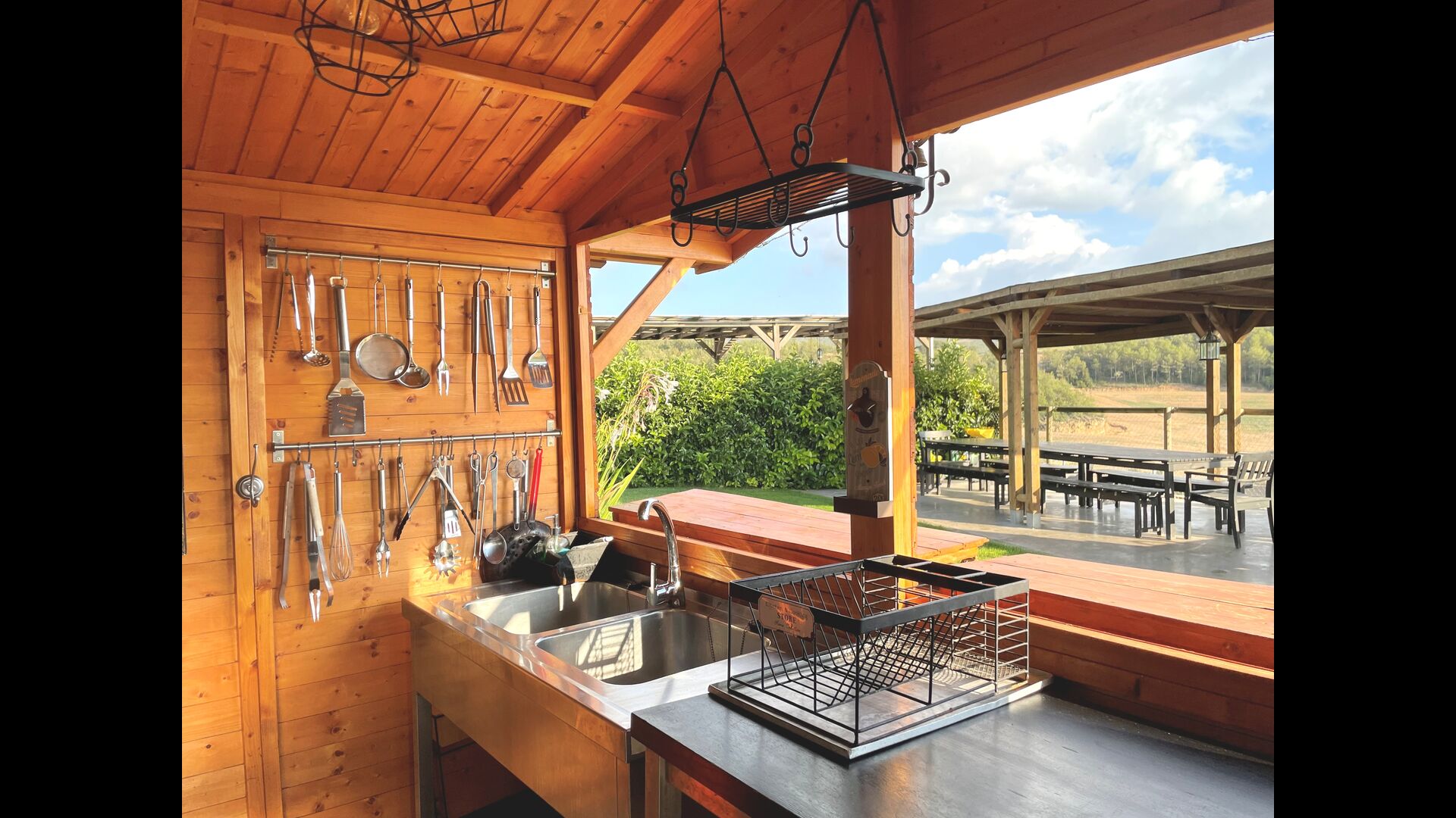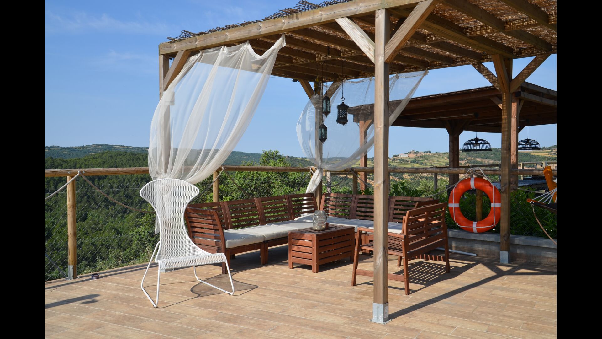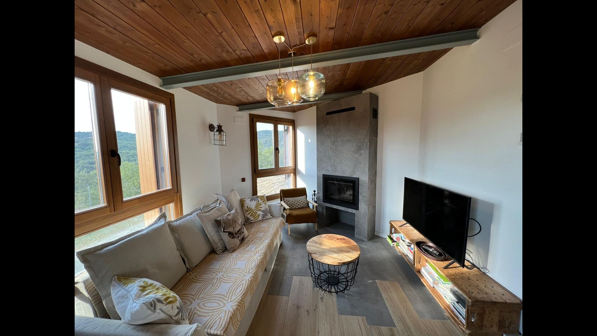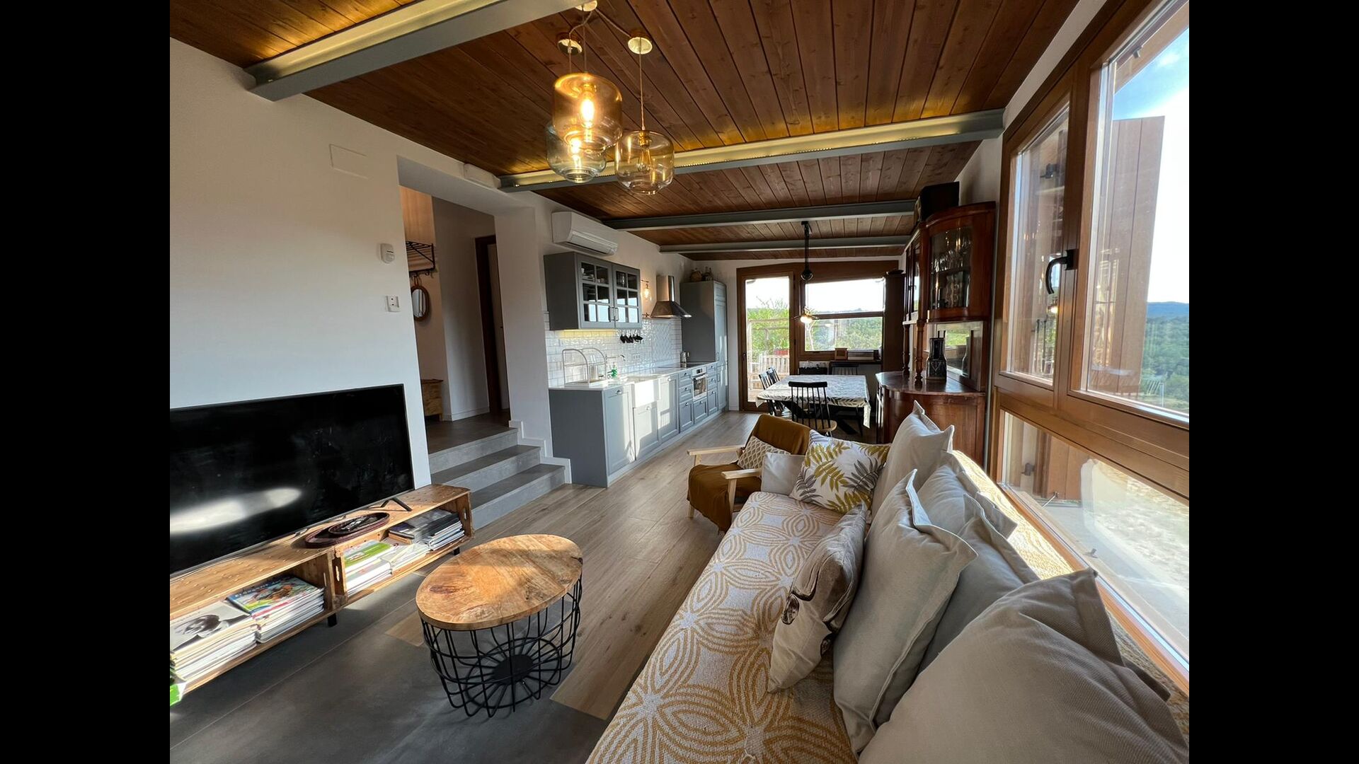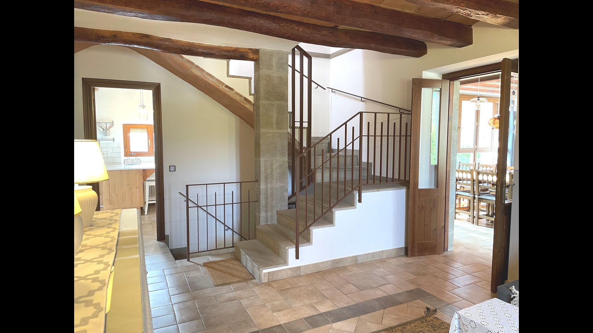 Des de la terrassa podreu gaudir de les impressionants vistes dels verds turons catalans. Els àpats a l'aire lliure es poden gaudir a la taula llarga de la gran terrassa. Només es poden recomanar menjars casolans, ja que la cuina interior blanca i moderna també es complementa amb una cuina exterior coberta i luxosa. El Oreña també és molt familiar. A la casa de vacances hi ha un petit parc infantil amb tobogan i gronxadors i podeu vigilar els nens quan neden i juguen a la piscina tancada. zona de piscina.