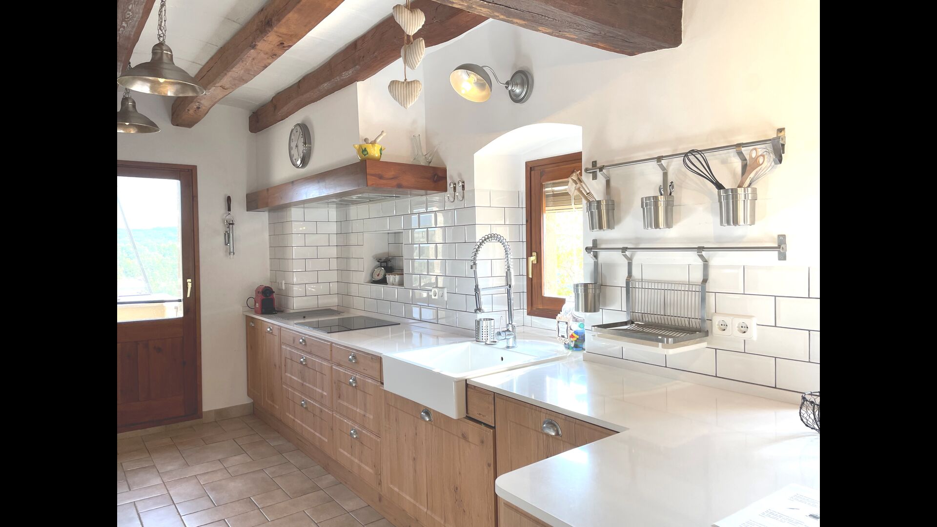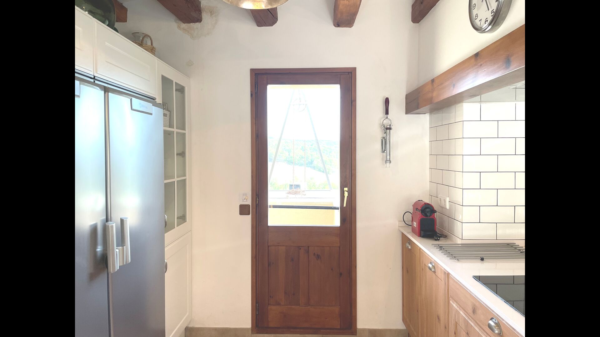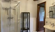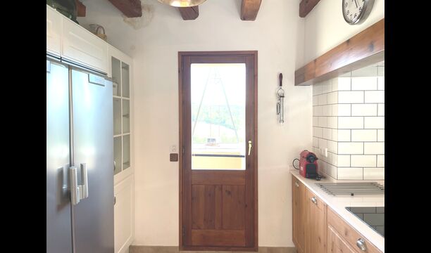 En planta hi ha una bonica habitació doble amb un llit de matrimoni, que té accés directe al jardí i un bonic bany en suite. També hi ha un lavabo, unsaló amb una minibotiga, on es pot comprar cervesa, cafè i deliciosos productes de proximitat. A mesura que puges les escales fins al 1r pis, entraràs a la cuina molt moderna amb taulells de corian blanc, nevera gran, congelador, forn, microones, bullidor d'aigua – per dir-ho breument: tot el que necessita una cuina. Des de la cuina hi ha fins i tot una sortida a un petit balcó on es pot gaudir del seu cafè del matí amb la vista impressionant de la natura catalana.