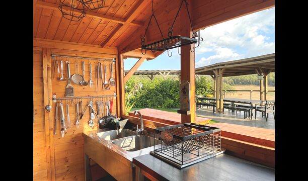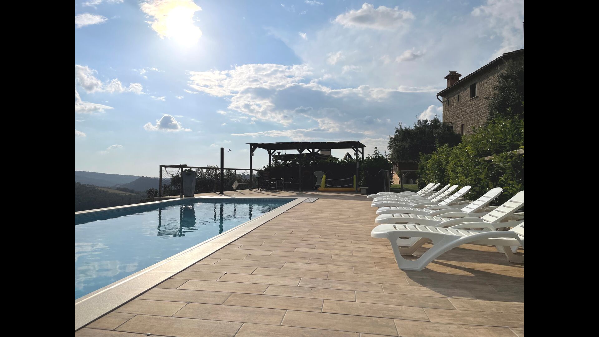 El centre natural per a les vostres vacances és la zona combinada de terrassa i piscina, situada per gaudir d'una vista esplèndida. Aquí trobareu la piscina tancada amb escales romanes, la secció infantil baixa i la única, gran , zona chill-out coberta. La zona chill-out coberta conté una taula de menjador llarga i una cuina exterior moderna.