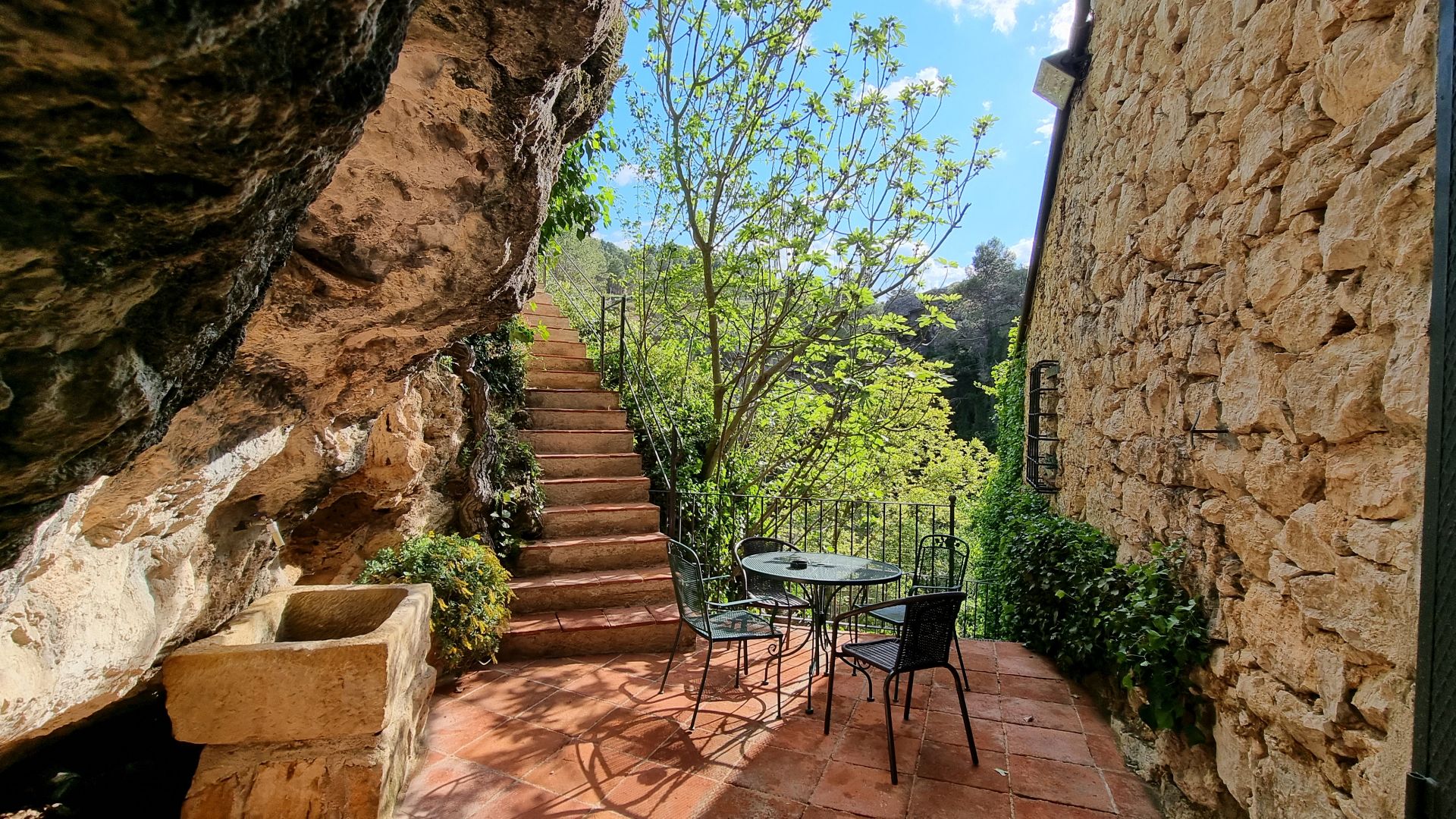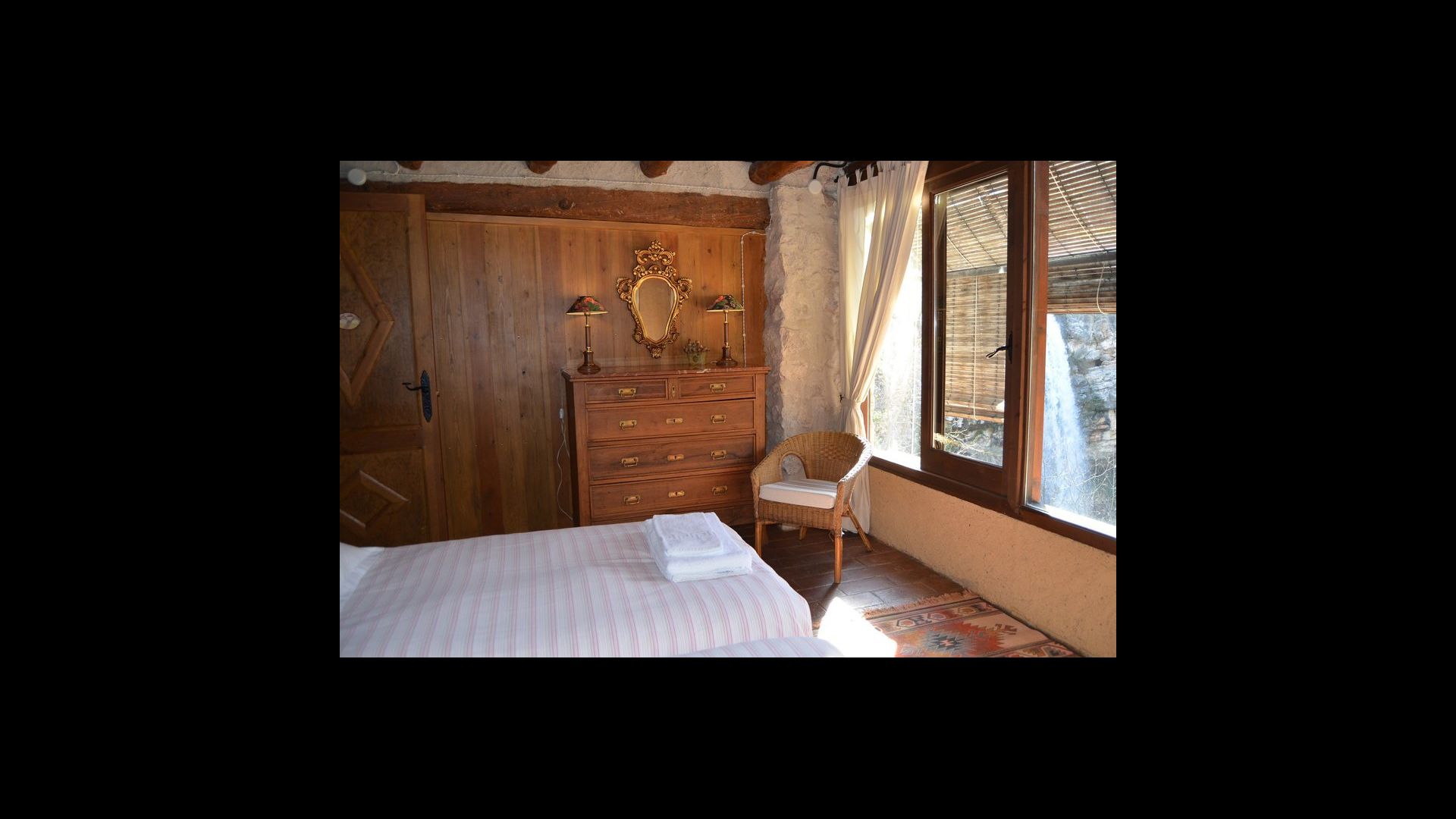 La casa té diversos nivells i la majoria de les habitacions donen a la cascada. Sota la planta principal dedicada a menjador, cuina i cantonera de sofà, hi ha dues habitacions i un bany. Directament des de la cuina, tens accés a l'acollidora & ldquo;terrassa matinal”, amb una vista preciosa a la cascada.