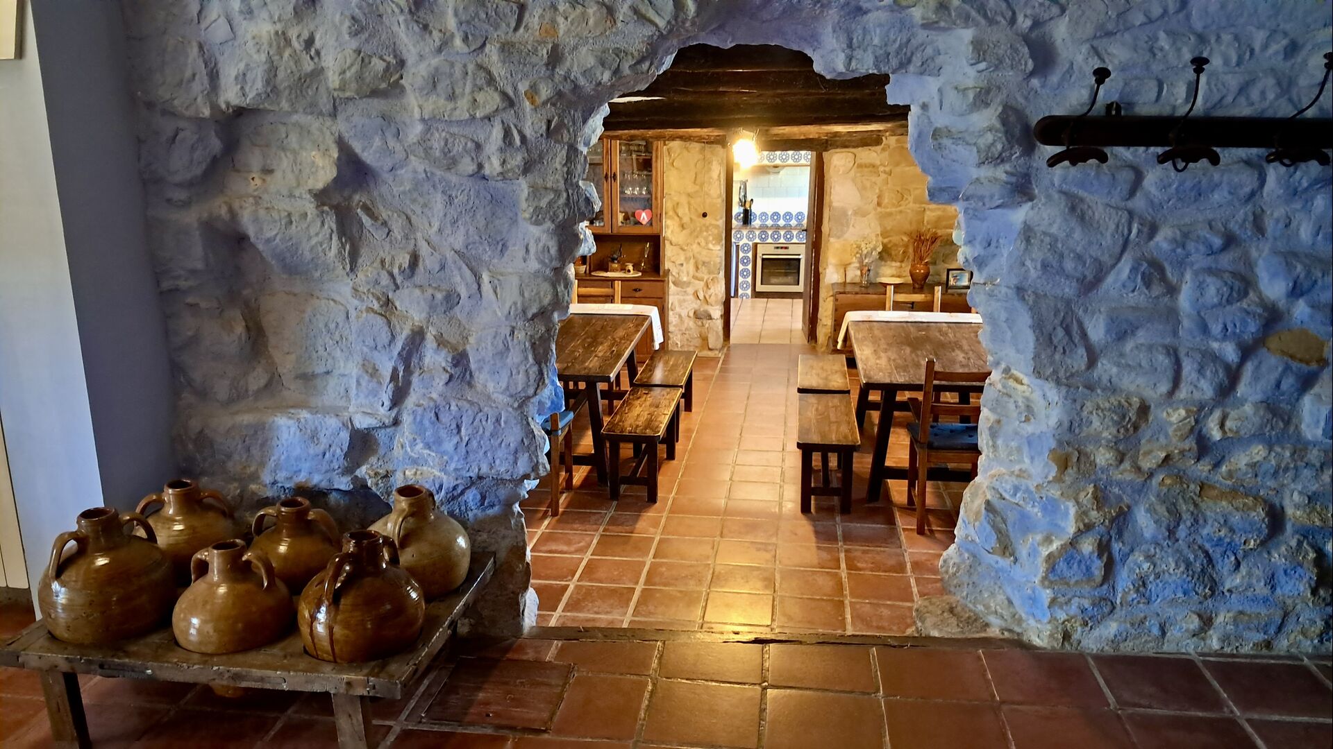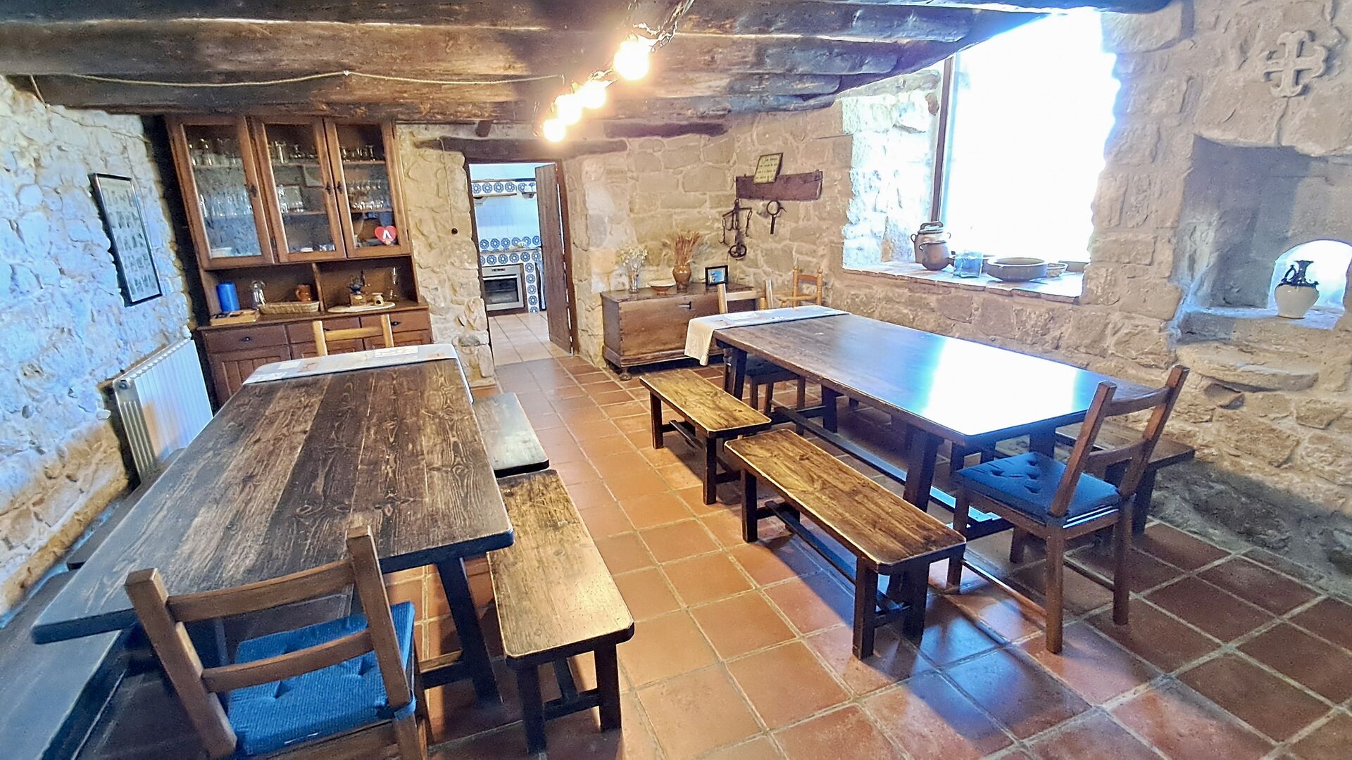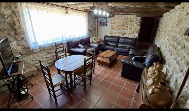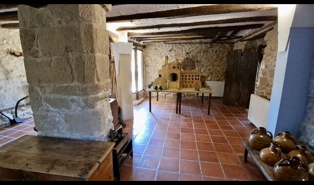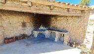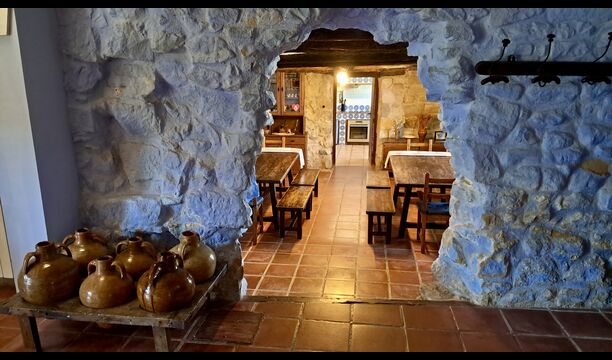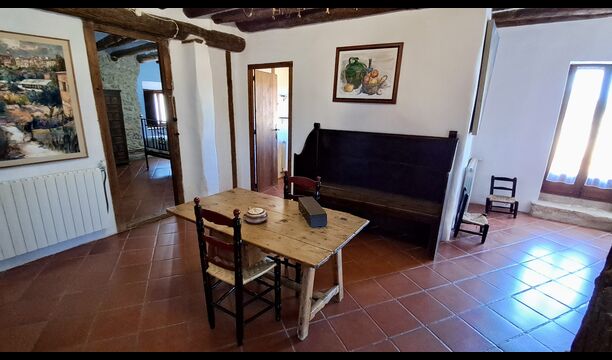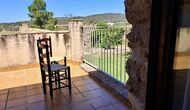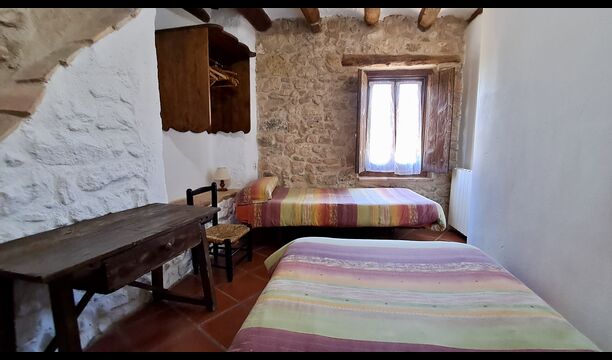 The ground floor furthermore offers a living room with sofas, flat screens, DVD machine, Wi-Fi and a characteristic old fireplace. In the Hall you find an exchange-book area and delicious local wines and olives, which you can buy at fair prices. A model of the famous monastery Convent de SantSalvador is also placed in the hall (the monastery is located in the nearby town ofHorta de Sant Joan). On the wall in the hallway hang old, antique agricultural tools that emphasize the traditional Catalan farmer style of the building.