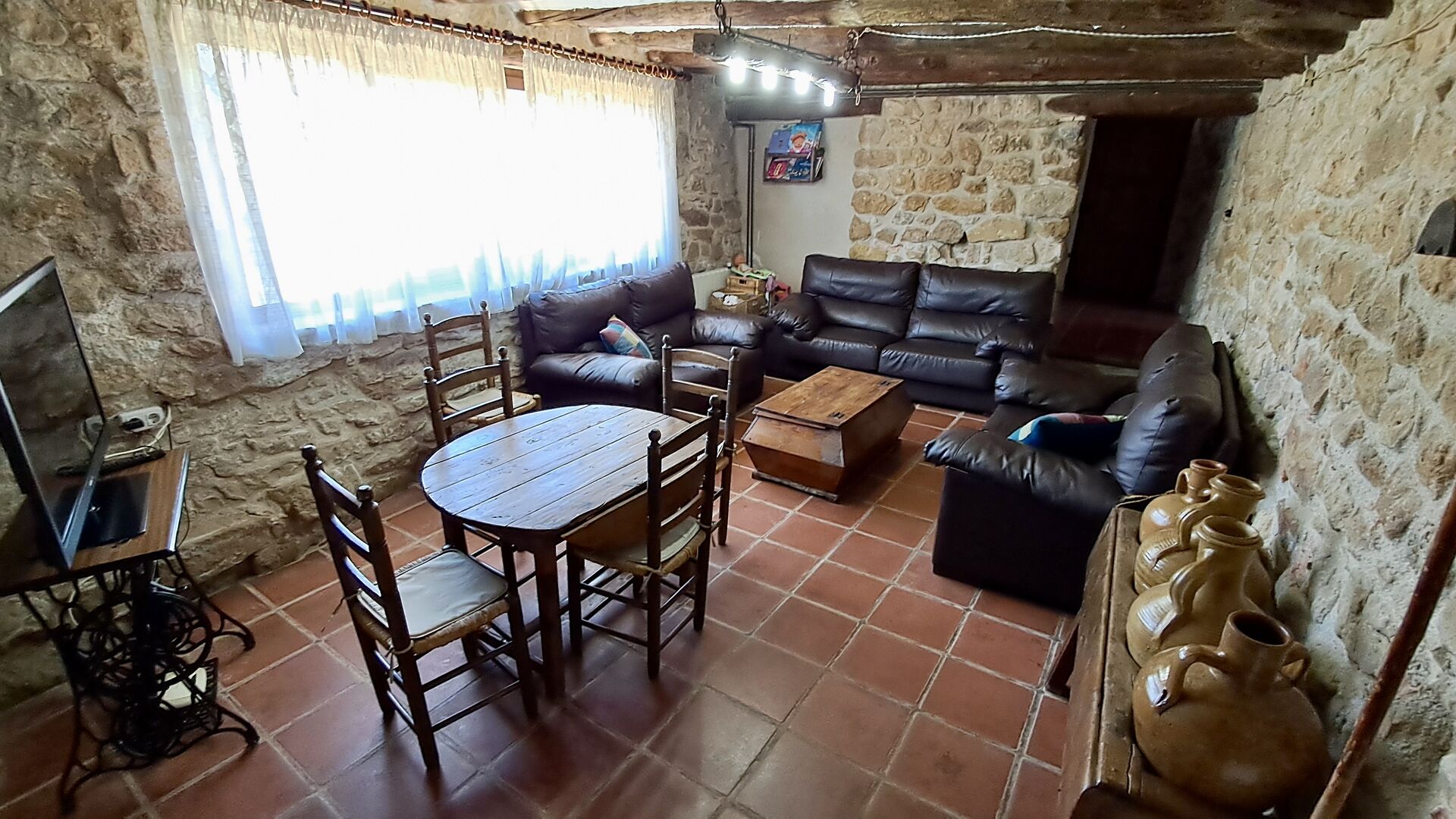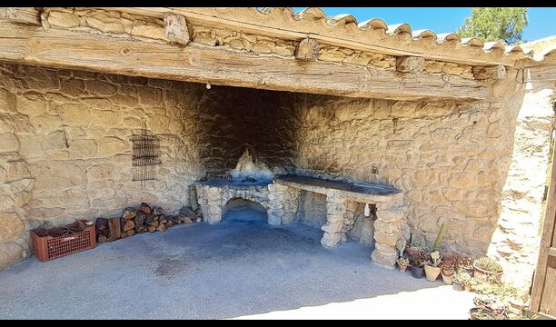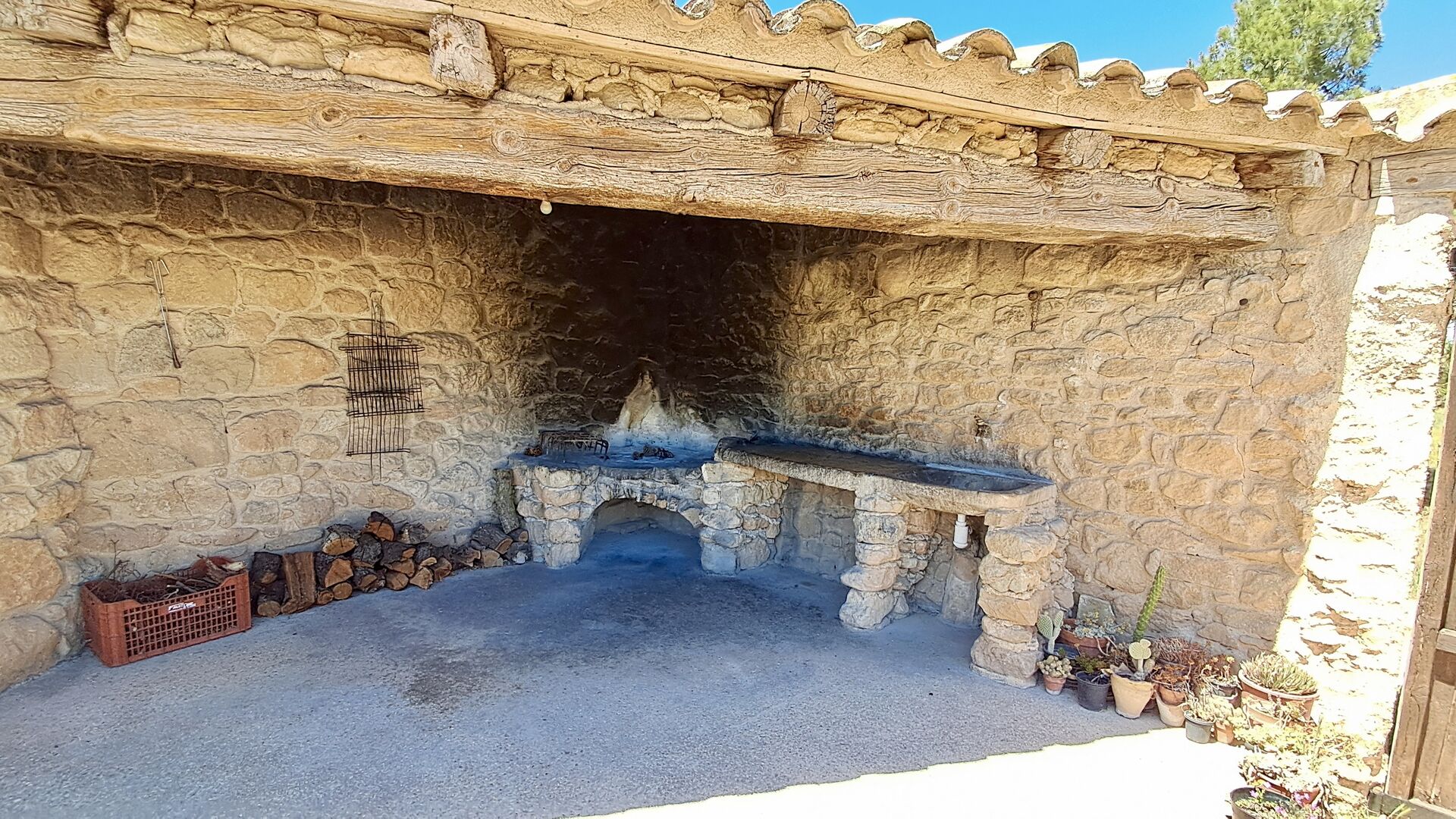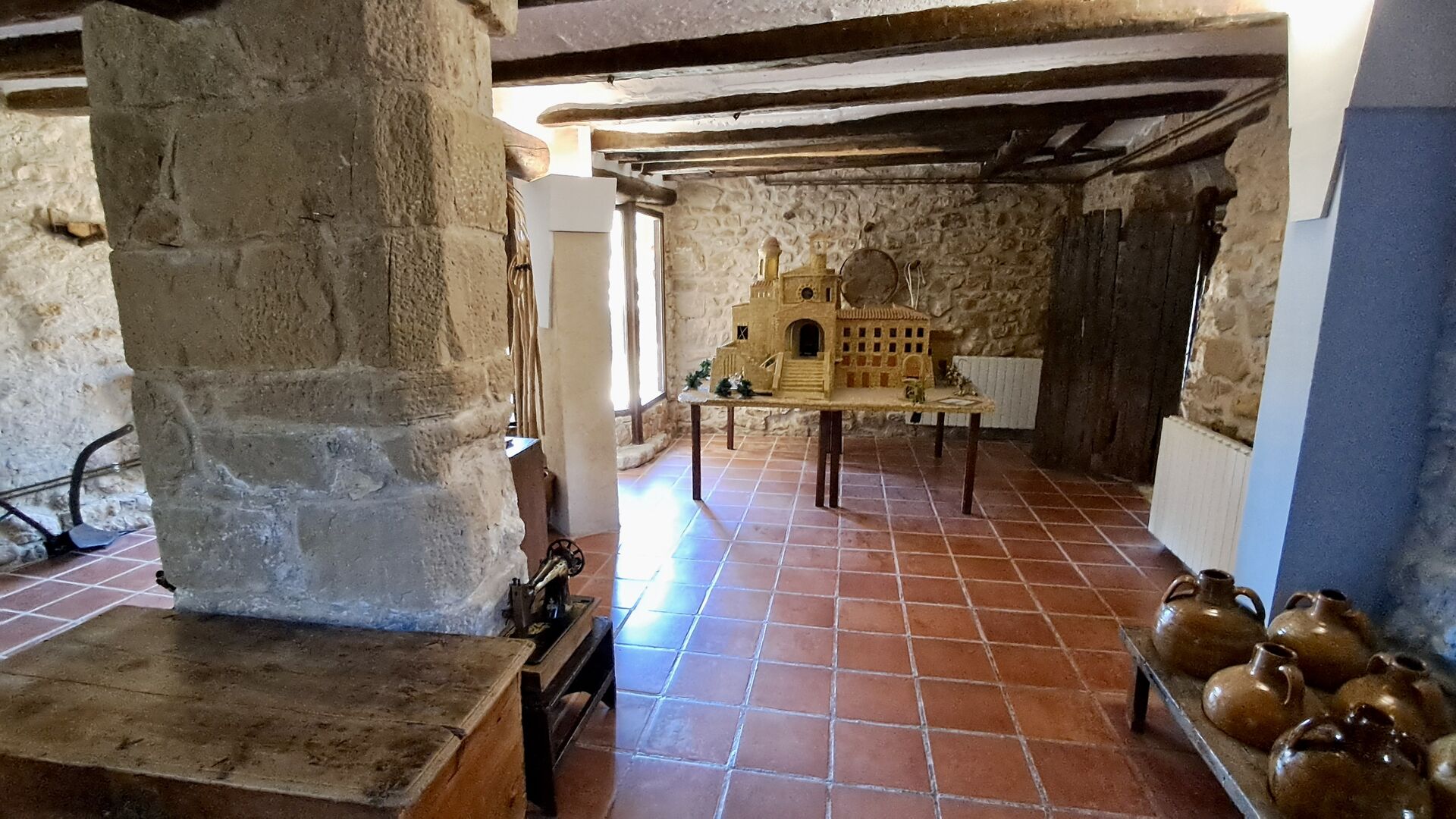 The ground floor furthermore offers a living room with sofas, flat screens, DVD machine, Wi-Fi and a characteristic old fireplace. In the Hall you find an exchange-book area and delicious local wines and olives, which you can buy at fair prices. A model of the famous monastery Convent de SantSalvador is also placed in the hall (the monastery is located in the nearby town ofHorta de Sant Joan). On the wall in the hallway hang old, antique agricultural tools that emphasize the traditional Catalan farmer style of the building.