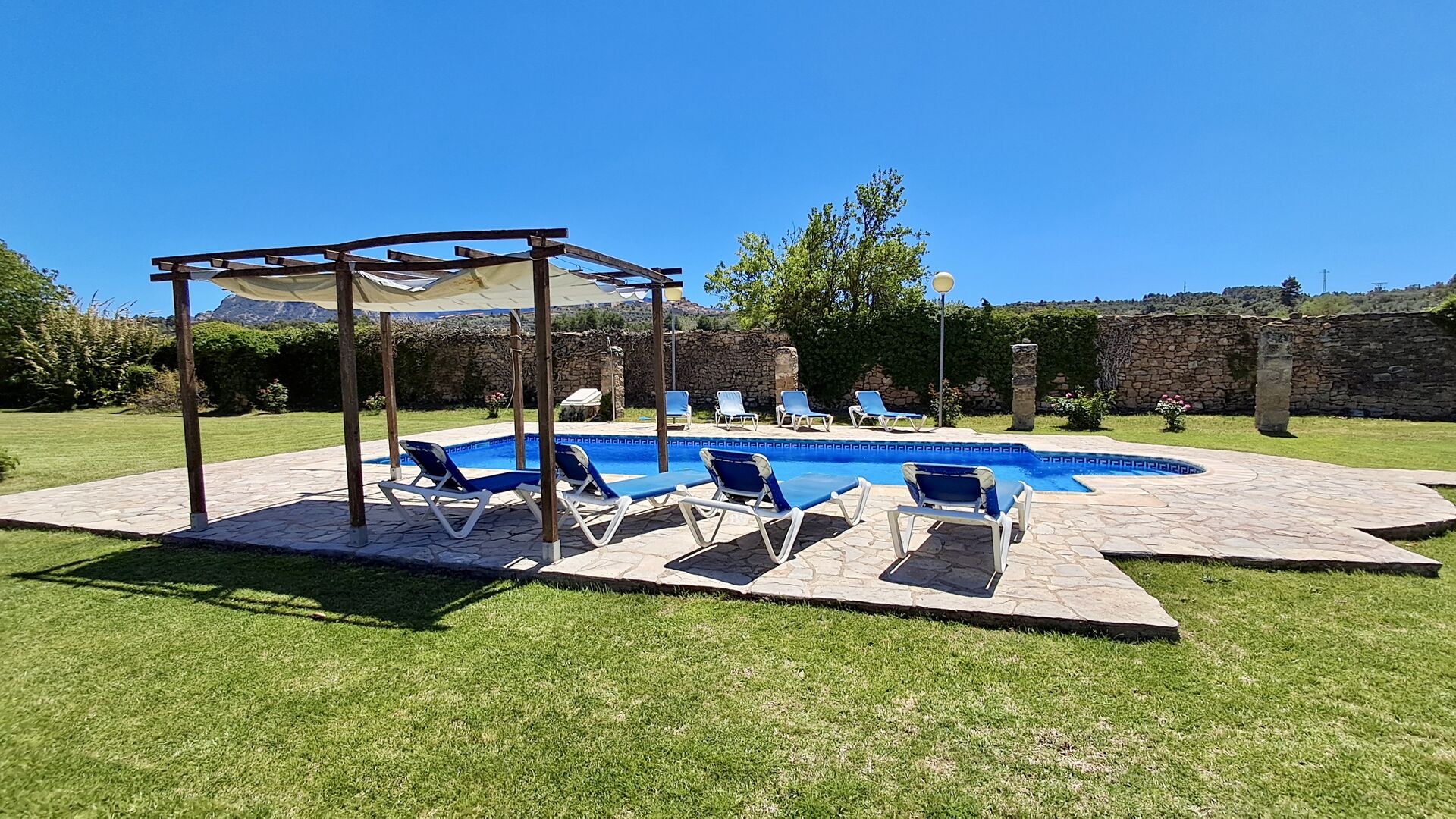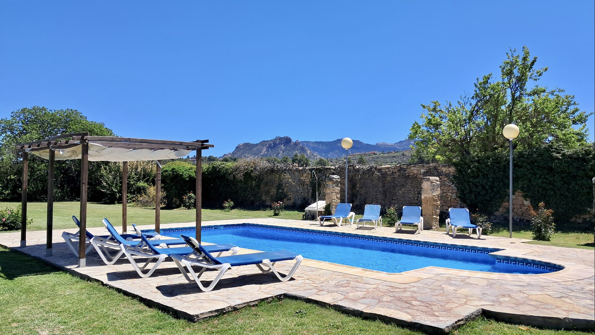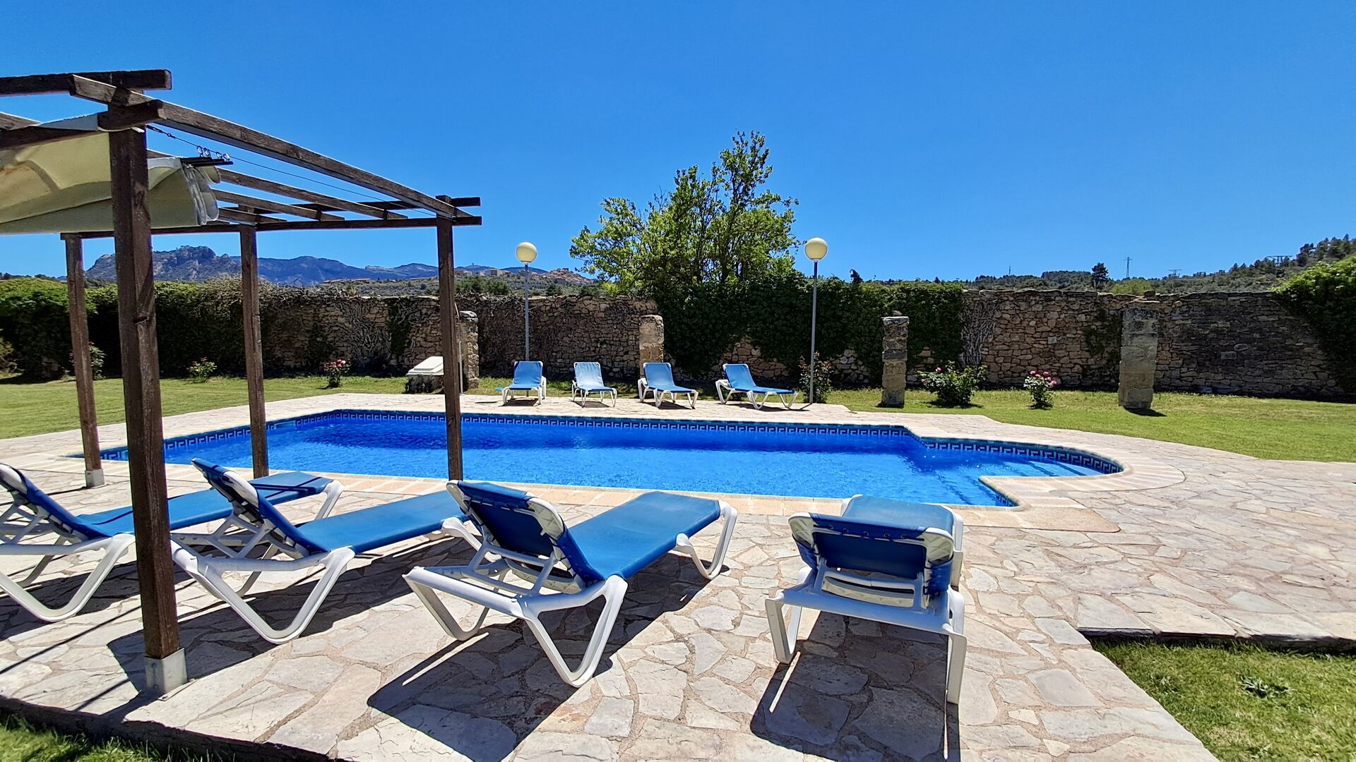 On your arrival at Mas de Rei Pedro you firstly notice the beautiful outdoor facilities. First and foremost, the large private pool (50 m2) with a surrounding pool area where you can enjoy the warm days - either with a good book in the many sun beds or by playing and swimming in the cooling water. The town is located on a hilltop, and from the garden you can enjoy the view of the charming rooftops.