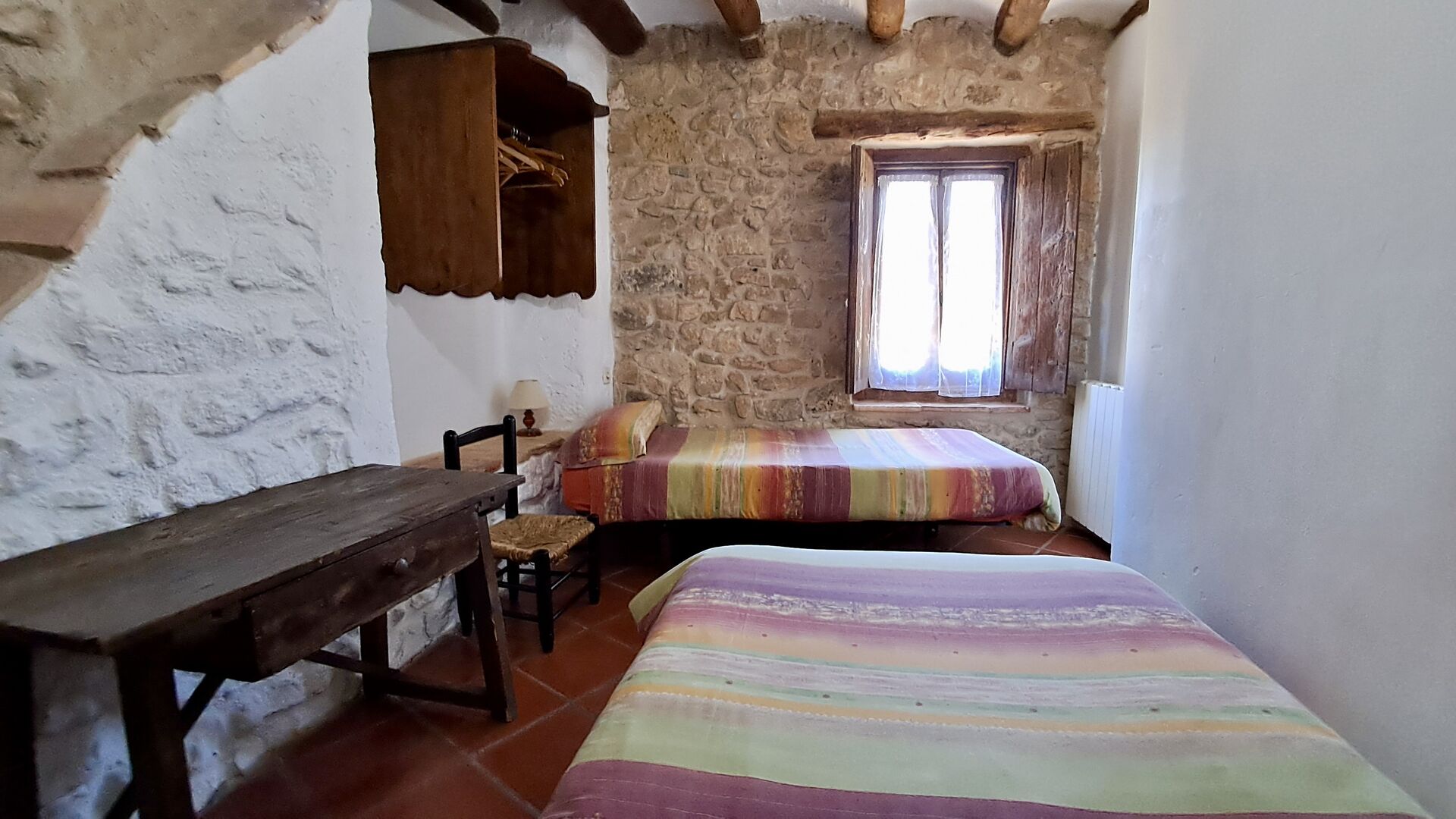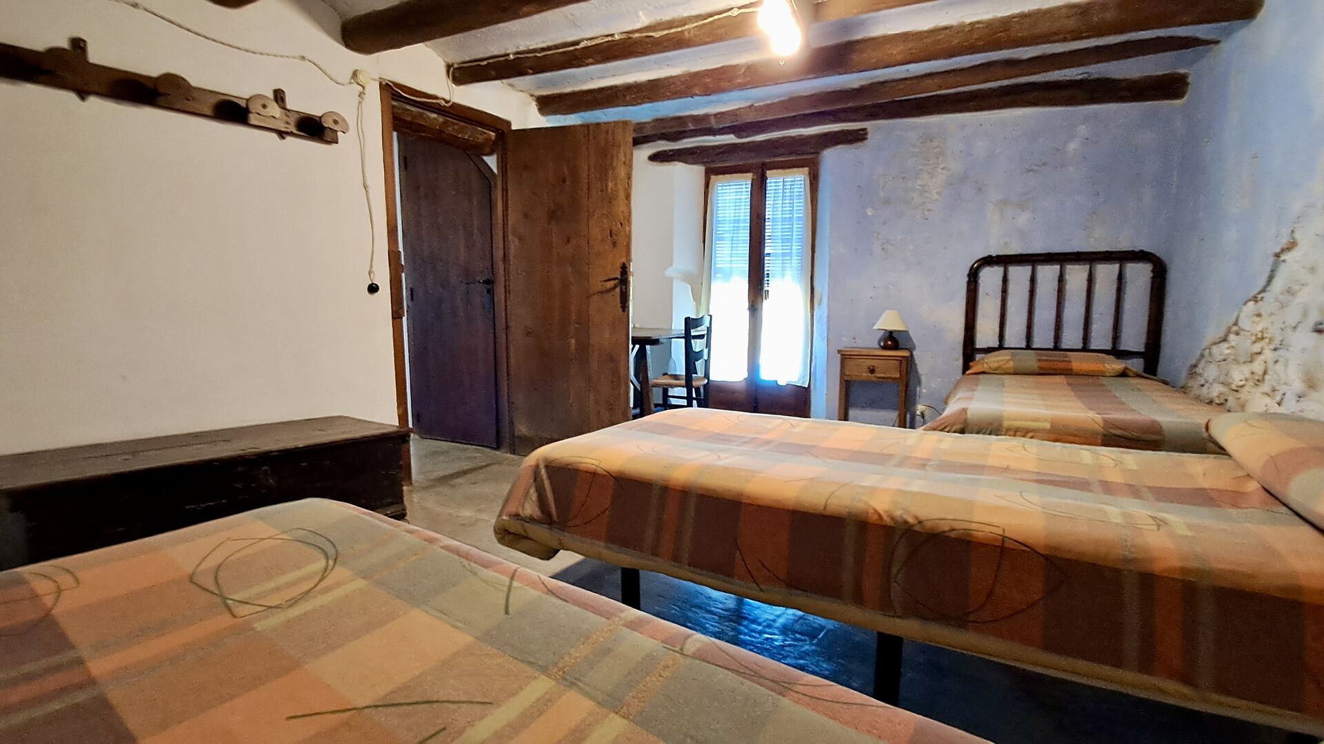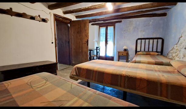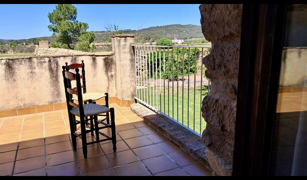 On the top floor are a total of five bedrooms, including 4 double rooms and 1 triple room. 2 of the rooms have double beds, 2 have twin beds and the triple room has a double bed and a single bed. All rooms are decorated in old Catalan farmer style. One of the most beautiful bed frames is more than 300 years old and 200 years ago the king Pedro slept there (the mattresses are of course replaced many times since :) ). On the terrace of the first floor you can enjoy your morning coffee, the evening sun, and the view of the garden and the cosy town ofHorta de Saint Joan in the horizon.