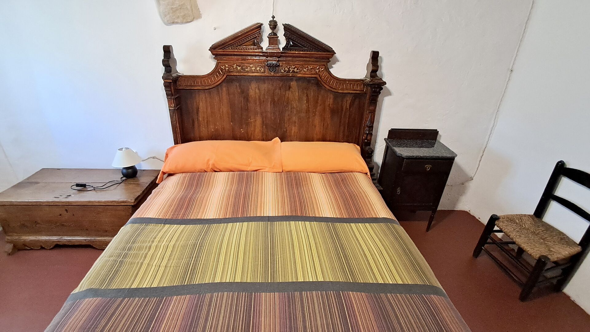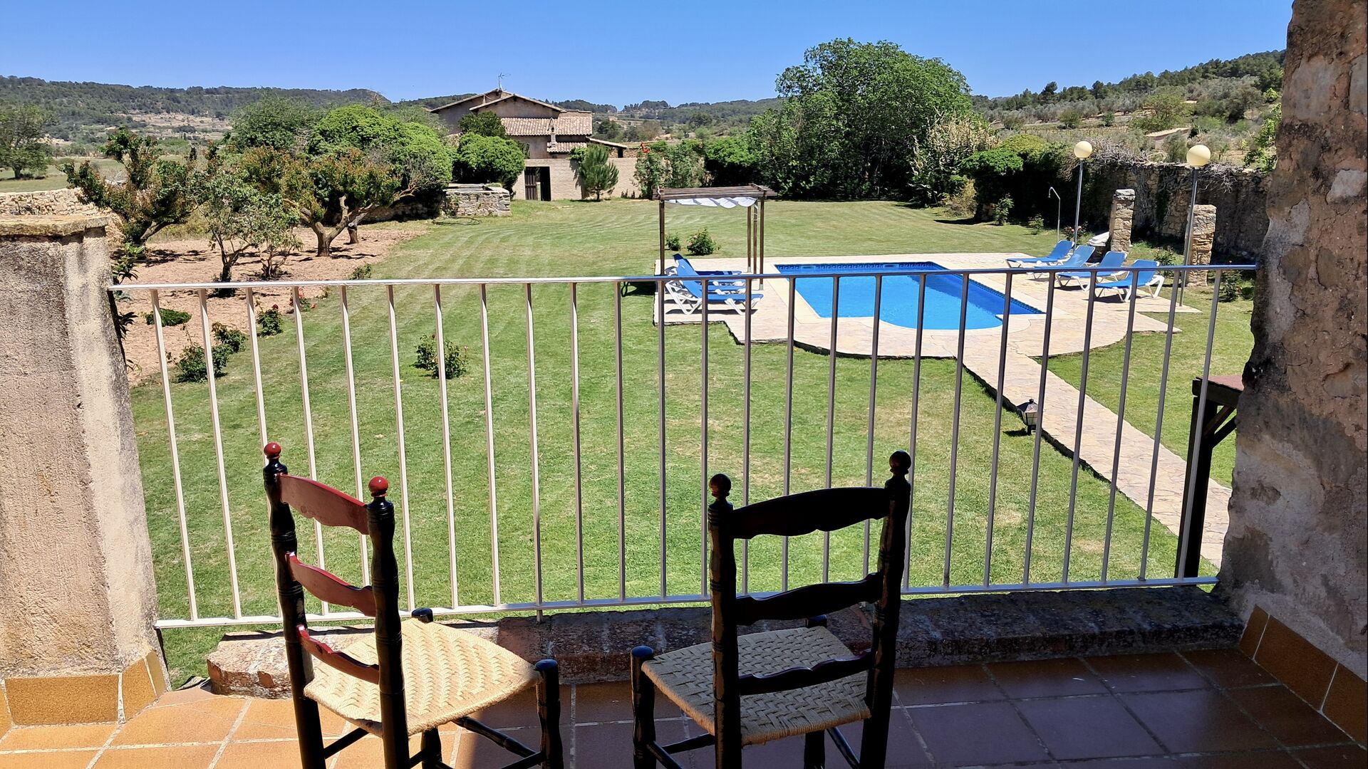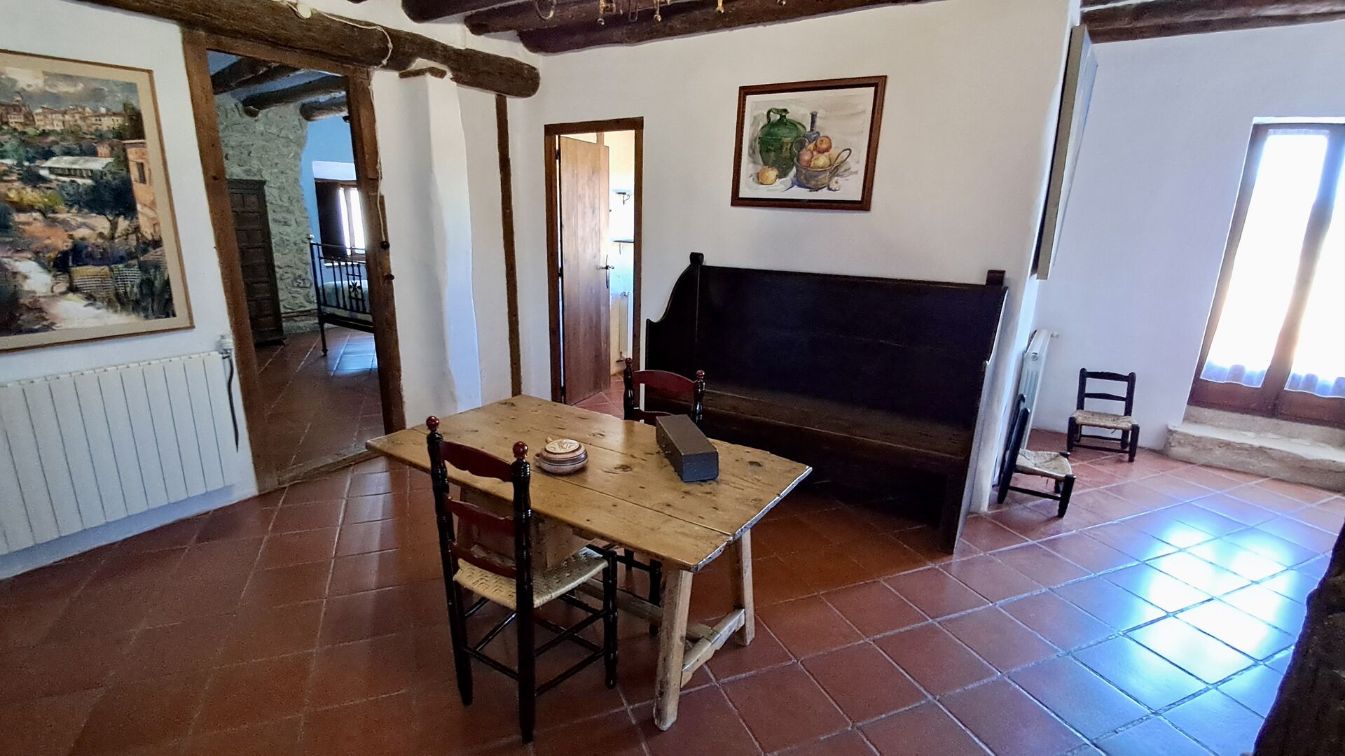 On the top floor are a total of five bedrooms, including 4 double rooms and 1 triple room. 2 of the rooms have double beds, 2 have twin beds and the triple room has a double bed and a single bed. All rooms are decorated in old Catalan farmer style. One of the most beautiful bed frames is more than 300 years old and 200 years ago the king Pedro slept there (the mattresses are of course replaced many times since :) ). On the terrace of the first floor you can enjoy your morning coffee, the evening sun, and the view of the garden and the cosy town ofHorta de Saint Joan in the horizon.