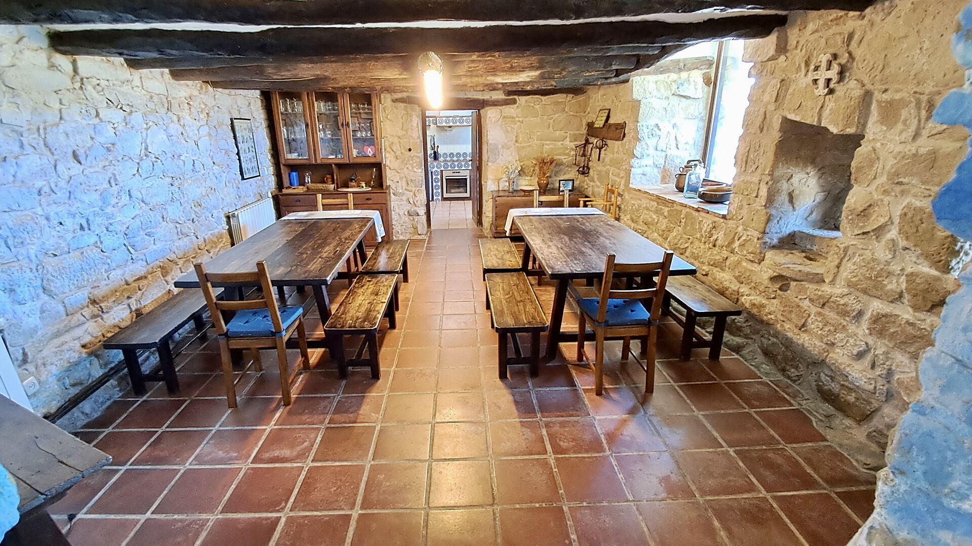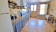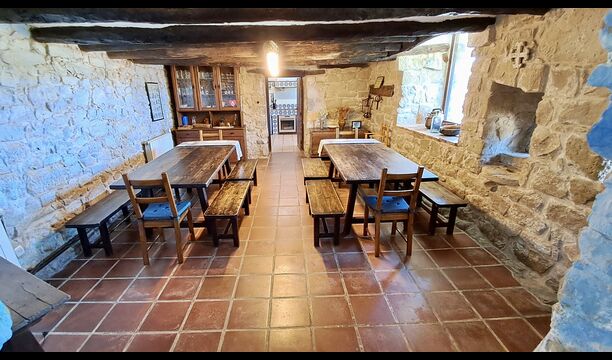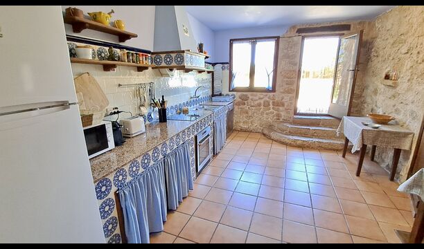 From the large garden with pool and small flowers beds, you can reach the kitchen by direct entrance from the terrace. The kitchen is in classic Catalan style with the necessary kitchen facilities. Many of the more authentic and worn parts are still in the holiday home and give the house a very classic style. It is perfect for those, who value the historical touch and do not mind that not all details are up to date and new. On the ground floor there is also an extra room with iron, ironing board, washing machine, extra fridge, and freezer. There is access to the indoor dining room from the kitchen.