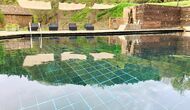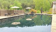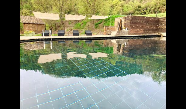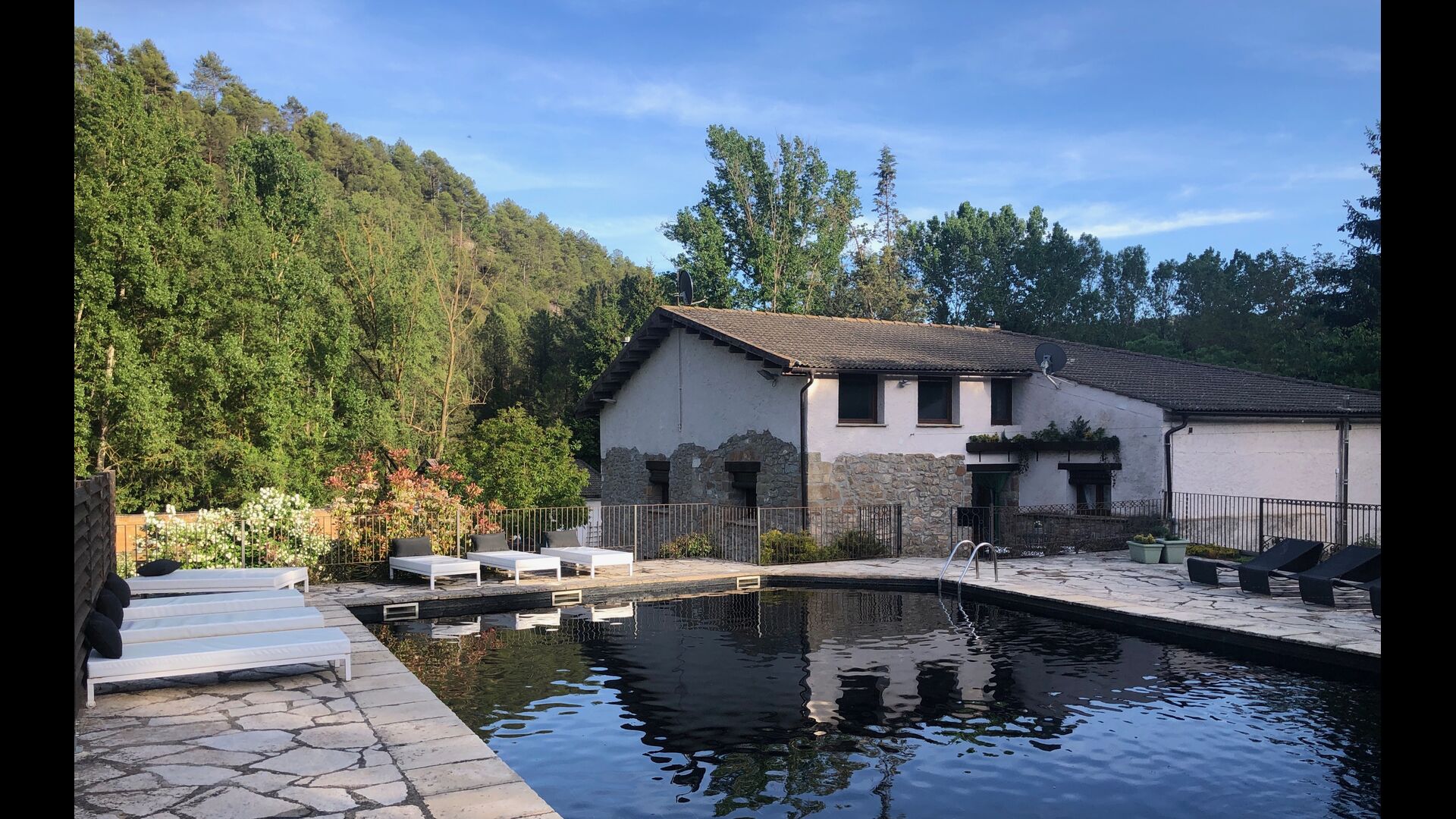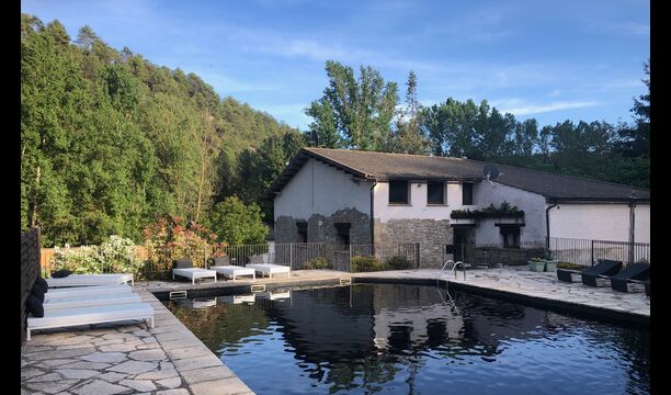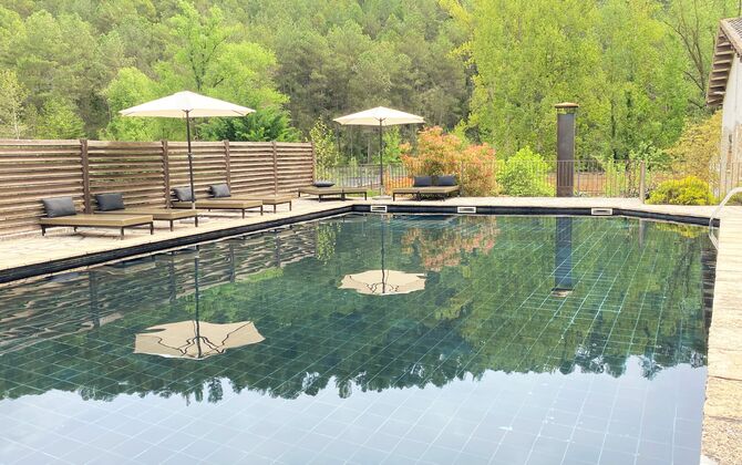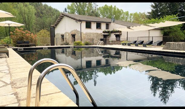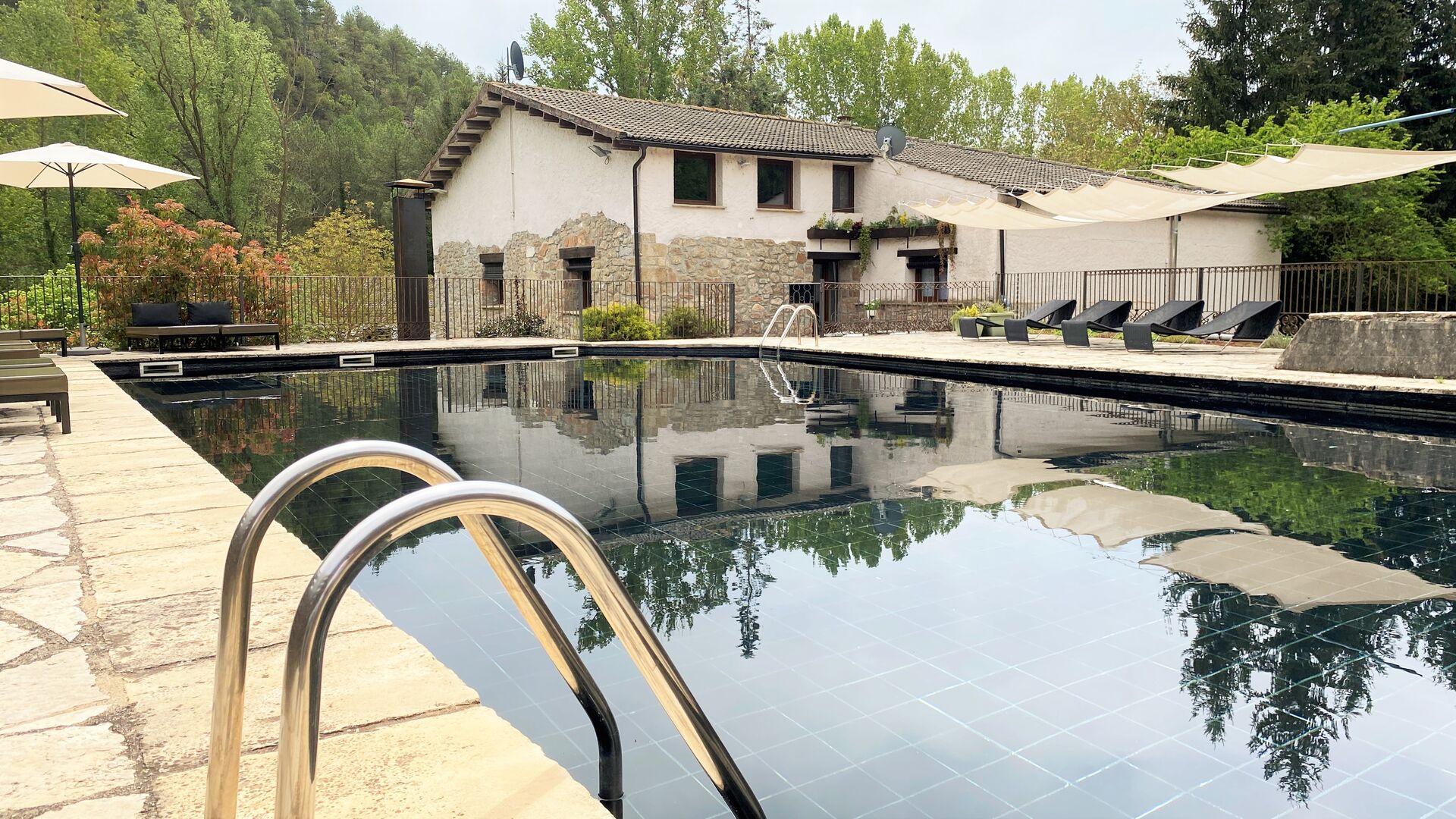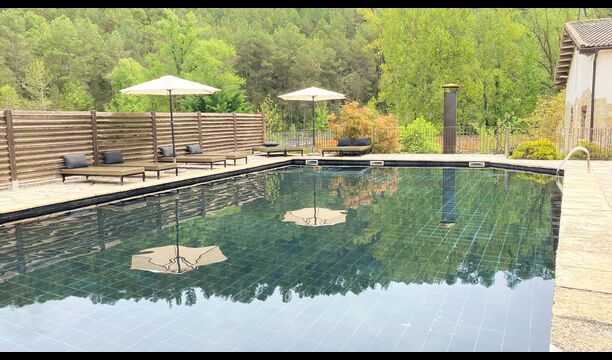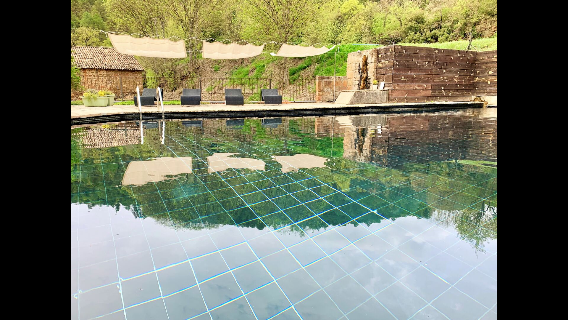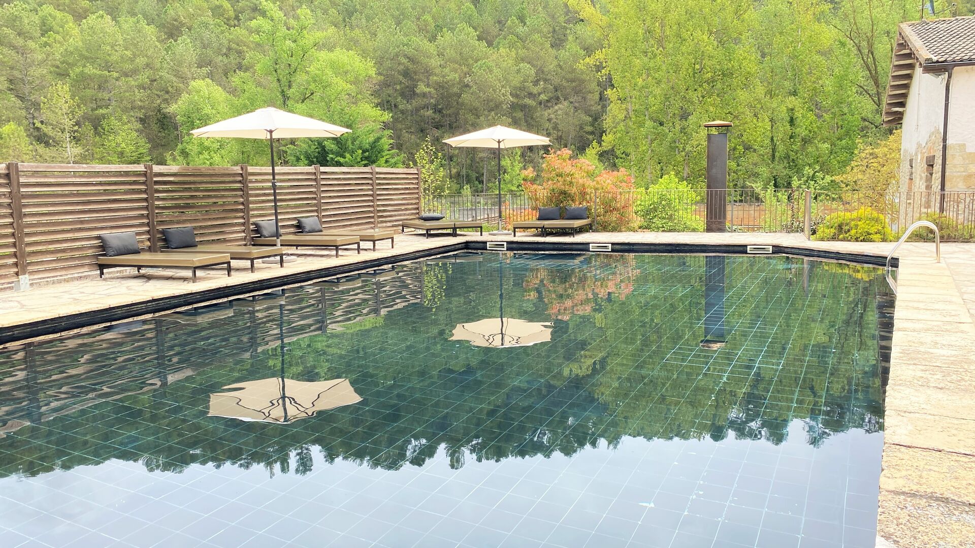 Una piscina diferent per les seves rajoles negres, les gandules i els para-sols que conviden al descans tan merescut. Espai tancat per a la seguretat dels nens.