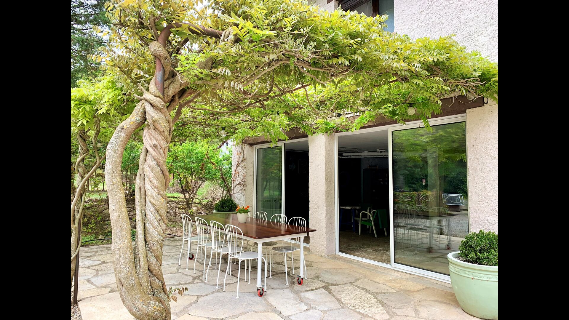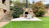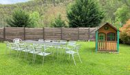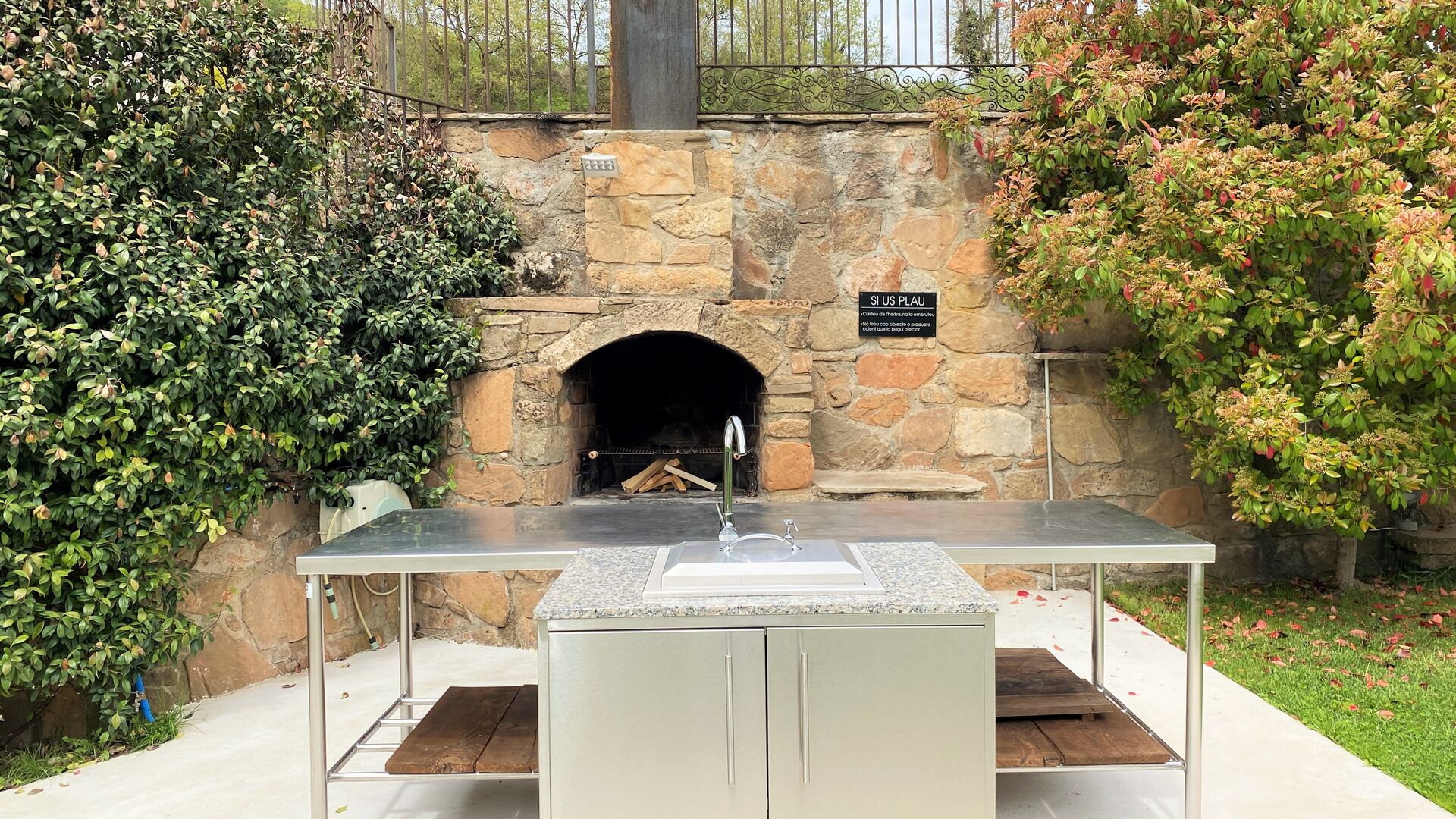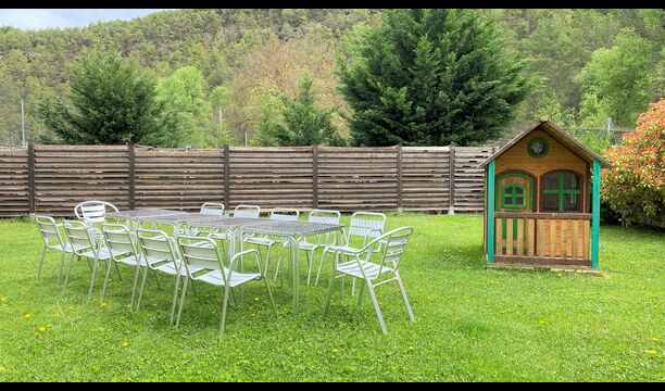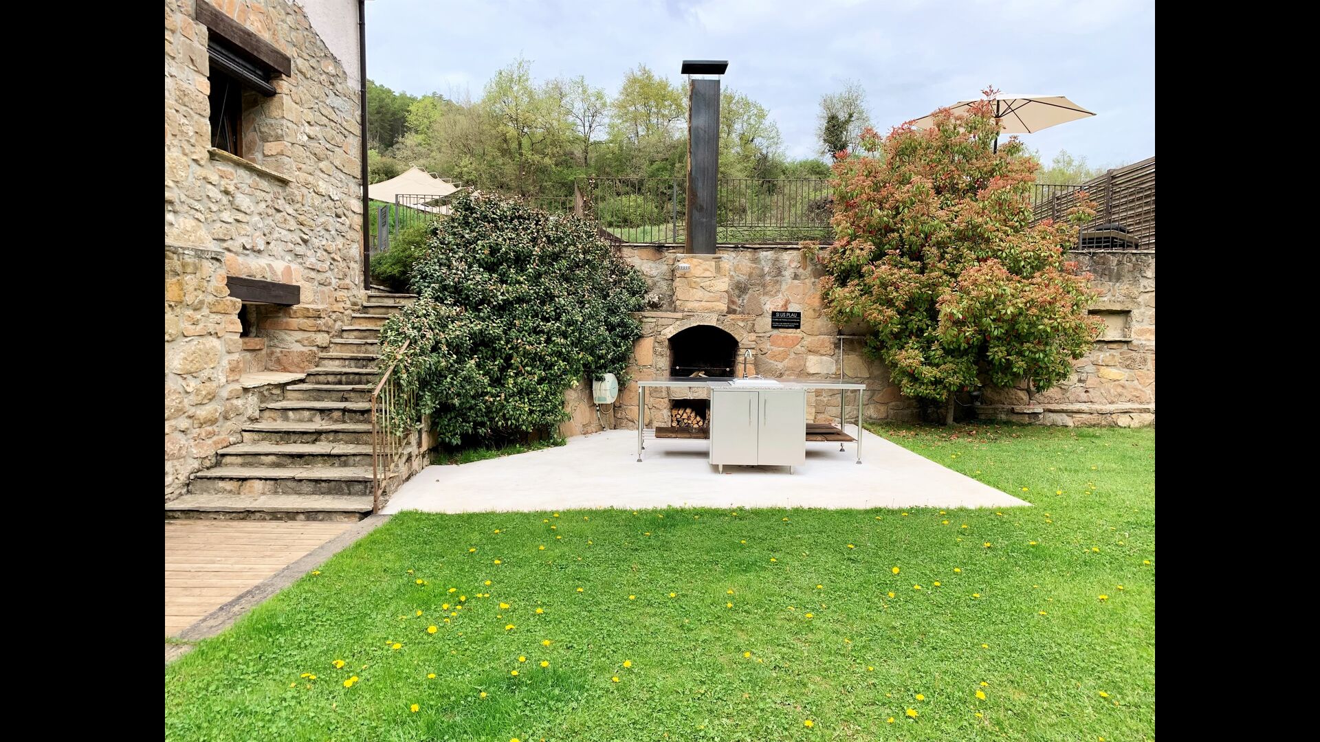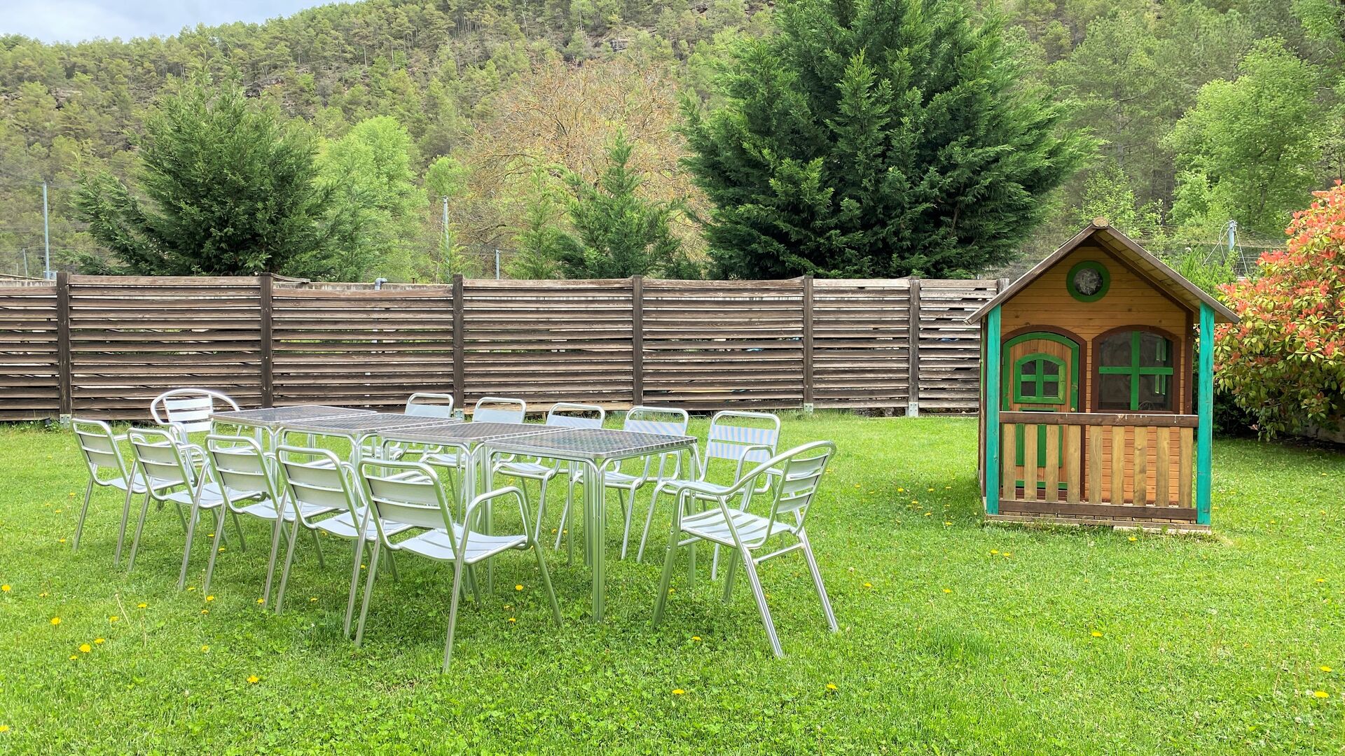 El jardí un ampli espai amb gespa, barbacoa, taules i cadires