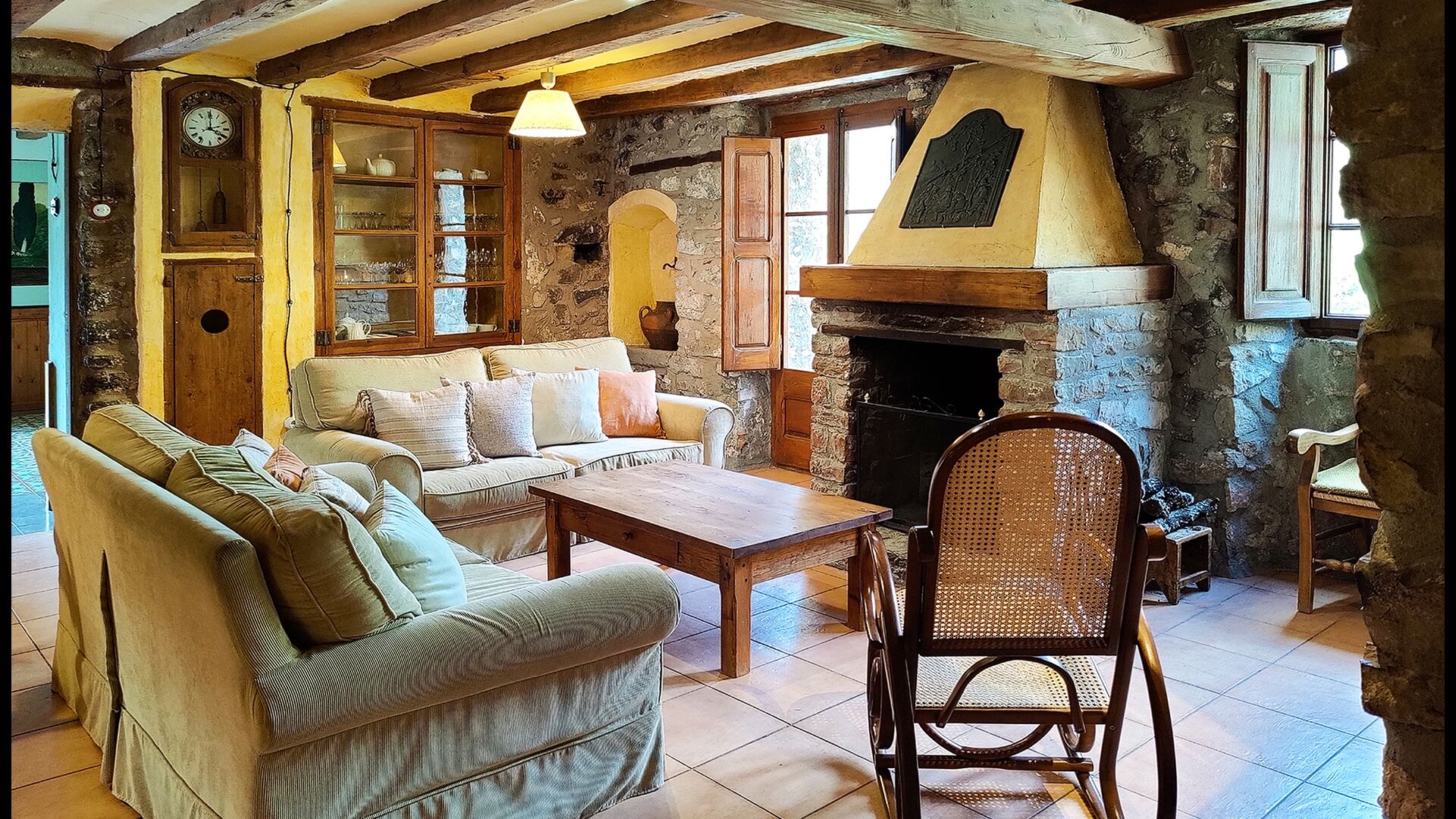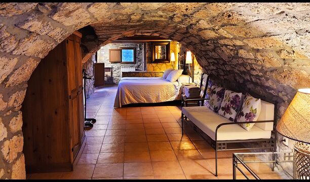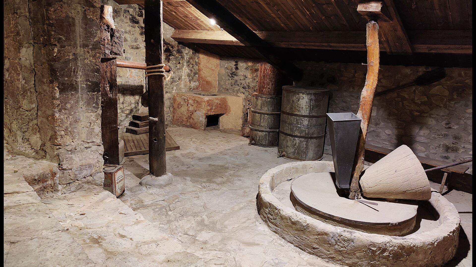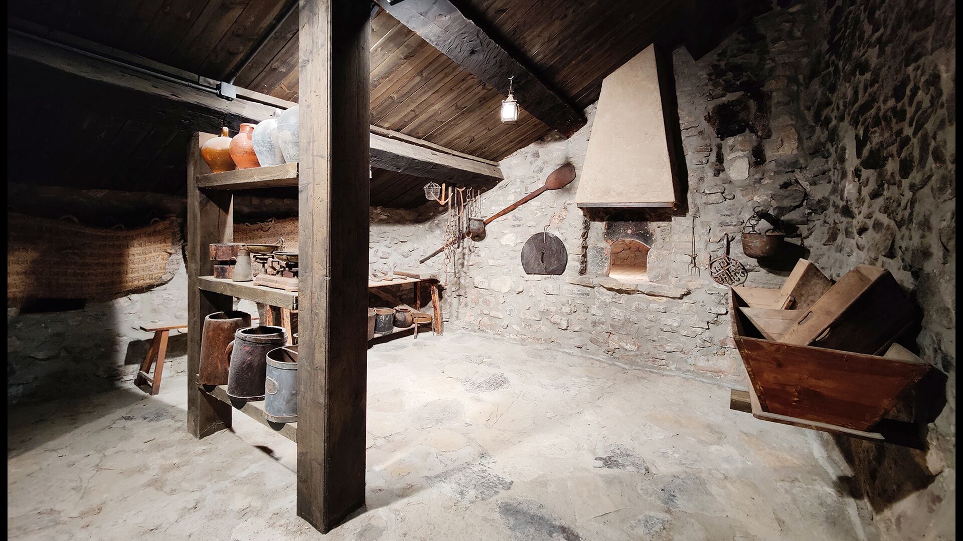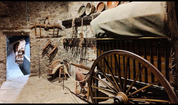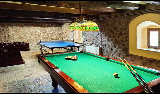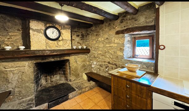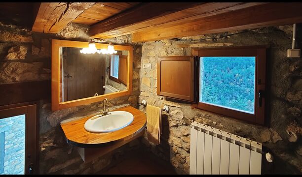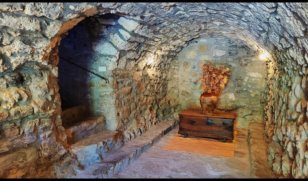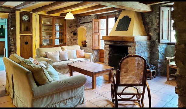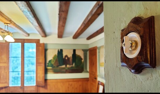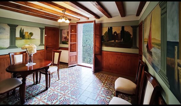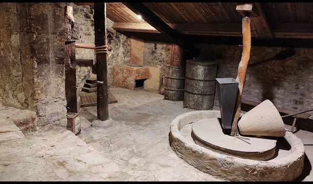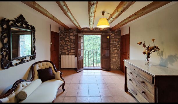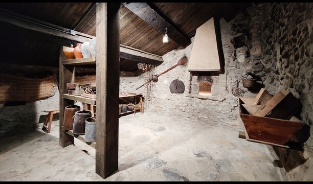 La propietat compta amb gruixuts murs de pedra, una sòlida porta d’entrada de fusta i fins i tot frescos del segle XVIII conservats, que reflecteixen la llarga història d’aquesta finca rural tradicional. Una petita capella i un museu connectats amb la casa mostren eines i espais que il·lustren la vida quotidiana d’una antiga explotació agrícola de muntanya autosuficient.