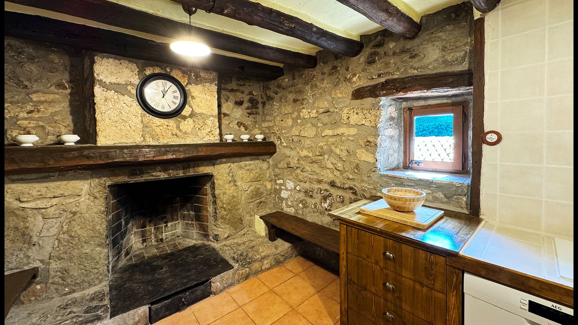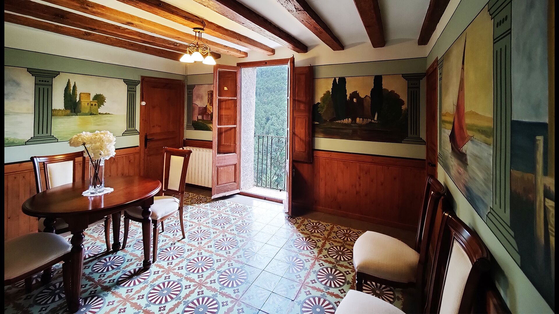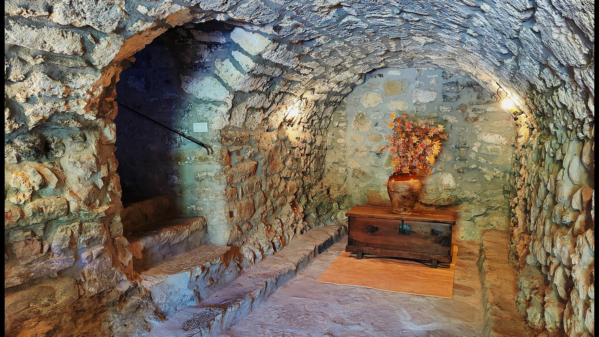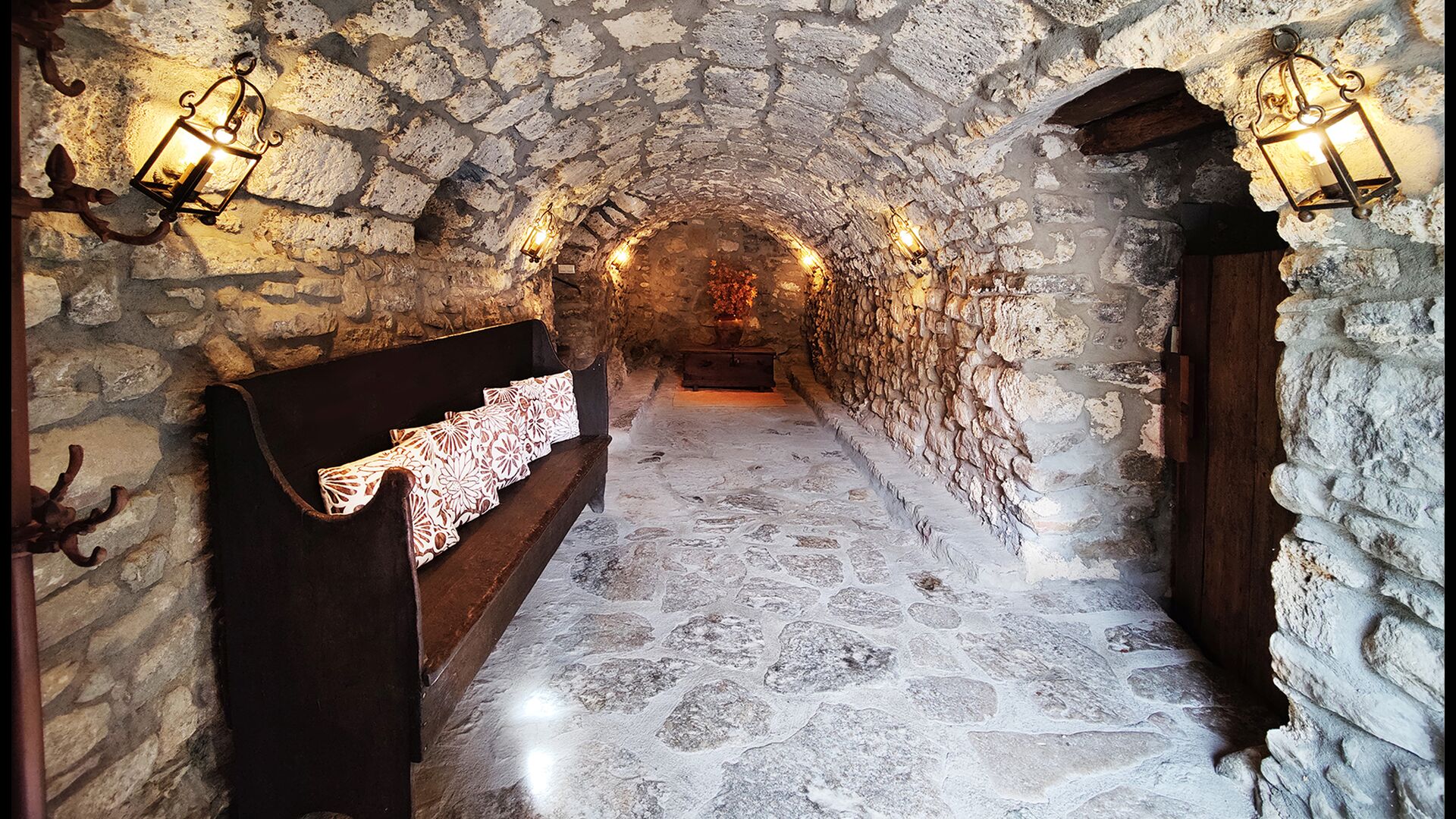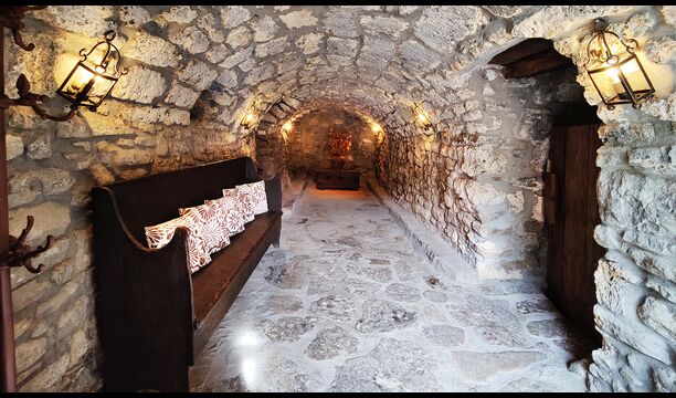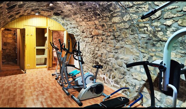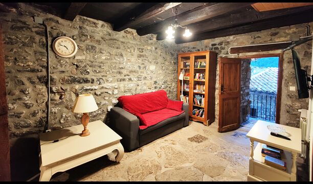 La propietat compta amb gruixuts murs de pedra, una sòlida porta d’entrada de fusta i fins i tot frescos del segle XVIII conservats, que reflecteixen la llarga història d’aquesta finca rural tradicional. Una petita capella i un museu connectats amb la casa mostren eines i espais que il·lustren la vida quotidiana d’una antiga explotació agrícola de muntanya autosuficient.
