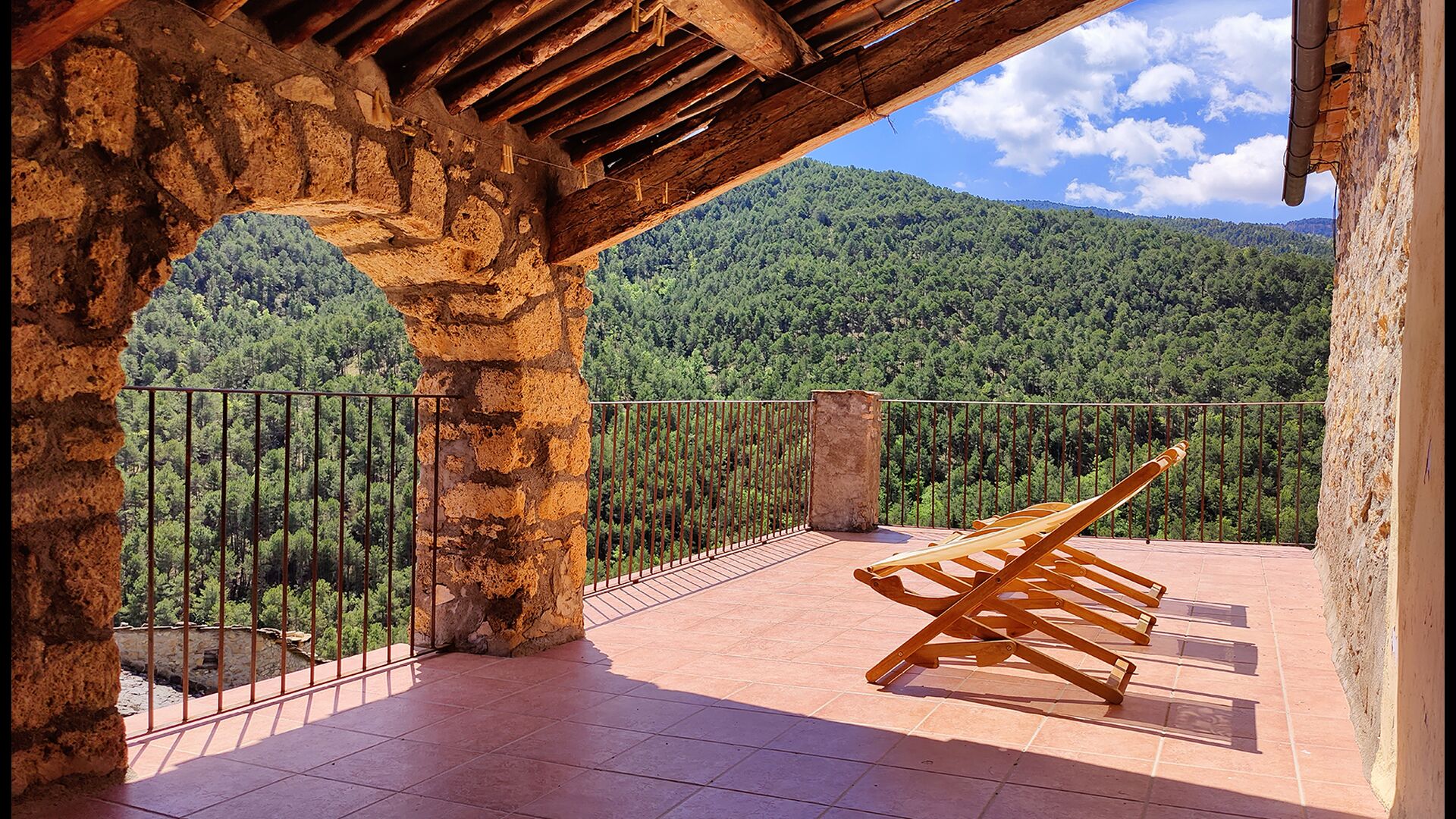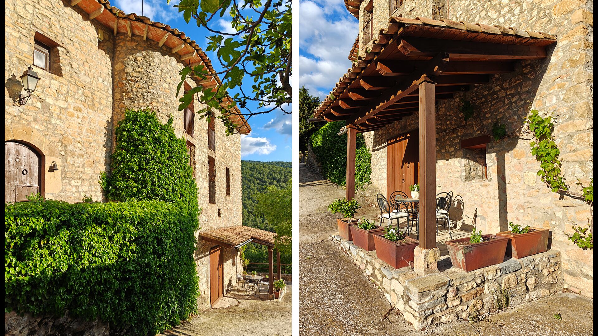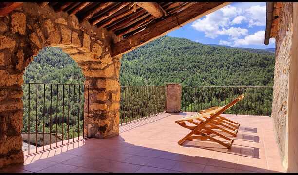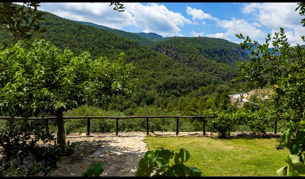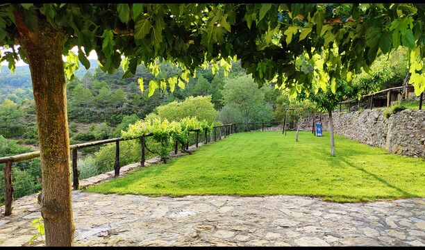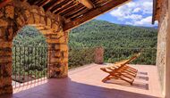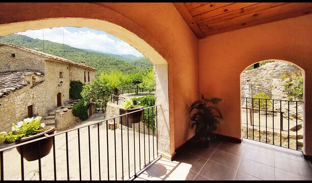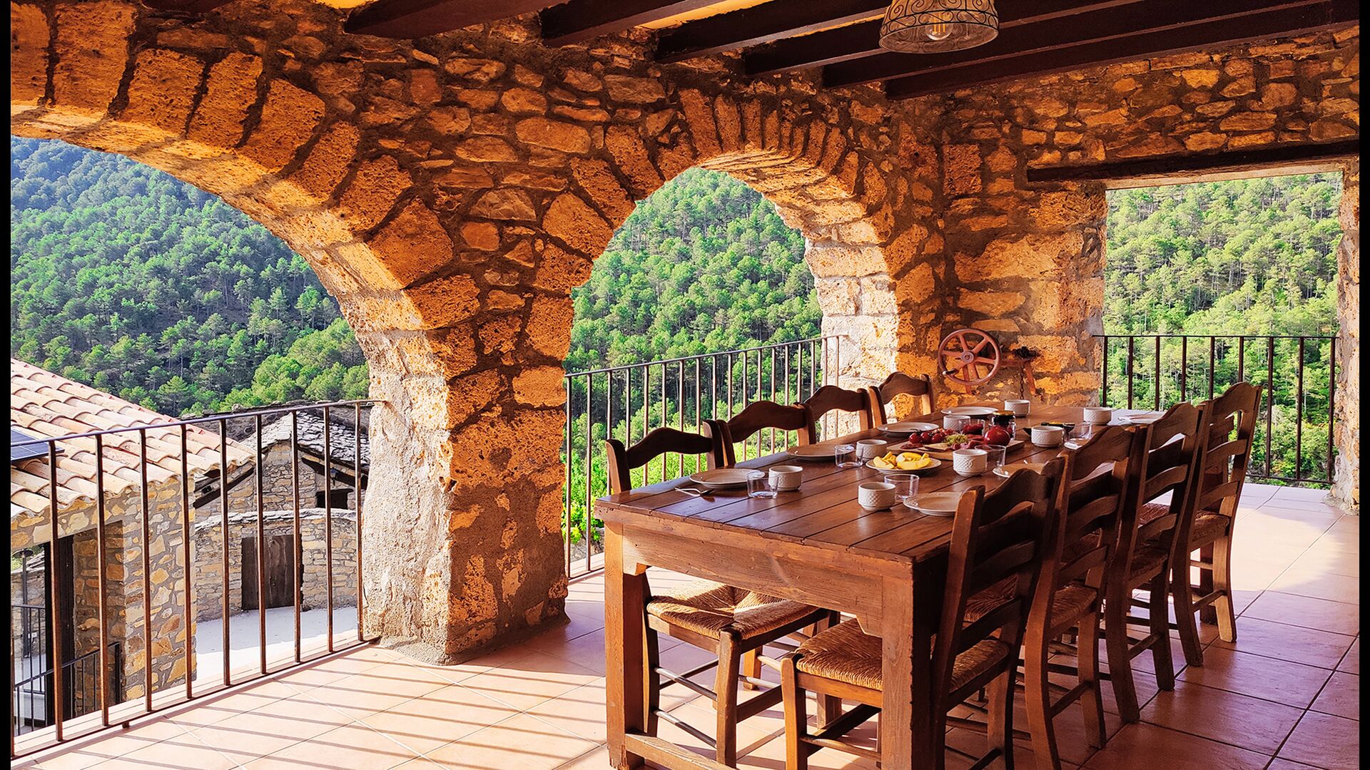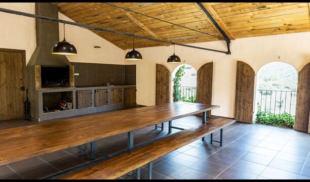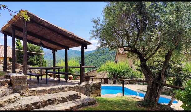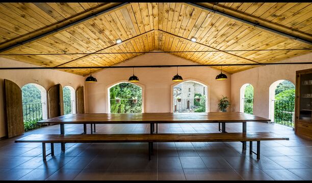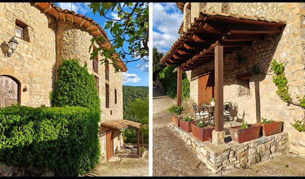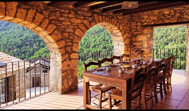 La terrassa coberta és un dels espais més encantadors de la casa, perfecte per esmorzar o relaxar-se mentre s’escolta el proper torrent de Valldarques.