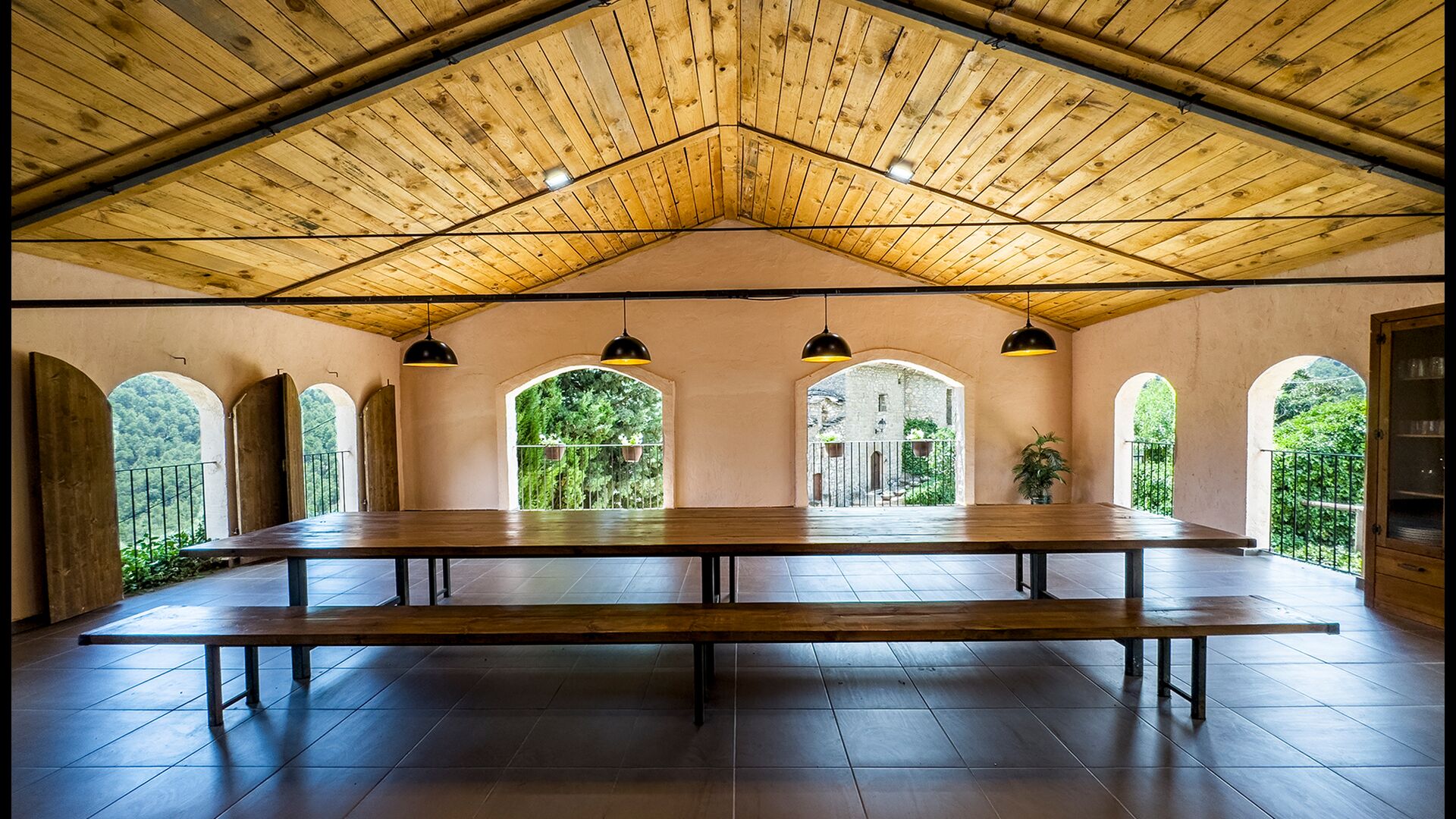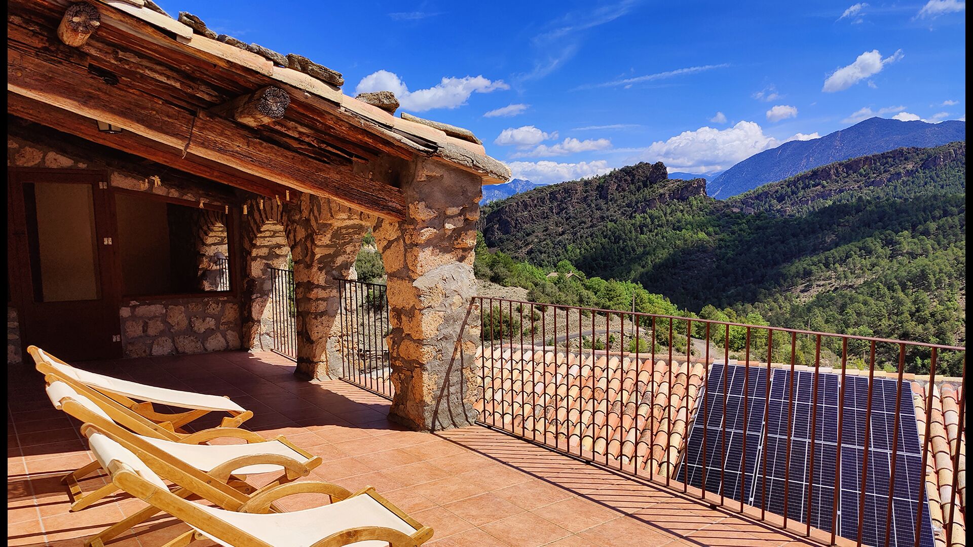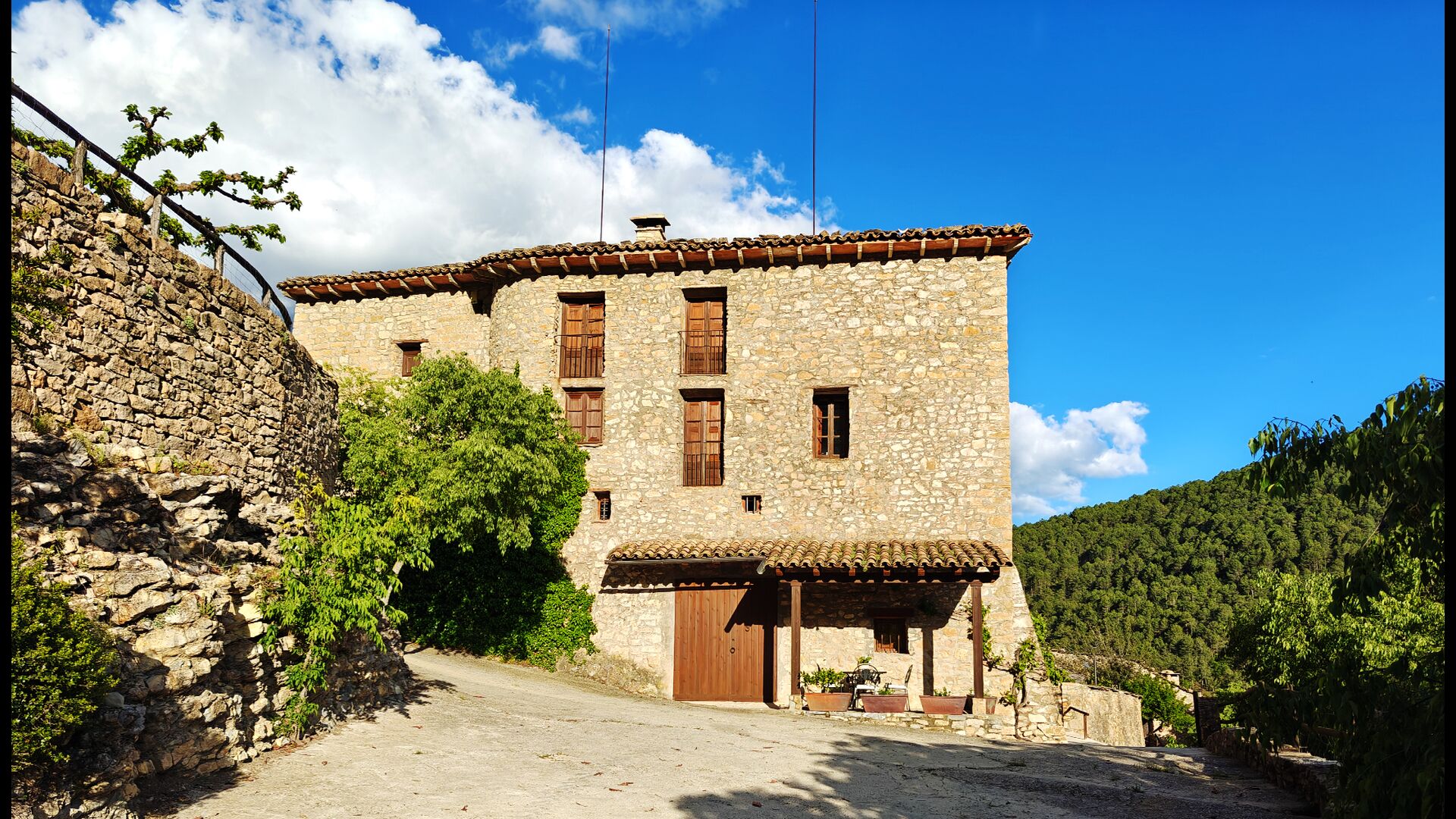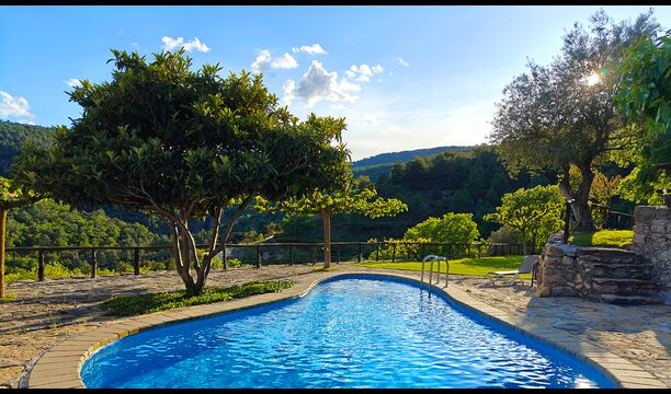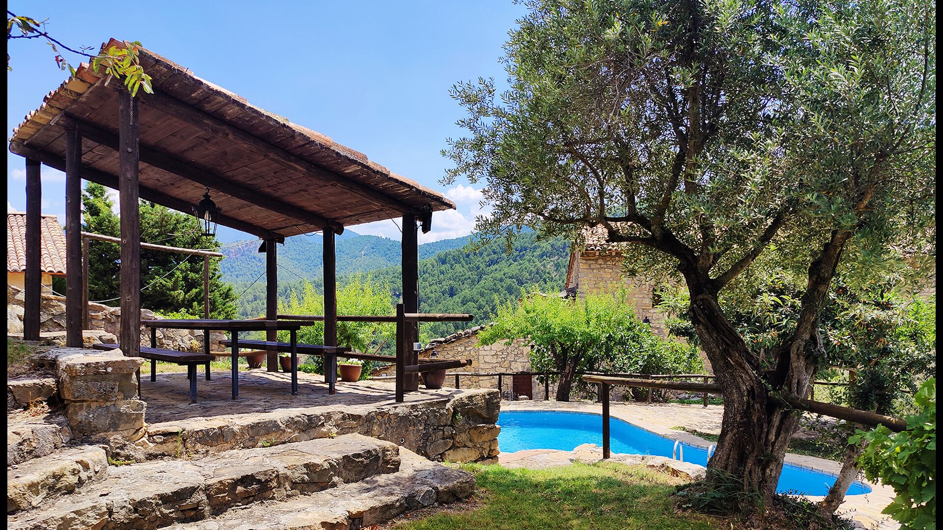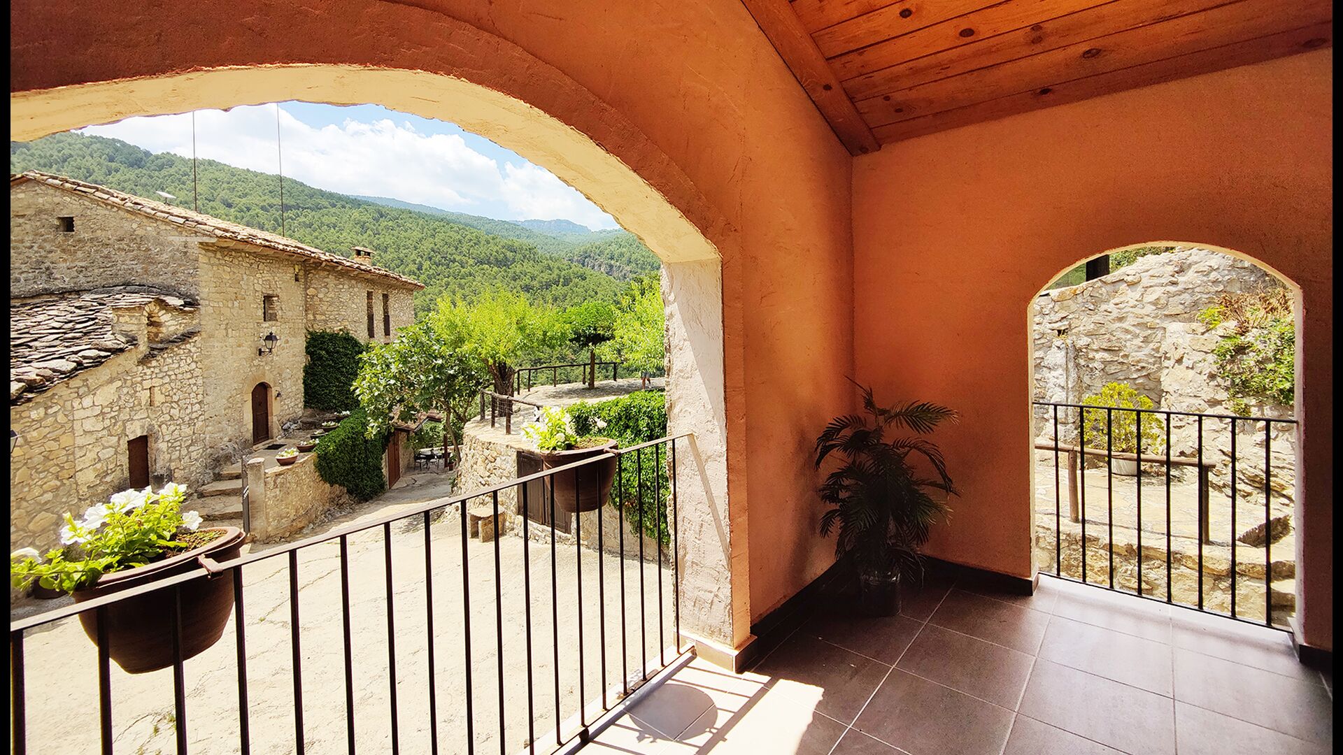 La terrassa coberta és un dels espais més encantadors de la casa, perfecte per esmorzar o relaxar-se mentre s’escolta el proper torrent de Valldarques.