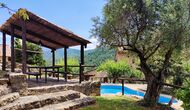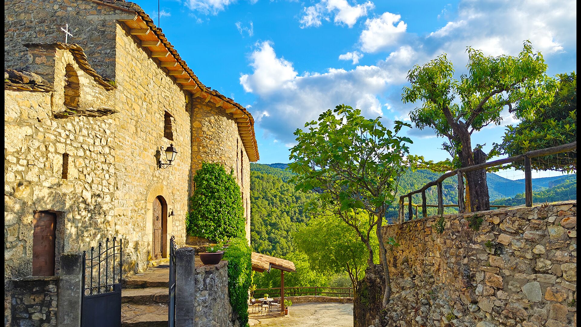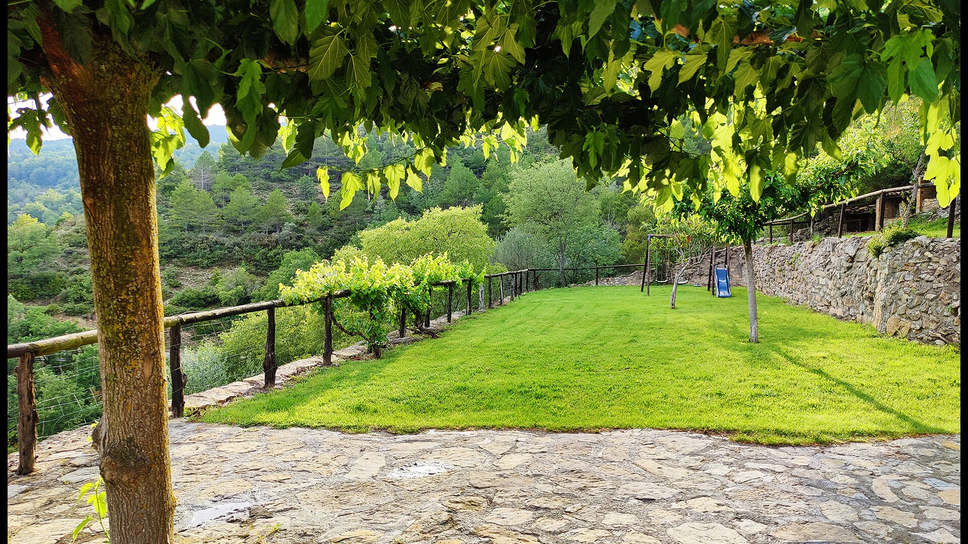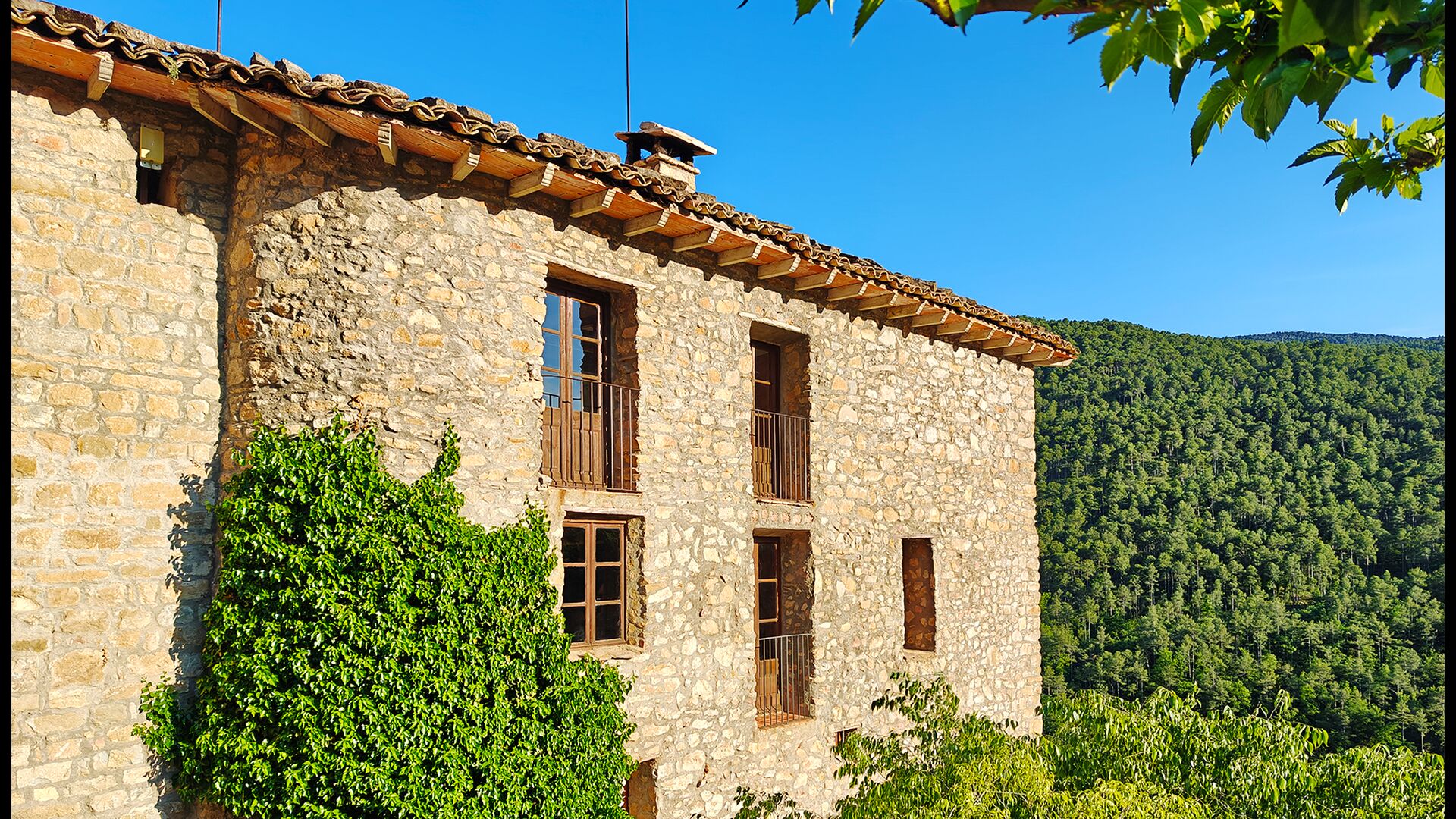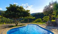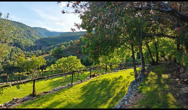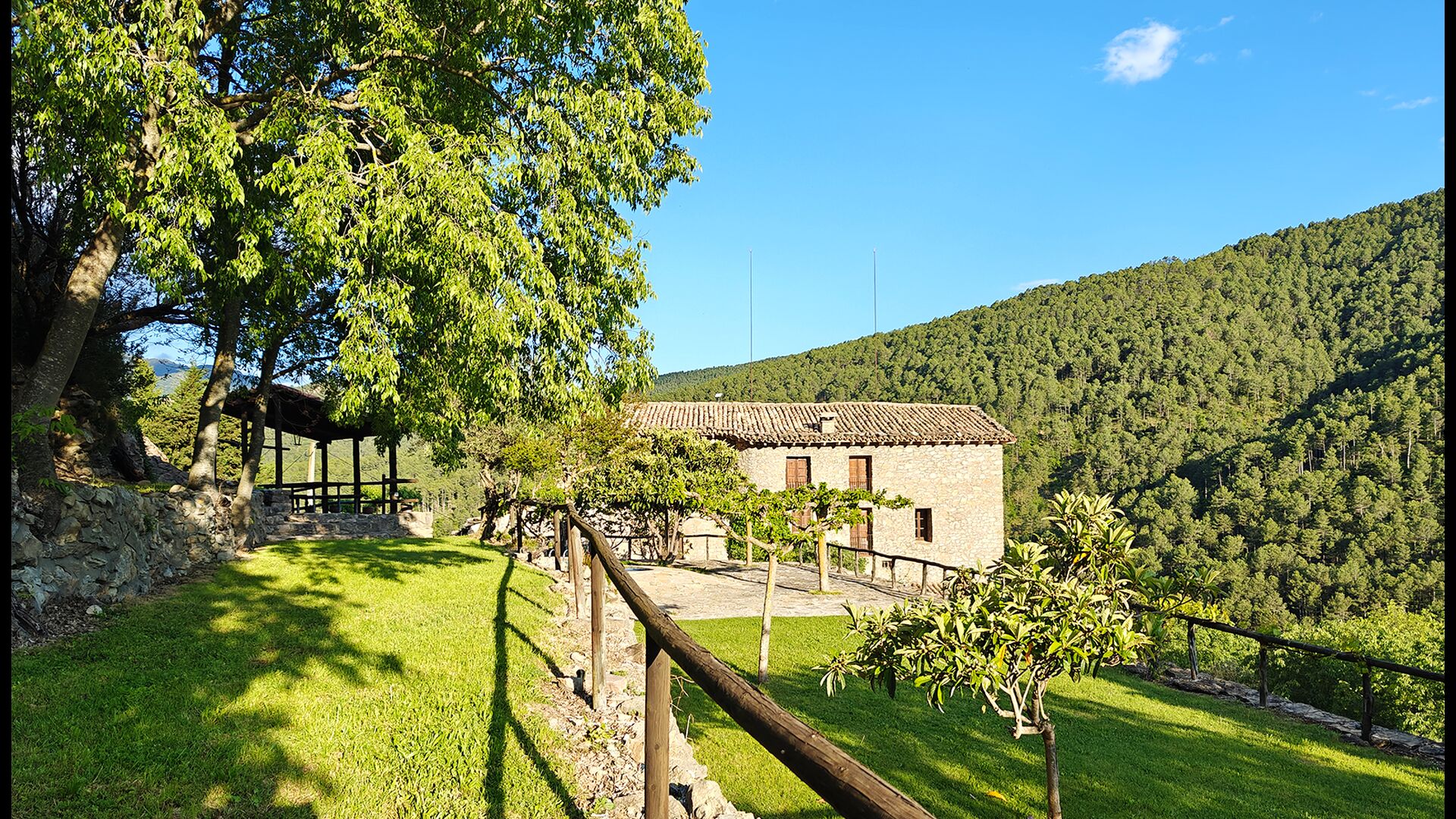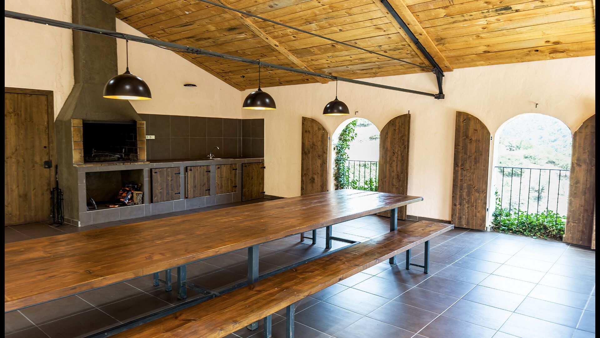 La terrassa coberta és un dels espais més encantadors de la casa, perfecte per esmorzar o relaxar-se mentre s’escolta el proper torrent de Valldarques.