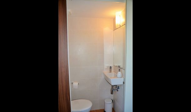 The lower floor has the common area in two parts. One part for dining with a cosy, very big round dining table, and ensuite the sitting room with different beautiful sitting chairs and a TV. In connection, the functional and fully equipped kitchen. Also, there are two bedrooms and two bathrooms. One bedroom has 3 single beds, and the other is a double room, which has a very nice small conservatory in connection and direct outside access.