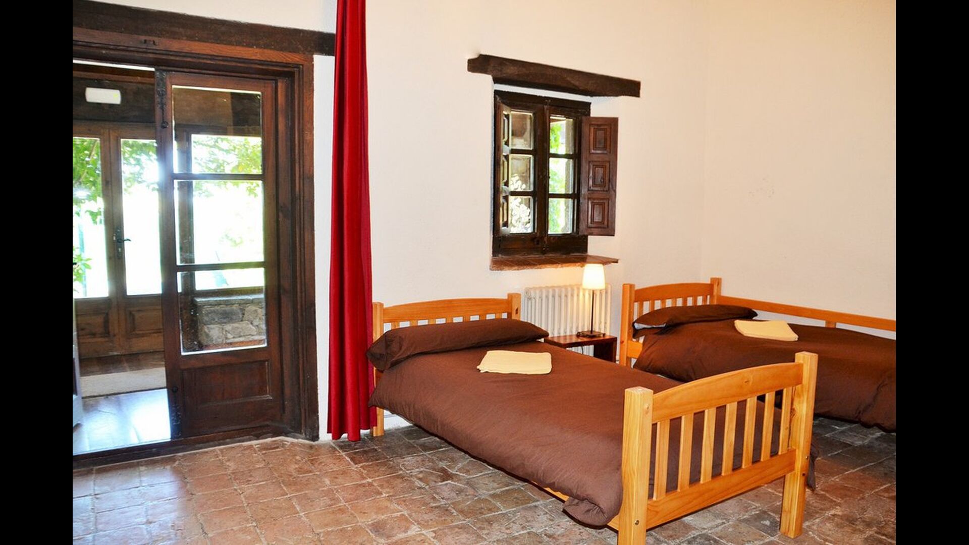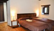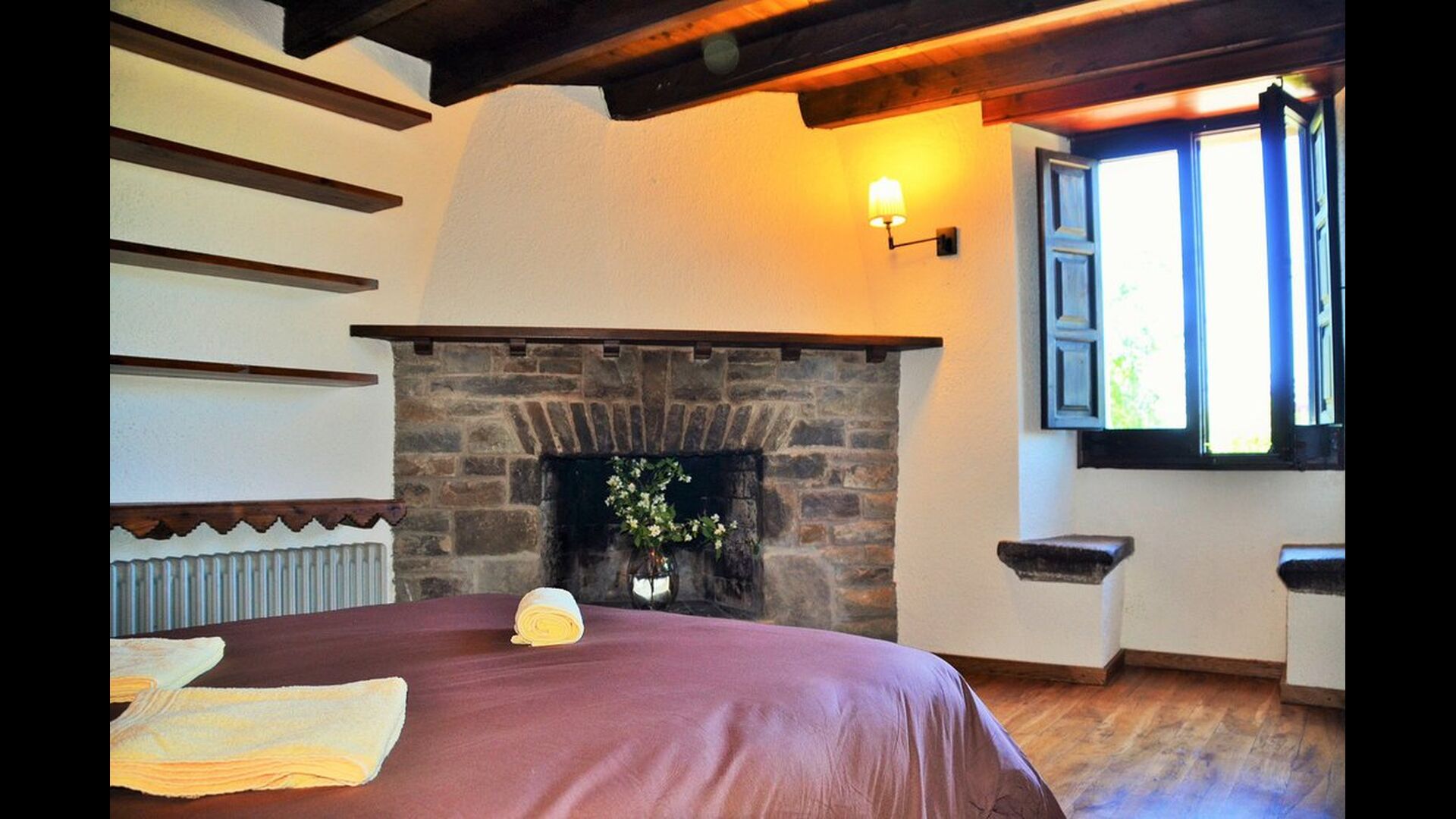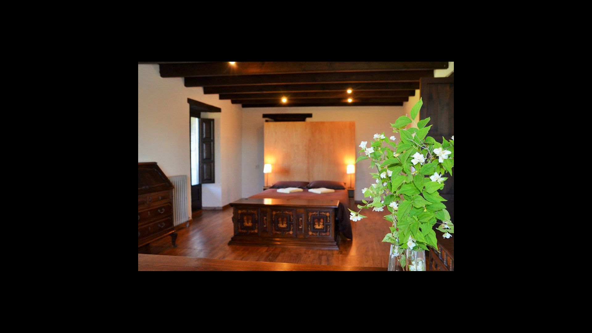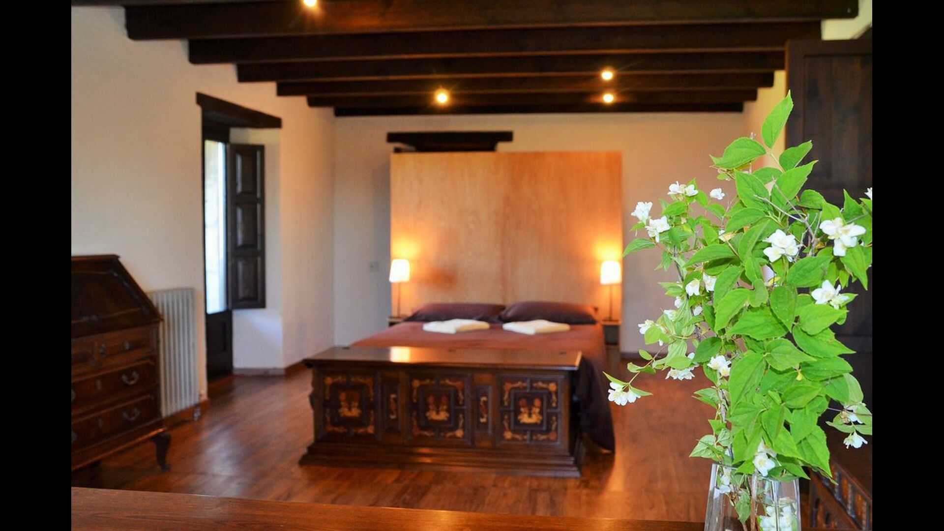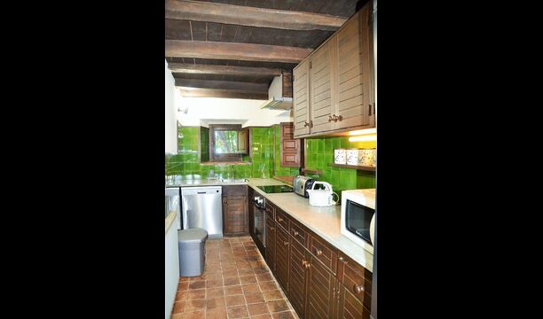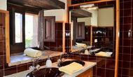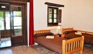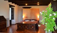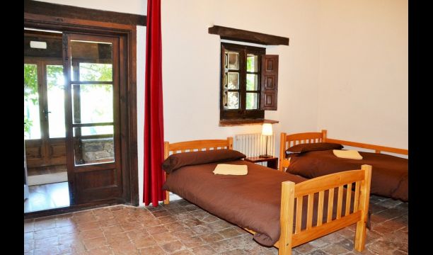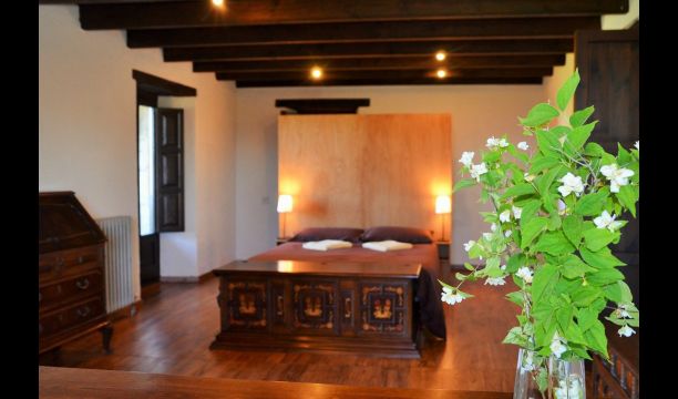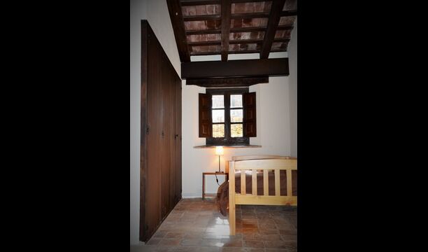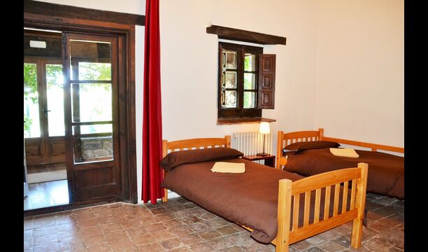 In the first floor, to the left, there is a very nice double bedroom, with some very beautiful details and garden view. Also, a small toilet has been installed. Then, there is the biggest bedroom, with a double bed and two balconies with view to the pool area and the mountains. The desk where many books have been formed is still there as a nice reminder of the history of the house. If necessary, here some extra beds (against supplement) will easily fit, if your group is bigger than 11. This bedroom has a bathroom ensuite. Finally, there is the third, spacious double room with bathroom ensuite.
