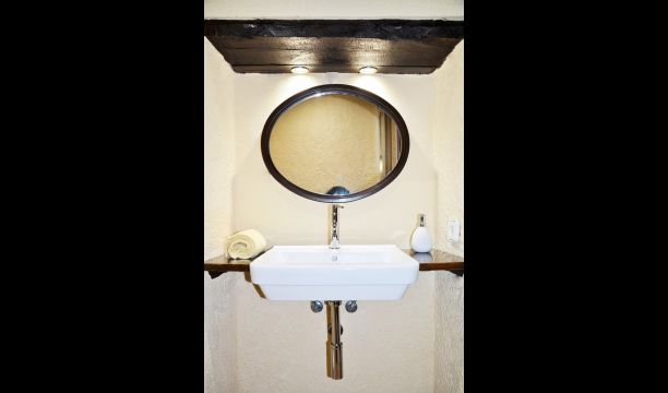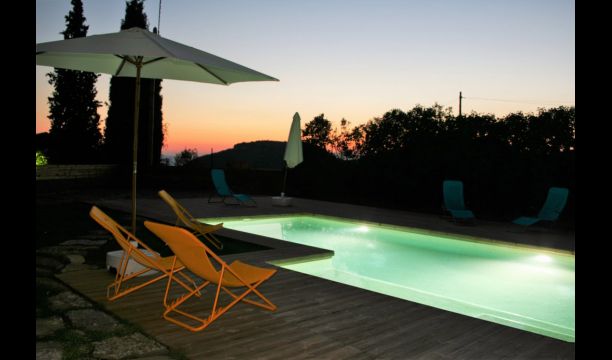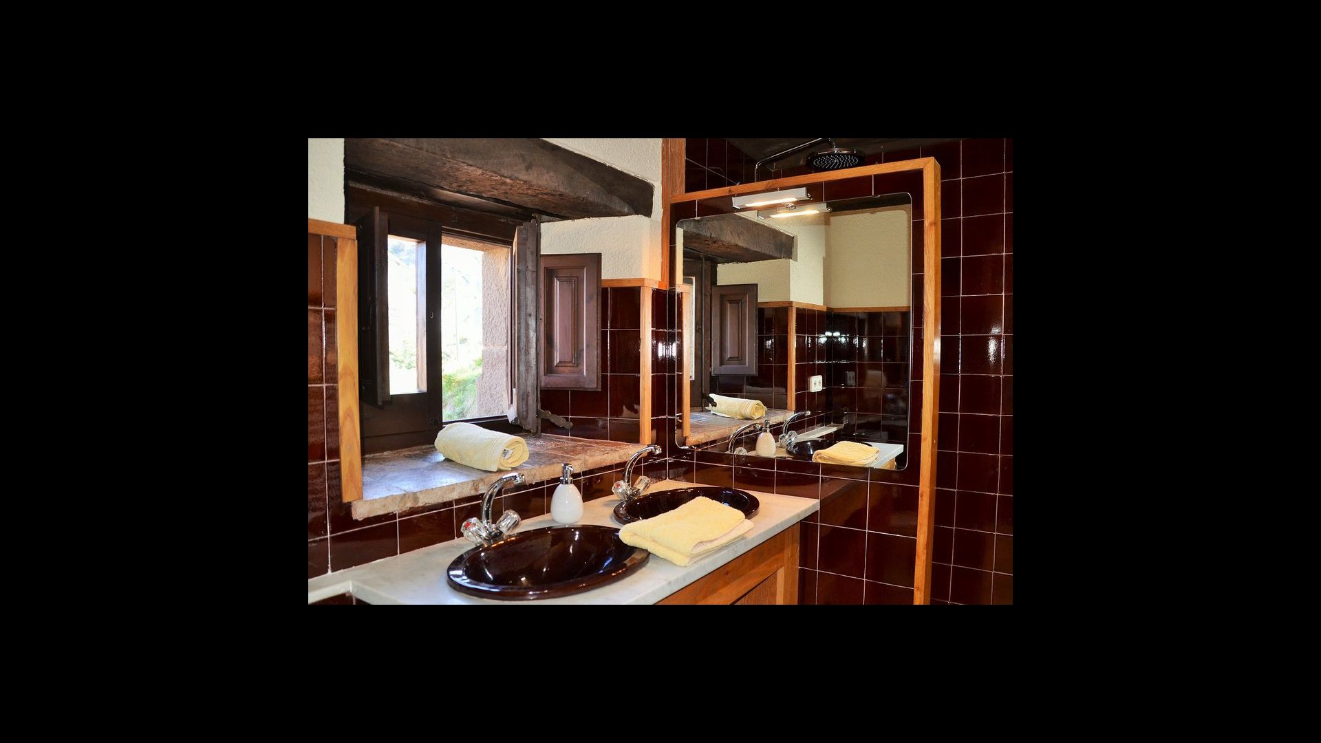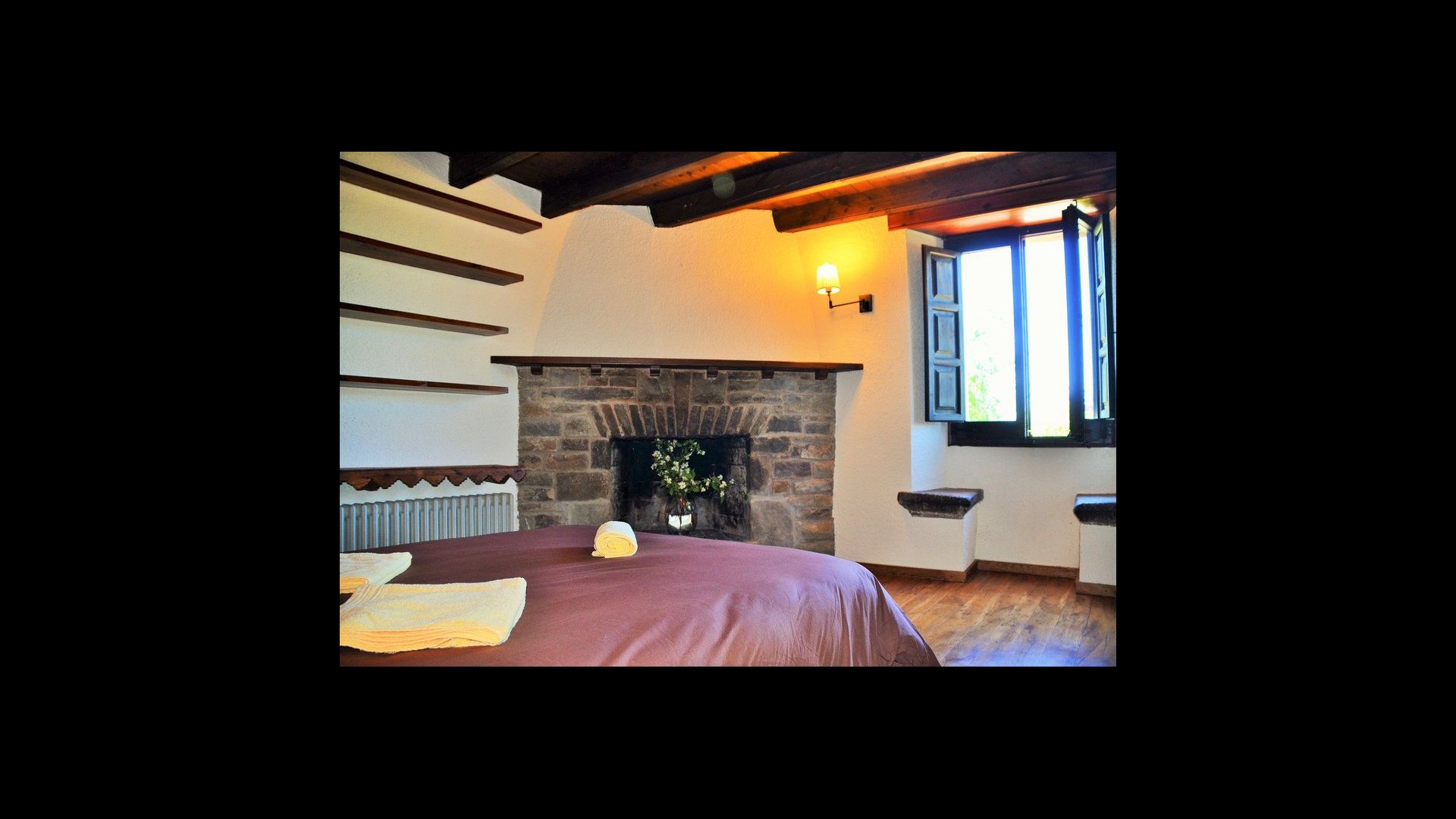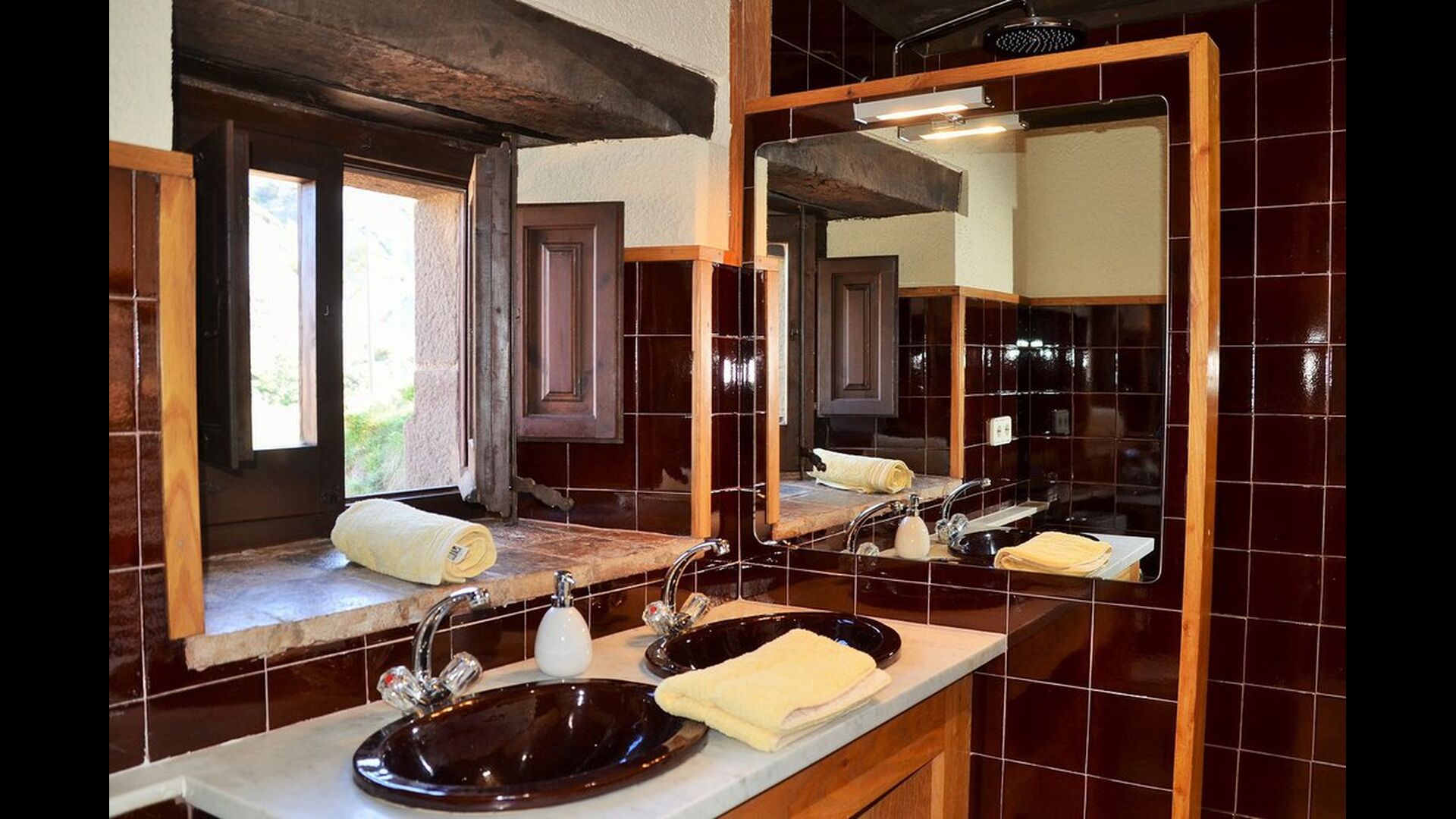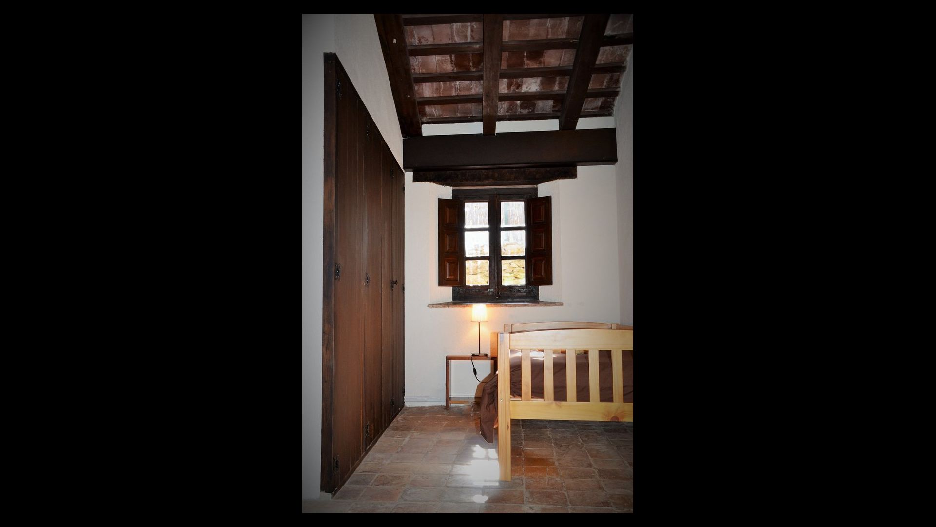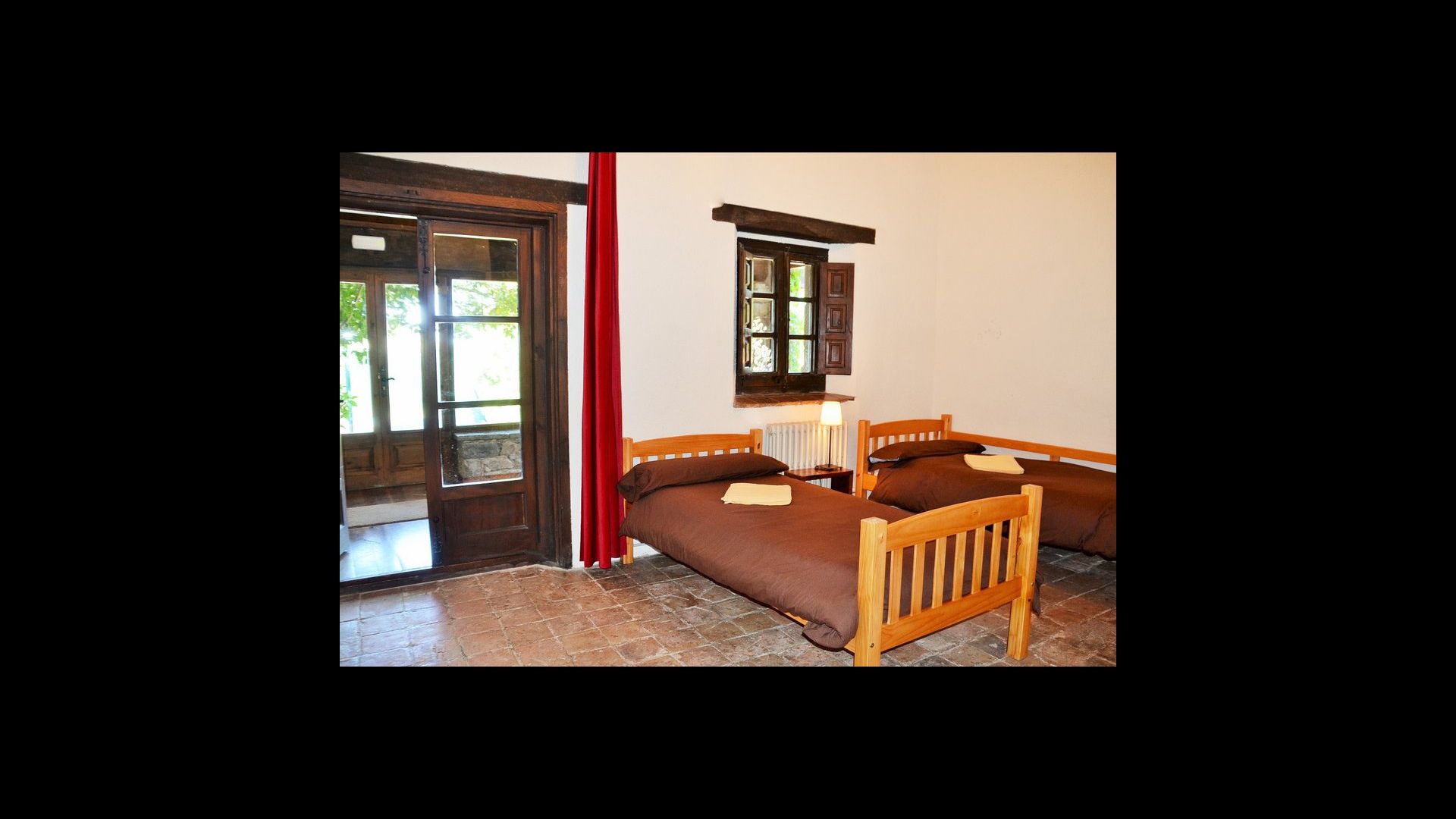 In the first floor, to the left, there is a very nice double bedroom, with some very beautiful details and garden view. Also, a small toilet has been installed. Then, there is the biggest bedroom, with a double bed and two balconies with view to the pool area and the mountains. The desk where many books have been formed is still there as a nice reminder of the history of the house. If necessary, here some extra beds (against supplement) will easily fit, if your group is bigger than 11. This bedroom has a bathroom ensuite. Finally, there is the third, spacious double room with bathroom ensuite.